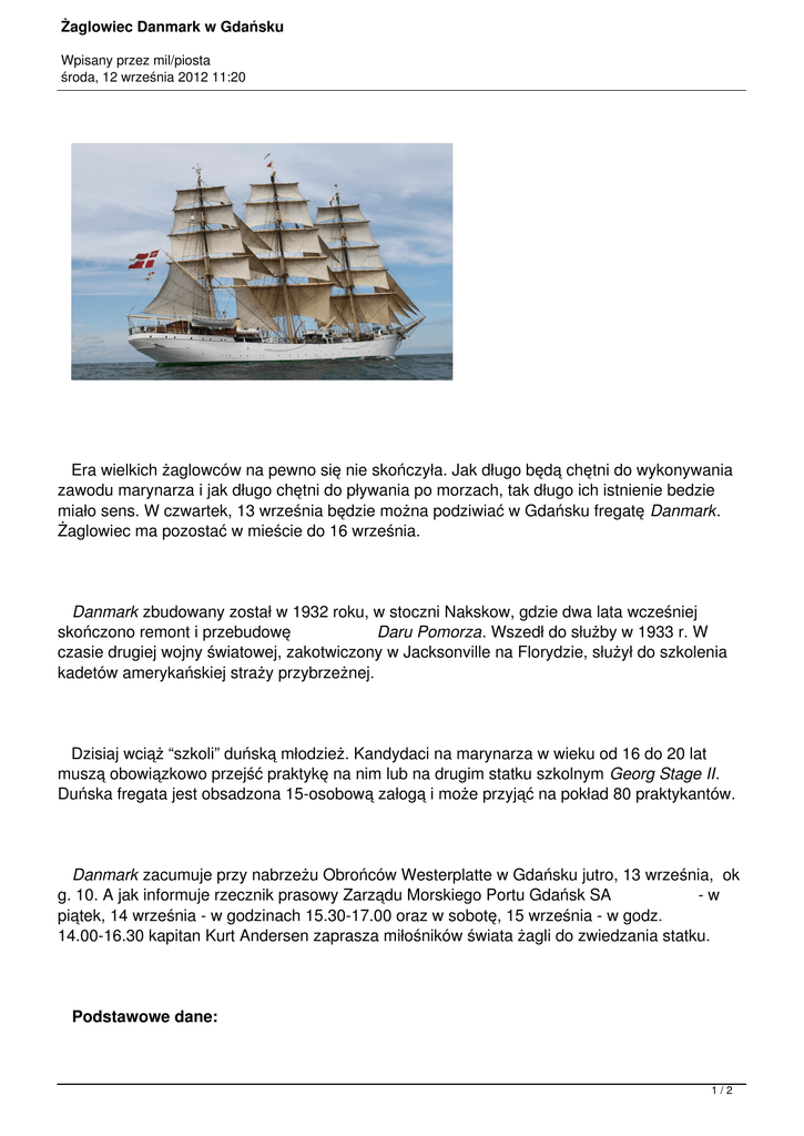 Żaglowiec Danmark w Gdańsku Wpisany przez mil/piosta środa, 12 września 2012 11:20 Era wielkich żaglowców na pewno się nie skończyła. Jak długo będą chętni do wykonywania zawodu marynarza i jak długo chętni do pływania po morzach, tak długo ich istnienie bedzie miało sens. W czwartek, 13 września będzie można podziwiać w Gdańsku fregatę Danmark. Żaglowiec ma pozostać w mieście do 16 września. Danmark zbudowany został w 1932 roku, w stoczni Nakskow, gdzie dwa lata wcześniej skończono remont i przebudowę Daru Pomorza. Wszedł do służby w 1933 r. W czasie drugiej wojny światowej, zakotwiczony w Jacksonville na Florydzie, służył do szkolenia kadetów amerykańskiej straży przybrzeżnej. Dzisiaj wciąż “szkoli” duńską młodzież. Kandydaci na marynarza w wieku od 16 do 20 lat muszą obowiązkowo przejść praktykę na nim lub na drugim statku szkolnym Georg Stage II. Duńska fregata jest obsadzona 15-osobową załogą i może przyjąć na pokład 80 praktykantów. Danmark zacumuje przy nabrzeżu Obrońców Westerplatte w Gdańsku jutro, 13 września, ok g. 10. A jak informuje rzecznik prasowy Zarządu Morskiego Portu Gdańsk SA -w piątek, 14 września - w godzinach 15.30-17.00 oraz w sobotę, 15 września - w godz. 14.00-16.30 kapitan Kurt Andersen zaprasza miłośników świata żagli do zwiedzania statku. Podstawowe dane: 1/2 Żaglowiec Danmark w Gdańsku Wpisany przez mil/piosta środa, 12 września 2012 11:20 rok budowy: 1932 typ fregata: trójmasztowa stocznia: Nakskov, Dania armator: Danish Maritime Authority port macierzysty: Kopenhaga długość: 77 m szerokość: 9,80 m zanurzenie max.:5,2 m pojemność: 790 BRT powierzchnia żagli: 1636 m2 silnik pomocniczy: 486 KM załoga: 15 osób załogi stałej + 80 praktykantów Fot. ze strony armatora 2/2