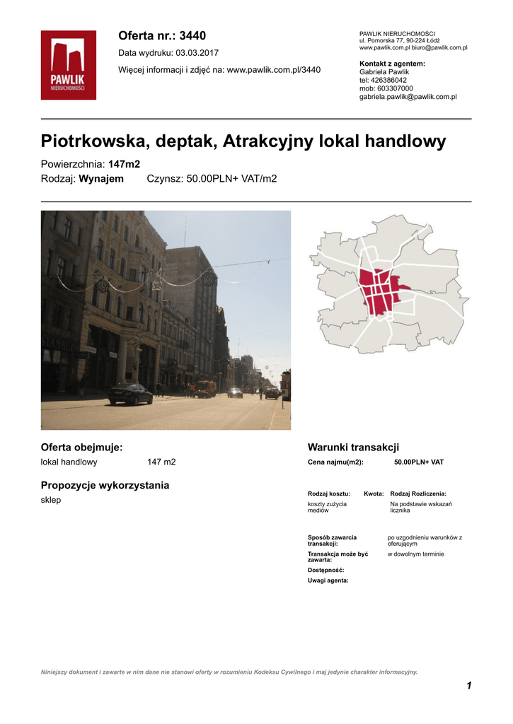 Oferta nr.: 3440 PAWLIK NIERUCHOMOŚCI ul. Pomorska 77, 90-224 Łódź www.pawlik.com.pl [email protected] Data wydruku: 03.03.2017 Więcej informacji i zdjęć na: www.pawlik.com.pl/3440 Kontakt z agentem: Gabriela Pawlik tel: 426386042 mob: 603307000 [email protected] Piotrkowska, deptak, Atrakcyjny lokal handlowy Powierzchnia: 147m2 Rodzaj: Wynajem Czynsz: 50.00PLN+ VAT/m2 Oferta obejmuje: lokal handlowy Warunki transakcji 147 m2 Propozycje wykorzystania sklep Cena najmu(m2): Rodzaj kosztu: 50.00PLN+ VAT Kwota: koszty zużycia mediów Rodzaj Rozliczenia: Na podstawie wskazań licznika Sposób zawarcia transakcji: po uzgodnieniu warunków z oferującym Transakcja może być zawarta: w dowolnym terminie Dostępność: Uwagi agenta: Niniejszy dokument i zawarte w nim dane nie stanowi oferty w rozumieniu Kodeksu Cywilnego i maj jedynie charakter informacyjny. 1 Oferta nr.: 3440 Więcej informacji i zdjęć na: www.pawlik.com.pl/3440 Opis oferty Atrakcyjny lokal na ulicy Piotrkowskiej (FRONT) na odcinku między Andrzeja Struga a Roosevelta/Nawrot. Lokal po renomowanym salonie telefonii komórkowej. Cała frontowa ściana jest przeszklona. Lokal z możliwością rozpoczęcia działalności bądź do modernicacji. Obecnie prowadzona jest działalność handlowa. GORĄCO POLECAM. Oferta obejmuje lokal handlowy Klasa obiektu: Powierzchnia: 147 m2 Kondygnacja: Parter z 4 kond. Stan techniczny: bardzo dobry Rodzaje powierzchni użytkowych Kondygnacja Rodzaj powierzchni Powierzchnia Liczba pomieszczeń Parter handlowy 147.00 m2 1 Kondygnacja Charakter powierzchni Powierzchnia Podłoga Ściana Sufit Okna Parter handlowy 147.00 m2 płyta karton-gips podwieszany witryny Standard terakota Stan techniczny Budynek Rok budowy Opis techniczny Konstrukcja budynku: oparta na ścianach nośnych Strop: Kondygnacja Rodzaj powierzchni Powierzchnia Parter handlowy 147.00 m2 Wysokość Dostęp Wyposażenie Wejście dla osób Bezpieczeństwo Witryna Alarm Dostęp do lokalu z ulicy Siatka słupów Strop Teleinformatyka Telefon Sieć komputerowa Internet Ogrzewanie/klimatyzacja Ogrzewanie Niniejszy dokument i zawarte w nim dane nie stanowi oferty w rozumieniu Kodeksu Cywilnego i maj jedynie charakter informacyjny. 2 Oferta nr.: 3440 Więcej informacji i zdjęć na: www.pawlik.com.pl/3440 Media Toaleta Położenie w lokalu Sąsiedztwo Kamieniece, lokale Przyłącza elektryczne handlowe, Urząd Miasta Instalacja elektryczna Łodzi Instalacja siłowa Lokalizacja handlowa ruch pieszy Przyłącze wodne Położenie budynku Centrum Instalacja wodno-kanalizacyjna Rodzaj budynku kamienica8 ZDJĘCIA OFERTY Niniejszy dokument i zawarte w nim dane nie stanowi oferty w rozumieniu Kodeksu Cywilnego i maj jedynie charakter informacyjny. 3
