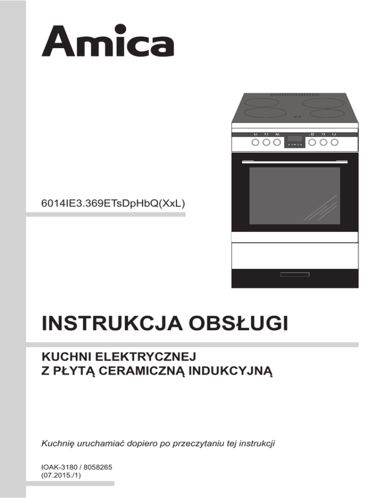 O C 6014IE3.369ETsDpHbQ(XxL) INSTRUKCJA OBSŁUGI KUCHNI ELEKTRYCZNEJ Z PŁYTĄ CERAMICZNĄ INDUKCYJNĄ Kuchnię uruchamiać dopiero po przeczytaniu tej instrukcji IOAK-3180 / 8058265 (07.2015./1) SZANOWNY KLIENCIE, Kuchnia Amica to połączenie wyjątkowej łatwości obsługi i doskonałej efektywności. Po prze czytaniu instrukcji, obsługa kuchni nie będzie problemem. Kuchnia, która opuściła fabrykę była dokładnie sprawdzona przed zapakowaniem pod względem bezpieczeństwa i funkcjonalności na stanowiskach kontrolnych. Prosimy Państwa o uważną lekturę instrukcji obsługi przed uruchomieniem urządzenia. Przestrzeganie zawartych w niej wskazówek uchroni Państwa przed niewłaściwym użytko waniem. Instrukcję należy zachować i przechowywać tak, aby mieć ją zawsze pod ręką. Należy dokładnie przestrzegać instrukcji obsługi w celu uniknięcia nieszczęśliwych wypadków. Uwaga! Kuchnię obsługiwać tylko po zapoznaniu się z niniejszą instrukcją. Kuchnia przeznaczona jest wyłącznie do użytku domowego. Producent zastrzega sobie możliwość dokonywania zmian niewpływających na dzia łanie urządzenia. Masz wątpliwości? Nie wszystko, co przeczytałeś w instrukcji jest zrozumiałe zadzwoń do Centrum Serwisowego, gdzie uzyskasz wszechstronną pomoc. tel. 801 801 800 2 SPIS TREŚCI Podstawowe informacje.......................................................................................2 Wskazówki dotyczące bezpieczeństwa użytkowania...............................................4 Jak oszczędzać energię..........................................................................................6 Wycofanie z eksploatacji.........................................................................................7 Opis wyrobu..........................................................................................................9 Charakterystyka wyrobu......................................................................................10 Instalacja................................................................................................................12 Ustawienie kuchni...................................................................................................12 Przyłączenie kuchni do instalacji elektrycznej.........................................................13 Wskazówki dla instalatora.......................................................................................13 Obsługa................................................................................................................15 Przed pierwszym włączeniem kuchni....................................................................15 Obsługa płyty grzejnej..........................................................................19 Funkcje piekarnika i jego obsługa.........................................................................27 Pieczenie w piekarniku-porady praktyczne......................................................30 Czyszczenie i konserwacja kuchni....................................................................32 Postępowanie w sytuacjach awaryjnych..........................................................38 Dane techniczne..................................................................................................40 Gwarancja, obsługa posprzedażna...................................................................41 3 WSKAZÓWKI DOTYCZĄCE BEZPIECZEŃSTWA UŻYTKOWANIA Uwaga.Urządzenie i jego dostępne części stają się gorące podczas użycia. Możliwość dotknięcia elementów grzejnych powinno być objęte szczególną troską. Dzieci poniżej 8 roku życia powinny trzymać się z daleka, chyba że są pod stałą opieką. Niniejszy sprzęt może być używany przez dzieci w wieku od 8 lat i wyżej i osoby z ograniczeniami fizycznymi, czuciowymi albo umysłowymi albo brakiem doświadczenia i wiedzy, jeśli odbywa się pod nadzorem lub zgodnie z instrukcją użytkowania sprzętu, przekazanej przez osoby odpowiadające za ich bezpieczeństwo. Należy zwracać uwagę na dzieci, aby nie bawiły się sprzętem. Sprzątanie i czynności obsługowe nie powinny być robione przez dzieci bez nadzoru. Uwaga. Gotowanie bez nadzoru tłuszczu lub oleju na płycie kuchennej może być niebezpieczne i doprowadzić do pożaru. NIGDY nie próbuj gasić ognia wodą, ale wyłącz urządzenie i wtedy przykryj płomień np. pokrywką lub niepalnym kocem. Uwaga. Niebezpieczeństwo pożaru: nie gromadź rzeczy na powierzchni do gotowania. Uwaga. Jeżeli powierzchnia płyty jest pęknięta, wyłączyć prąd, aby uniknąć porażenia prądem elektrycznym. Przedmiotów metalowych, takich jak noże, widelce, łyżki i pokrywki oraz folii aluminiowej nie zaleca się kłaść na powierzchni płyty kuchennej, gdyż mogą się one stać gorące. 4 WSKAZÓWKI DOTYCZĄCE BEZPIECZEŃSTWA UŻYTKOWANIA Po użyciu wyłącz element grzejny płyty wyłącznikiem i nie polegaj na wskazaniach detektora naczyń. Podczas użytkowania sprzęt staje się gorący. Zaleca się zachowanie ostrożności, aby unikać dotykania gorących elementów wewnątrz piekarnika. Dostępne części mogą stać się gorące podczas użytkowania. Zaleca się trzymanie małych dzieci z dala od urządzenia. Uwaga. Nie używać szorstkich środków czyszczących lub ostrych metalowych przedmiotów do czyszczenia szkła drzwi, gdyż mogą porysować powierzchnię, co może doprowadzić do popękania szkła. Uwaga. Aby uniknąć możliwości porażenia prądem elektrycznym, przed wymianą lampki należy upewnić się, czy sprzęt jest wyłączony. Do czyszczenia kuchni nie wolno używać sprzętu do czyszczenia parą. Niebezpieczeństwo poparzenia! Podczas otwierania drzwi piekarnika może wydostawać się gorąca para. W trakcie lub po zakończeniu gotowania należy ostrożnie otwierać drzwi piekarnika. Przy otwieraniu nie nachylać się nad drzwiami. Należy pamiętać, że para w zależności