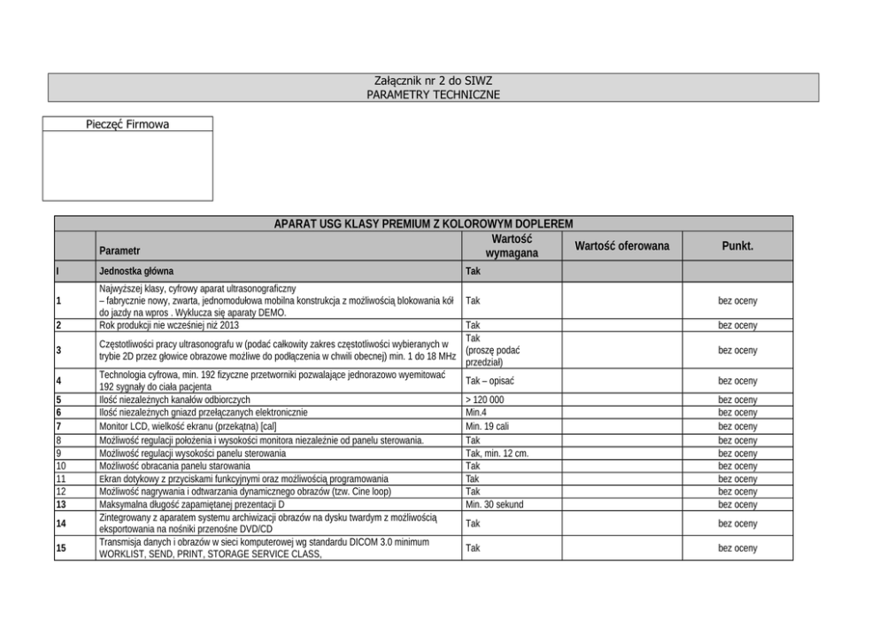 Załącznik nr 2 do SIWZ PARAMETRY TECHNICZNE Pieczęć Firmowa Parametr I 1 2 3 4 5 6 7 8 9 10 11 12 13 14 15 APARAT USG KLASY PREMIUM Z KOLOROWYM DOPLEREM Wartość Wartość oferowana wymagana Jednostka główna Najwyższej klasy, cyfrowy aparat ultrasonograficzny – fabrycznie nowy, zwarta, jednomodułowa mobilna konstrukcja z możliwością blokowania kół do jazdy na wpros . Wyklucza się aparaty DEMO. Rok produkcji nie wcześniej niż 2013 Punkt. Tak Tak Tak Tak Częstotliwości pracy ultrasonografu w (podać całkowity zakres częstotliwości wybieranych w (proszę podać trybie 2D przez głowice obrazowe możliwe do podłączenia w chwili obecnej) min. 1 do 18 MHz przedział) Technologia cyfrowa, min. 192 fizyczne przetworniki pozwalające jednorazowo wyemitować Tak – opisać 192 sygnały do ciała pacjenta Ilość niezależnych kanałów odbiorczych > 120 000 Ilość niezależnych gniazd przełączanych elektronicznie Min.4 Monitor LCD, wielkość ekranu (przekątna) [cal] Min. 19 cali Możliwość regulacji położenia i wysokości monitora niezależnie od panelu sterowania. Tak Możliwość regulacji wysokości panelu sterowania Tak, min. 12 cm. Możliwość obracania panelu starowania Tak Ekran dotykowy z przyciskami funkcyjnymi oraz możliwością programowania Tak Możliwość nagrywania i odtwarzania dynamicznego obrazów (tzw. Cine loop) Tak Maksymalna długość zapamiętanej prezentacji D Min. 30 sekund Zintegrowany z aparatem systemu archiwizacji obrazów na dysku twardym z możliwością Tak eksportowania na nośniki przenośne DVD/CD Transmisja danych i obrazów w sieci komputerowej wg standardu DICOM 3.0 minimum Tak WORKLIST, SEND, PRINT, STORAGE SERVICE CLASS, bez oceny bez oceny bez oceny bez oceny bez oceny bez oceny bez oceny bez oceny bez oceny bez oceny bez oceny bez oceny bez oceny bez oceny bez oceny 16 17 18 Min. 500 GB Min. 200 Podać typ i producenta bez oceny bez oceny bez oceny Tak, opisać bez oceny 20 II Zintegrowany dysk twardy HDD Nastawy programowane dla aplikacji i głowic oferowanych, tzw. „presety” Drukarka termiczna (video) czarno – biała Tryb przeglądania umożliwiający przenoszenie zarchiwizowanych danych obrazowych pacjenta do aparatu USG (poprzez zewnętrzny dysk twardy HDD, pamięć typu flash USB, płyta CD/DVD, sieć PACS) Przełącznik nożny z możliwością programowania dostępnych operacji Tryb 2D (B-mode) 1 Maksymalna głębokość penetracji [cm] Min. 38 cm 2 3 4 5 Zakres bezstratnego powiększania obrazu rzeczywistego. Zakres bezstratnego powiększania obrazu zamrożonego, a także obrazu z pamięci CINE. Zakres dynamiki systemu [dB] Częstotliwość odświeżania w trybie B-Mode Zastosowanie technologii optymalizującej obraz w trybie B-mode w czasie rzeczywistym na poziomie preprocessingu. Zastosowanie technologii obrazowania „nakładanego” przestrzennego wielokierunkowego (compounding) z możliwością wyboru powyżej 8 ustawień sterowania liniami obrazowymi. Zastosowanie technologii wzmacniającej kontrastowość granic tkanek Optymalizacja obrazu 2D w zależności od badanej struktury: tkanka tłuszczowa – tkanka gruczołowa (w zależności od prędkości rozchodzenia się fali ultradźwiękowej w badanej tkance). Tryb M Tryb spektralny Doppler Pulsacyjny (PWD) Podać minimalny zakres pomiarowy prędkości przepływu [cm/s] Podać maksymalną mierzoną prędkość przepływu [cm/s] dla zerowego kąta Podać wielkość bramki Dopplerowskiej [cm] Podać kąt korekcji kąta bramki Dopplerowskiej [mm] Zastosowanie technologii optymalizującej spektrum w czasie rzeczywistym. Możliwość przesunięcia linii bazowej po zatrzymaniu obrazu Tryb TRIPLEX z rejestrowaną prędkością przepływu [ cm/s] dla zerowego kąta Tryb Doppler Kolorowy (CD) Regulacji uchylności pola Dopplera Kolorowego Podać minimalny zakres pomiarowy prędkości przepływu [cm/s] Podać maksymalną mierzoną prędkość przepływu [cm/s] Tryb angiologiczny (Doppler mocy) Min. 20 x Min. 20 x Min. 210 dB Min. 450 klatek/s 19 6 7 8 9 III IV 1 2 3 4 5 6 7 V 1 2 3 VI VII Zastosowanie technologii obrazowania rozróżniającego zwłóknienie tkanek (umożliwiające jakościową ocenę stanu wątroby) Tak Tak bez oceny bez oceny >38 cm - 2 pkt. Wartość wymagana - 0 pkt. bez oceny bez oceny bez oceny bez oceny Tak, opisać bez oceny Tak, opisać bez oceny Tak, opisać bez oceny Tak, opisać bez oceny Tak Tak Max. 0,6 cm/s Min. 1600 cm/s Min. od 0,1 cm – 2 cm Min. 0 - +/- 80° Tak – opisać Tak Min. 1200 cm/s Tak Min 30 st. dla Max. 0,6 cm/s Min. 380 cm/s Tak bez oceny bez oceny bez oceny bez oceny bez oceny bez oceny bez oceny bez oceny bez oceny bez oceny bez oceny bez oceny bez oceny Tak IX Pokazywanie rejonów o różnym stopniu zwłóknienia kodowane za pomocą kolorów określających stopień zwłóknienia czy stłuszczenia danego rejonu. Obrazowanie harmoniczne Obrazowanie harmoniczne na wszystkich zaoferowanych głowicach Wykorzystanie techniki inwersji fazy Nowszej generacji obrazowanie harmoniczne inne niż opisane wyżej, np.: Obrazowanie Harmoniczne kodowane, itp Oprogramowanie pomiarowe wraz z pakietem obliczeniowym 1 Oprogramowanie aplikacyjne i pomiarowe 2 3 5 Liczba par kursorów pomiarowych Pakiet obliczeń automatycznych dla Dopplera (automatyczny obrys spektrum) Automatyczny obrys spektrum Dopplera w czasie rzeczywistym oraz na obrazie zamrożonym wraz z pakietem obliczeniowym Oprogramowanie do automatycznego pomiaru oraz analizy kompleksu Intima Media X Głowica convex wieloczęstotliwościowa do badań ogólnobrzusznych. 1 2 3 4 5 6 Wybierane częstotliwości pracy przetwornika [MHz] Wymienić częstotliwości pracy dla poszczególnych trybów pracy [MHz] Kąt pola skanowania (widzenia) [stopnie] Liczba elementów Praca w trybie II harmonicznej Praca w trybie elastografii XI Głowica endocavity wieloczęstotliwościowa do badań ginekologiczno-położniczych 1 2 3 4 5 6 Wybierane częstotliwości pracy przetwornika [MH
