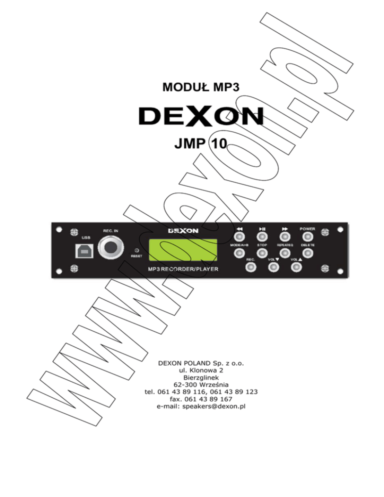 MODUŁ MP3 JMP 10 DEXON POLAND Sp. z o.o. ul. Klonowa 2 Bierzglinek 62-300 Września tel. 061 43 89 116, 061 43 89 123 fax. 061 43 89 167 e-mail: [email protected] JMP 10 - moduł MP3 Środki ostrożności Prosimy o uważne zapoznanie się z treścią tej instrukcji przed podłączeniem urządzenia. Postępowanie zgodnie z podanymi zasadami umożliwi pełne wykorzystanie jego zalet oraz zapewni długotrwałą eksploatację. Szczególnie istotne jest przestrzeganie zasad bezpiecznego użytkowania. 1 Zasady bezpiecznego użytkowania: • JMP10 to urządzenia wymagające wmontowania do odpowiedniej wnęki w centrali lub obudowie przystosowanej do ich montażu, • naprawy oraz wszelkie manipulacje wewnątrz urządzenia mogą być wykonywane wyłącznie przez pracowników serwisu, • nie wolno wkładać jakichkolwiek przedmiotów do wnętrza urządzenia, • w przypadku awarii należy odłączyć urządzenie i wymontować z obudowy, • nie należy używać urządzenia w pomieszczeniach o dużej wilgotności, • należy instalować z dala od źródeł pól magnetycznych, • nie należy ustawiać centrali blisko źródeł ciepła, • należy zapewnić warunki wentylacji, • nie wolno zdejmować obudowy bez uprzedniego odłączenia zasilania 2 1. Opis ogólny Moduł JMP 10 jest kolejnym elementem do zabudowy w centralach nagłośnieniowych Jedia. Jest to całkowicie niezawodne źródło dźwięku /nie zawiera elementów mechanicznych/ do stosowania przy nagłośnieniu obiektów. Łatwe nagrywanie muzyki, komunikatów oraz możliwość kopiowania plików MP3 z komputera. Możliwość montażu dodatkowej karty pamięci o pojemności do 512 MB co umożliwi odtwarzanie dźwięku przez około 100 godzin (32 kb/s) lub 36 godzin (128 kb/s). - interfejs USB dla transferu plików między PC i modułem - pojemność pamięci wbudowanej 64MB - czas zapisu: 68 minut (128 KHz), 108 minuty (80 KHz), 272 minuty (32 KHz) /na pamięci wewnętrznej - wbudowanej/ - wejście liniowe do nagrania ze źródła dźwięku np. CD - funkcje: powtórzenia, EQ, wyciszanie, zapis A->B, kasowanie - wysokiej jakości pamięć umożliwiająca 1000k cykli kasowania 2 JMP 10 - moduł MP3 2. Specyfikacja - możliwość montażu karty compact flash CF 8 - 512 MB - format nagrania: MP3 koder/dekoder i ADPCM - wybór jakości: Mp3:128 kHz, 80 kHz, 32 kHz ADPCM: 8 kHz - gniazdo wejściowe: USB - gniazdo do nagrywania: liniowe - Jack 6,3mm, mikrofonowe - Jack 3,5 mm - wszystkie funkcje klasycznego CD: play, stop, pauza, przeszukiwanie utworu - stereofoniczny - zaprogramowany equalizer: pop / classic / rock / jazz - pasmo przenoszenia: 20 Hz - 14 kHz - zasilanie 8 - 12 V DC, 170 mA - wymiary: 195 x 40 x 130 mm - waga: 590 g 3. Montaż modułu w centralach JEIL. 1. Odłączyć zasilanie, następnie odkręcić 4 wkręty mocujące zaślepkę w centrali. 2. Wyjąć zaślepkę i przyklejony do niej przewód podłączyć do przewodu będącego w komplecie z modułem. Przewód ten jest zakończony podwójnym i potrójnym gniazdem. Należy je podłączyć do styków pokazanych na rysunku poniżej. konektory do podłączenia central JEIL JPA, MOBILE otwory do mocowania gniazdo do pamięci compact flash CF wyprowadzone przewody do podłączenia modułu w innych urządzeniach wyjście stereo, zasilanie 3. Włożyć moduł do centrali i przykręcić 4 wkrętami. 3 JMP 10 - moduł MP3 4. Montaż karty CF 1. Na rysunku wskazane miejsce służy do montażu karty compact flash CF o maksymalnej pojemności 512 MB. 2. Wyjęcie karty umożliwia czarny przycisk. 5. Montaż modułu w innych urządzeniach. 1. Przewód: - Zielony - wejście stereo - czerwony - kanał prawy - biały - kanał lewy - czarny - masa - Niebieski - wyjście stereo: - czerwony - kanał prawy - biały - kanał lewy - czarny - masa - Czarny - zasilanie - z nadrukiem + 12 V - bez nadruku - masa 6. Instalacja sterowników. 1. W komplecie znajdują się sterowniki na CD do instalacji w systemach Windows 9x, można je również wykorzystać dla innych wersji Windows, np. XP. 2. Uruchomić program w9xdriver.exe z CD. 3. Wybrać język instalacji. Zostanie zainstalowany sterownik Accfastmp3. 4. Następnie podłączyć moduł JMP 10 za pomocą kabla USB do komputera i włączyć zasilanie modułu. 5. Zrestartować komputer. 6. Od tego momentu podłączony moduł jest ”widziany” przez komputer jako dwa dyski wymienne. Jeden dysk odpowiada pamięci wewnętrznej, drugi karcie pamięci CF. Pliki MP3 można kopiować bezpośrednio do wybranego dysku. Pojemność dysku - pamięci wewnętrznej 64 MB oraz na karcie CF zależne od pojemności karty max. 512 MB. 7. Po skopiowaniu plików do modułu można odłączyć przewód USB. 8. Istnieje również możliwość skopiowania pliku z modułu do komputera. Np. po nagraniu komunikatu na moduł za pomocą mikrofonu skopiować go do komputera. 4 JMP 10 - moduł MP3 7. Obsługa modułu. Uruchomienie. Nacisnąć i przytrzymać przez 2 sekundy przycisk ”POWER”. Podłączyć przewód USB do modułu i komputera i wgrać pliki. W przypadku gdy nie ma karty CF należy wgrać na pamięć wewnętrzną wtedy na wyświetlaczu będzie napis ”MEM”. Jeśli jest karta CF wtedy urządzenie będzie korzystało z niej i na wyświetlaczu będzie napis: ”CF”. Możliwy jest zapis w formacie MP3 i ADPCM. W zależności od wybranego formatu na wyświetlaczu będzie napis ”Mp3” dla formatu MP3 lub ”VOC” dla formatu ADPCM klasycznego niezakodowanego formatu. uruchamia odtwarzanie. Przejście do kolejnego utworu umożliwiają przyciski i Przycisk , przewijanie i , które należy nacisnąć i przytrzymać, przycisk - pauza, a zatrzymanie odtwarzania przyciskiem STOP. Wyświetlacz pokazuje czas utworu, informacje o wyborze pamięci MEM/CF, oraz o typie Mp3/Voc. Głośność reguluje się za pomocą przycisków VOL i VOL . Powtarzanie. Krótkie naciśnięcie przycisku REPEAT/EQ umożliwia przejście do funkcji powtarzania: bez powtarzania, powtarzanie j