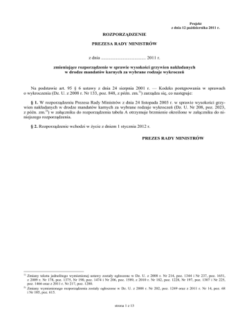 Projekt z dnia 12 października 2011 r. ROZPORZĄDZENIE PREZESA RADY MINISTRÓW z dnia ....................................... 2011 r. zmieniające rozporządzenie w sprawie wysokości grzywien nakładanych w drodze mandatów karnych za wybrane rodzaje wykroczeń Na podstawie art. 95 § 6 ustawy z dnia 24 sierpnia 2001 r. — Kodeks postępowania w sprawach o wykroczenia (Dz. U. z 2008 r. Nr 133, poz. 848, z późn. zm.1)) zarządza się, co następuje: § 1. W rozporządzeniu Prezesa Rady Ministrów z dnia 24 listopada 2003 r. w sprawie wysokości grzywien nakładanych w drodze mandatów karnych za wybrane rodzaje wykroczeń (Dz. U. Nr 208, poz. 2023, z późn. zm.2)) w załączniku do rozporządzenia tabela A otrzymuje brzmienie określone w załączniku do niniejszego rozporządzenia. § 2. Rozporządzenie wchodzi w życie z dniem 1 stycznia 2012 r. PREZES RADY MINISTRÓW 1) 2) Zmiany tekstu jednolitego wymienionej ustawy zostały ogłoszone w Dz. U. z 2008 r. Nr 214, poz. 1344 i Nr 237, poz. 1651, z 2009 r. Nr 178, poz. 1375, Nr 190, poz. 1474 i Nr 206, poz. 1589, z 2010 r. Nr 182, poz. 1228, Nr 197, poz. 1307 i Nr 225, poz. 1466 oraz z 2011 r. Nr 217, poz. 1280. Zmiany wymienionego rozporządzenia zostały ogłoszone w Dz. U. z 2008 r. Nr 202, poz. 1249 oraz z 2011 r. Nr 14, poz. 68 i Nr 105, poz. 615. strona 1 z 13 Załącznik do rozporządzenia Prezesa Rady Ministrów z dnia ……………………… 2011 r. (poz. …) WYSOKOŚĆ GRZYWIEN NAKŁADANYCH W DRODZE MANDATU KARNEGO ZA WYBRANE RODZAJE WYKROCZEŃ PRZEZ UPRAWNIONE ORGANY TABELA A Lp. Kwalifikacja prawna — ustawa wg opisu pod tabelą* Naruszenie Grzywna w zł 1 2 3 4 1 art. 51 § 1—2 k.w. Zakłócenie spokoju, porządku publicznego, spoczynku nocnego albo wywoływanie zgorszenia w miejscu publicznym od 100 do 500 2 art. 64 § 1 k.w. Nieumieszczenie przez właściciela, administratora, dozorcy lub użytkownika nieruchomości tabliczki z numerem porządkowym nieruchomości, nazwą ulicy lub placu albo miejscowości 100 3 art. 65 § 1—2 k.w. Umyślne wprowadzenie w błąd co do danych osobowych organu państwowego lub instytucji upoważnionej do legitymowania od 200 do 500 4 art. 67 § 1 k.w. Umyślne uszkodzenie lub usunięcie ogłoszenia wystawionego publicznie przez instytucję państwową, samorządową albo organizację społeczną 150 5 art. 77 k.w. Niezachowanie środków ostrożności przy trzymaniu zwierzęcia od 50 do 250 6 art. 78 k.w. Doprowadzenie zwierzęcia poprzez drażnienie lub płoszenie do tego, że staje się niebezpieczne od 250 do 500 Niszczenie roślinności ochronnej na brzegach wód morskich i śródlądowych 100 8 Niszczenie płotków faszynowych 100 9 Zdejmowanie chrustu z wydm 100 10 Chodzenie lub przebywanie na wydmach 50 11 Niszczenie ogrodzeń wydm i lasu 200 12 Biwakowanie na wydmach 300 13 Niszczenie tablic informacyjno-ostrzegawczych na wydmach i w lasach 100 14 Niszczenie umocnień brzegowych 500 7 art. 81 k.w. 15 art. 82 § 1—5 k.w. Naruszenie przepisów o ochronie przeciwpożarowej 16 art. 117 k.w. Naruszenie obowiązku czystości i porządku w obrębie nieruchomości 17 art. 140 k.w. Publiczne dopuszczenie się nieobyczajnego wybryku od 50 do 100 18 art. 141 k.w. Umieszczenie w miejscu publicznym nieprzyzwoitego ogłoszenia, napisu lub rysunku albo używanie słów nieprzyzwoitych od 50 do 100 19 art. 145 k.w. Zanieczyszczanie lub zaśmiecanie miejsca dostępnego dla publiczności od 50 do 500 20 art. 10 ust. 2 u.u.c.p.g. Niewyposażenie nieruchomości w urządzenia służące do zbierania odpadów komunalnych 100 Niezbieranie powstałych na terenie nieruchomości odpadów komunalnych 100 21 strona 2 z 13 od 50 do 500 100 1 2 3 4 Nieuprzątanie błota, śniegu, lodu i innych zanieczyszczeń z chodników położonych wzdłuż nieruchomości 100 Wykonywanie prac geologicznych bez posiadania wymaganych kwalifikacji 300 24 Dozorowanie prac geologicznych bez posiadania wymaganych kwalifikacji 300 25 Kierowanie pracami geologicznymi bez posiadania wymaganych kwalifikacji 300 22 23 art. 178 u.p.g.g. art. 179 pkt 1 u.p.g.g. Wykonywanie robót geologicznych w celach innych niż poszukiwanie lub rozpoznawanie złóż kopalin: 26 1) bez zatwierdzonego projektu robót geologicznych 300 27 2) z naruszeniem warunków określonych w projekcie robót geologicznych 200 28 3) bez przedłożenia projektu robót geologicznych, który nie podlega zatwierdzeniu 300 29 4) z naruszeniem warunków określonych w projekcie robót geologicznych, który nie podlega zatwierdzeniu 200 art. 179 pkt 2 u.p.g.g. Niezawiadomienie właściwych organów o zamiarze rozpoczęcia wykonywania robót geologicznych 300 art. 181 pkt 1 u.p.g.g. Wykonywanie bez posiadania wymaganych kwalifikacji: 30 31 1) czynności kierownictwa ruchu zakładu górniczego 300 32 2) czynności dozoru ruchu zakładu górniczego 300 33 3) innych czynności w ruchu zakładu górniczego 300 art. 181 pkt 2 u.p.g.g. Wykonywanie bez posiadania wymaganych kwalifikacji: 34 1) czynności kierownictwa w podmiotach zawodowo trudniących się ratownictwem górniczym 300 35 2) czynności specjalistów w podmiotach zawodowo trudniących się ratownictwem górniczym 300 art. 183 u.p.g.g. Niedopełnienie obowiązków w zakresie: 36 1) prowadzenia ewidencji zasobów złoża kopaliny 300 37 2) przedkładania informacji o zmianach zasobów złoża kopaliny 300 38 3) posiadania lub sporządzania wymaganej dokumentacji mierniczo-geologicznej 300 39 4) aktualizowania lub uzupełniania wymaganej dokumentacji mierniczo-geologicznej 250 Wykonywanie czynności w ruchu zakładu górniczego w warunkach innych niż warunki zagrożeń pożarowych, tąpaniami, gazowych, pyłowych, klimatycznych, wodnych, niepozostających w związku z jazdą ludzi szybem albo w związku z przechowywaniem lub używaniem środków strzałowych i sprzętu strzałowego, w sposób mogący wywołać niebezpieczeństwo dla życia lub zdrowia człowieka lub ruchu zakładu górniczego 400 art. 184 