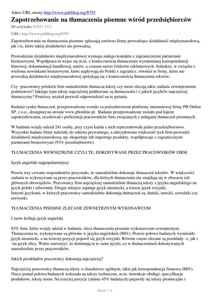 Adres URL strony http://www.publikuj.org/8793 Zapotrzebowanie na tłumaczenia pisemne wśród przedsiębiorców ID artykułu: 8793 / 1711 URL: http://www.publikuj.org/8793 Zapotrzebowanie na tłumaczenia pisemne zgłaszają zarówno firmy prowadzące działalność międzynarodową, jak i te, które takiej działalności nie prowadzą. Prowadzenie działalności międzynarodowej wymaga stałego kontaktu z zagranicznymi partnerami biznesowymi. Współpraca ta wiąże się m.in. z koniecznością tłumaczenia wymienianej korespondencji biurowej, dokumentacji handlowej, umów, a czasem nawet folderów reklamowych. Jednakże, w związku z wieloma nowinkami branżowymi, które napływają do Polski z zagranicy, również te firmy, które nie prowadzą działalności międzynarodowej spotykają się z koniecznością tłumaczenia tekstów. Czy pracownicy polskich firm samodzielnie tłumaczą teksty czy może zlecają takie zadania zewnętrznemu podmiotowi? Jakiego typu teksty najczęściej poddawane są tłumaczeniu i z jakich języków najczęściej tłumaczymy? Poniższy artykuł pozwoli odpowiedzieć na te pytania. Badanie rynku tłumaczeń, przeprowadzone zostało za pośrednictwem platformy internetowej firmy PB Online SP. z o.o., dostępnej na stronie www.pbonline.pl. Badanie przeprowadzone zostało pod kątem zapotrzebowania, oczekiwań i preferencji pracowników firm związanych z usługami tłumaczeń pisemnych. W badaniu wzięły udział 241 osoby, przy czym każda z nich reprezentowała jedno przedsiębiorstwo. Wszystkie badane firmy należały do sektora prywatnego, a zdecydowana większość tych firm prowadzi działalność międzynarodową, np. eksportuje lub importuje produkty, współpracuje z zagranicznymi partnerami biznesowymi (93% przedsiębiorstw). TŁUMACZENIA WEWNĘTRZNE CZYLI TE, DOKONYWANE PRZEZ PRACOWNIKÓW FIRM Język angielski najpopularniejszy Prawie trzy czwarte respondentów przyznało, że samodzielnie dokonuje tłumaczeń tekstów. W większości zadania te wykonywane są przez pracowników, dla których tłumaczenia nie znajdują się w obszarze ich głównych obowiązków. Pracownicy firm najczęściej samodzielnie tłumaczą teksty z języka angielskiego na język polski i odwrotnie. Drugie miejsce zajmuje język niemiecki, a trzecie język rosyjski. Innymi językami, w których pracownicy samodzielnie dokonują tłumaczeń są: duński, turecki, szwedzki czy norweski. TŁUMACZENIA PISEMNE ZLECANE ZEWNĘTRZNYM WYKONAWCOM I znów króluje język angielski 83% firm, które wzięły udział w badaniu, zleca tłumaczenia pisemne wykonawcom zewnętrznym. Tłumaczenia te, wykonywane są głównie w języku angielskim (80%). Prawie połowa badanych wymieniła język niemiecki, a na trzeciej pozycji pojawił się język rosyjski. Równie często zlecane są przekłady -z, jak i -na język obcy. Warto zauważyć, że dominują tu te same języki, co w tłumaczeniach dokonywanych samodzielnie przez pracowników. Jakich przekładów pracownicy dokonują najczęściej? Najczęściej pracownicy tłumaczą teksty o charakterze ogólnym, takie jak korespondencja firmowa (80%). Nieco ponad połowa badanych wskazała na teksty techniczne, m.in. instrukcje obsługi, specyfikacje produktów, teksty norm. Na trzeciej pozycji (zdanie 45% badanych) pojawiły się teksty promocyjne i Strona 1 / 2 marketingowe, np. foldery promocyjne czy strony www. Respondenci zaznaczyli również, że tłumaczą teksty i dokumenty prawne (umowy, regulaminy) oraz teksty i dokumenty finansowe (sprawozdania i raporty finansowe). Znikoma część respondentów wskazała teksty literackie i artystyczne oraz teksty o charakterze naukowym. A co zewnętrzni wykonawcy tłumaczą dla firm? Firmy najczęściej (w 65%) zlecają tłumaczenie tekstów technicznych, takich jak instrukcje obsługi, specyfikacje produktów, teksty norm oraz teksty i dokumenty prawne (m.in. umowy i regulaminy). Na drugiej pozycji znalazły się teksty i dokumenty finansowe, na przykład sprawozdania i raporty (40% respondentów), a na trzeciej (30% respondentów) teksty promocyjne i marketingowe (m.in. foldery promocyjne, strony www). Wśród pozostałych, znajdują się teksty o charakterze naukowym (np. raporty badawcze, artykuły naukowe) oraz teksty o charakterze ogólnym (np. korespondencja firmowa). RODZAJE TEKSTÓW TŁUMACZONYCH PRZEZ PRACOWNIKÓW W ZESTAWIENIU Z TEKSTAMI, KTÓRYCH TŁUMACZENIE ZLECA SIĘ ZEWNĘTRZNEMU WYKONAWCY: Zestawienie rodzajów tekstów tłumaczonych przez pracowników z tymi, których przekładu dokonuje zewnętrzny wykonawca, ukazuje, że największe różnice pojawiają się w związku z tłumaczeniem ogólnej korespondencji; najczęściej ten rodzaj tekstów pozostawia się do tłumaczenia pracownikom firm (ponad 80% przypadków), podczas gdy jedynie w ok.15% zleca się ich tłumaczenie zewnętrznemu wykonawcy. Co do dokumentów prawnych, częściej tłumaczą je wykonawcy zewnętrzni niż pracownicy firmy. Podobnie jest z tekstami promocyjnymi i marketingowymi. Co ciekawe nieduża jest różnica pomiędzy tłumaczeniami tekstów i dokumentów finansowych (jest to mniej niż 10%). Podobnie jest w przypadku tekstów technicznych. Pełny raport można pobrać na stroniehttp://www.pbonline.pl/customers/pages/raporty-z-badan--2 Agnieszka Ławniczak, PB Online Sp. z o.o. PB Online www.pbonline.pl Aktywacja: 28/10/10 14:26, odsłony: 567 Strona 2 / 2