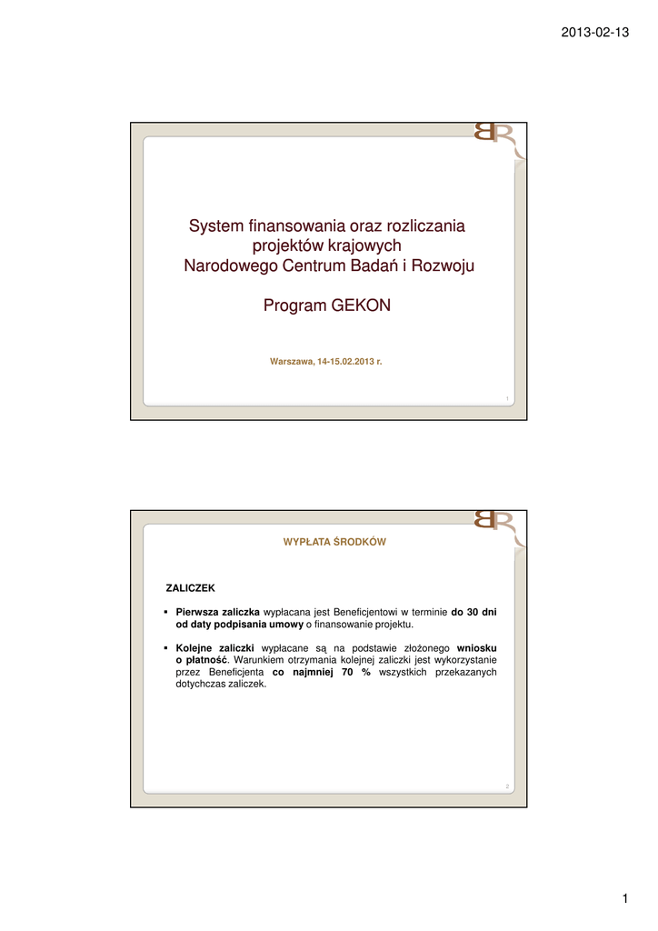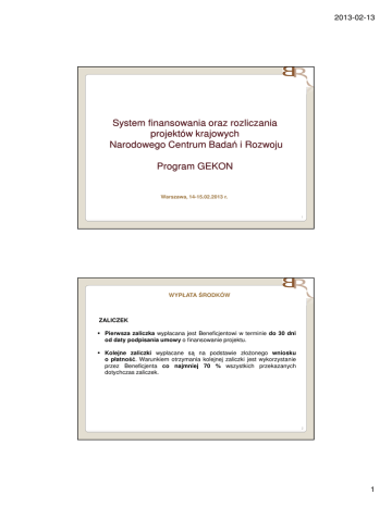2013-02-13 System finansowania oraz rozliczania projektów krajowych Narodowego Centrum Badań i Rozwoju Program GEKON Warszawa, 14-15.02.2013 r. 1 WYPŁATA ŚRODKÓW ZALICZEK Pierwsza zaliczka wypłacana jest Beneficjentowi w terminie do 30 dni od daty podpisania umowy o finansowanie projektu. Kolejne zaliczki wypłacane są na podstawie złożonego wniosku o płatność. Warunkiem otrzymania kolejnej zaliczki jest wykorzystanie przez Beneficjenta co najmniej 70 % wszystkich przekazanych dotychczas zaliczek. 2 1 2013-02-13 WYPŁATA ŚRODKÓW Finansowanie (zaliczki, refundacje) z Harmonogramem płatności. przekazywane jest zgodnie Otrzymane środki finansowe (zaliczki) niewykorzystane w danym roku budżetowym mogą być wykorzystane w kolejnym roku realizacji projektu bez konieczności zmiany umowy. Niewykorzystane środki finansowe na realizację projektu, po zakończeniu realizacji projektu podlegają zwrotowi na rachunek Centrum. 3 ROZLICZANIE PROJEKTÓW POD WZGLĘDEM FINANSOWYM Wniosek o płatność składany jest nie później niż do 15 listopada . danego roku budżetowego. Niezłożenie wniosku o płatność w wymaganym terminie może skutkować utratą prawa do finansowania przyznanego na dany rok budżetowy bez zmiany rzeczowego zakresu realizowanego projektu. Wypłata zaliczki nie oznacza zatwierdzenia wniosku o płatność w zakresie rozliczenia kosztów Beneficjent jest zobowiązany do posiadania dokumentów potwierdzających wszystkie poniesione na rzecz realizacji projektu koszty. Dokumenty powinny być sporządzone i przechowywane z zachowaniem odpowiednich przepisów prawa. Każdy oryginał dokumentu księgowego należy opisać wskazując następujące informacje: nr umowy, kategoria kosztów oraz numer zadania. 4 2 2013-02-13 Warszawa, 24 sierpnia 2012 r. 5 ROZLICZANIE PROJEKTÓW POD WZGLĘDEM FINANSOWYM Wykonawca zobowiązany jest do złożenia Raportu końcowego w terminie 60 dni od dnia zakończenia realizacji projektu. Raport końcowy: pokazuje realizację całości projektu od strony finansowej pełni funkcję korekty złożonych wcześniej wniosków o płatność (jeśli zajdzie taka konieczność w wyniku sprawdzenia przez opiekuna finansowego zgodności poniesionych kosztów pod względem rachunkowym z poszczególnymi częściami raportu). 6 3 2013-02-13 WERYFIKACJA KOSZTÓW AUDYT ZEWNĘTRZNY Projekt, w którym wartość finansowania przekracza 2 mln zł, podlega obowiązkowemu audytowi zewnętrznemu zgodnie z art. 44 Ustawy. Koszt przeprowadzonego audytu stanowi koszt kwalifikowany jeżeli audyt rozpoczął się co najmniej po zrealizowaniu 50% planowanych wydatków związanych z realizacją projektu. Wykonawca przekazuje wraz z raportem końcowym sprawozdanie z przeprowadzonego audytu zewnętrznego. Wykonawca zobowiązany jest dostosować się do zaleceń wynikających z audytu i uwzględnić je w raporcie końcowym. Sprawozdanie z audytu o którym mowa powyżej jest jednoznaczne z weryfikacją kosztów kwalifikowanych projektu na określonej próbie. 7 WERYFIKACJA KOSZTÓW WERYFIKACJA NA PRÓBIE W przypadku projektów nie podlegających obowiązkowemu audytowi zewnętrznemu weryfikacja kosztów odbywa się na podstawie wykazu kosztów stanowiących załącznik do raportu końcowego z realizacji projektu. Weryfikacja kosztów kwalifikowanych wyszczególnionych w dokumencie sprawozdawczym następuje według ustalonego przez Centrum algorytmu. 8 4 2013-02-13 KWALIFIKOWALNOŚĆ KOSZTÓW 1. Koszty kwalifikowane spełniają łącznie następujące warunki: 1. 2. 3. 4. są niezbędne do zrealizowania celów Projektu, są zgodne z Kosztorysem Projektu, są zgodne z katalogiem kosztów kwalifikowanych są zaksięgowane i udokumentowane zgodnie z przepisami o rachunkowości oraz przyjętą polityką rachunkowości; 5. zostały poniesione w terminach realizacji 6. zostały poniesione zgodnie z zasadami racjonalnej gospodarki finansowej, w szczególności najkorzystniejszej relacji nakładów do rezultatów Koszty kwalifikowane Umowa o dofinansowanie Wniosek o dofinansowanie Ocena eksperta merytorycznego Przewodnik po kwalifikowalności 9 KATALOG KOSZTÓW KWALIFIKOWANYCH 1. Koszty bezpośrednie: • W - wynagrodzenia z pochodnymi • A - koszty aparatury naukowo – badawczej • G - koszty budynków i gruntów • E - koszty usług badawczych i wiedzy technicznej- do 70% całkowitych kosztów kwalifikowanych badań realizowanych przez przedsiębiorcę • Op - koszty operacyjne (materiały i środki eksploatacyjne) 2. Koszty pośrednie • O - koszty ogólne ponoszone w związku z realizacją projektu rozliczane ryczałtem 10 5 2013-02-13 KWALIFIKOWALNOŚĆ KOSZTÓW W – Koszty wynagrodzeń Wynagrodzenia wypłacane na podstawie umowy o pracę bądź umów cywilnoprawnych - w przypadku umowy o pracę – wykaz obowiązków w ramach zadania badawczego lub karta czasu pracy – dla osób, które pracują na rzecz projektu objętego dofinansowaniem i jednocześnie w tym samym czasie wykonują inne zadania nie związane z projektem. - w przypadku umowy zlecenia lub umowy o dzieło – wykaz obowiązków w ramach projektu, protokół odbioru Wynagrodzenia wraz z pozapłacowymi kosztami pracy- składki na ubezpieczenia społeczne, zdrowotne Nagrody, premie, dodatki – przewidziane w regulaminie pracy/regulaminie wynagradzania danej instytucji, które obejmują wszystkich pracowników instytucji Wynagrodzenia może pobierać wyłącznie Kierownik projektu i Zespół badawczy – zespół realizujący Projekt KWALIFIKOWALNOŚĆ KOSZTÓW A – Aparatura naukowo-badawcza • Zakup finansowany w 100 % - urządzenie służące celom badawczym wykorzystywane jest tylko na potrzeby projektu całkowita amortyzacja urządzenia dokona się w okresie realizacji projektu • Amortyzacja Kwalifikowana wartość odpisów amortyzacyjnych odnosi się wyłącznie do okresu realizacji projektu oraz proporcji wykorzystania środka przy realizacji projektu • Odpłatne korzystanie z aparatury n