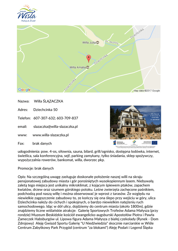 Nazwa: Willa ŚLĄZACZKA Adres: Dziechcinka 50 Telefon: 607-307-632; 603-709-837 email: [email protected] www: www.willa-slazaczka.pl Fax: brak danych udogodnienia: pow. 4-os, siłownia, sauna, bilard, grill/ognisko, dostępna lodówka, internet, świetlica, sala konferencyjna, sejf, parking zamykany, tylko śniadania, sklep spożywczy, wypożyczalnia rowerów, bankomat, willa, dworzec pkp. Promocje: brak danych Opis: Na szczególną uwagę zasługuje doskonałe położenie naszej willi na skraju pensjonatowej zabudowy miasta i gór porośniętych wysokopiennym lasem. Niebywałą zaletą tego miejsca jest unikalny mikroklimat, z kojącym śpiewem ptaków, zapachem kwiatów, drzew oraz szumem górskiego potoku. Leśne zwierzęta zachęcone paśnikiem, podchodzą pod naszą willę i można obserwować je wprost z tarasów. Ze względu na niewielkie zagęszczenie zabudowy to, ze kończy się ona ślepo przy wejściu w góry, ulica Dziechcinka należy do cichych i spokojnych, o bardzo niewielkim natężeniu ruch samochodowego. Idąc w dół ulicy, dojdziemy do centrum miasta (około 1800m), gdzie znajdziemy liczne wiślańskie atrakcje: Galerię Sportowych Trofeów Adama Małysza (przy rondzie) Muzeum Beskidzkie kościół ewangelicko-augsburski Apostołów Piotra i Pawła Zameczek Habsburgów ul. Lipowa figura Adama Małysza z białej czekolady (Rynek - Dom Zdrojowy) Aleję Gwiazd Sportu Galerię "U Niedźwiedzia" skocznie narciarskie w Wiśle Centrum Zabytkowy Park Przygód (centrum "za blokami") Aleję Podań i Legend Śląska Cieszyńskiego (Park Kopczyńskiego) Amfiteatr im. Stanisława Hadyny Kolej Linowa Skolnity Muzeum Narciarstwa (DW Zimowit ul. Wodna) Muzeum Spadochroniarstwa (DW Agawa ul. Przylesie) Auapark Tropikana w Hotelu Gołębiewskim W samym centrum miasta znajdują się również: Urząd Miejski Poczta Polska deptak restauracje i kawiarnie stoiska i sklepy z pamiątkami targowisko Jeszcze bliżej do: - stacji PKP 1000 metrów - stacji benzynowej 700 metrów - wyciągu narciarskiego 1500 metrów Idąc w górę ulicy wzdłuż potoku - Dziechcinka, po przejściu 700 metrów wchodzimy na liczne szlaki turystyczne biegnące okolicznymi pasmami gór. Do dyspozycji naszych gości: - sala konferencyjna na około 30 osób przechowalnia rowerów i nart - zadaszony grill - bezpłatny, zamykany i monitorowany parking Również do dyspozycji gości w drugim bliźniaczym budynku na tej samej posesji w Willi Amalia znajdują się: - jadalnia - sala kominkowa - bilard - sauna fińska 10 zł/1h - siłownia Willa Ślązaczka posiada do Państwa dyspozycji 7 eleganckich, czteroosobowych apartamentów z aneksem kuchennym i balkonem, wyposażonych między innymi w: - telewizję satelitarną - lodówkę - łazienkę z prysznicem - toaletę dostęp do bezprzewodowego bezpłatnego internetu Bezpłatnie! Wszystkie dzieci do lat 4 - pobyt bezpłatny, jeżeli śpią na obecnych łóżkach. Bezpłatnie! Jedno dziecko do lat 2 - pobyt bezpłatny, na łóżeczku niemowlęcym . Maksymalna liczba łóżeczek niemowlęcych w pokoju to 1. Jakiekolwiek dodatkowe łóżka oraz łóżeczka dla dzieci dostępne są jedynie na życzenie i muszą zostać potwierdzone przez obiekt.