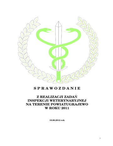 SPRAWOZDANIE Z REALIZACJI ZADAŃ INSPEKCJI WETERYNARYJNEJ NA TERENIE POWIATUGRAJEWO W ROKU 2011 19.06.2012 rok 1 Spis treści Wstęp ............................................................................................. Część I – Ogólne informacje dotyczące Inspekcji Weterynaryjnej na terenie województwa.............................. 1. Struktura Inspekcji Weterynaryjnej w województwie .............. 1.1 Podstawowe zmiany w strukturze, w stosunku do roku poprzedniego ................................................................................ 1.2 Zmiany na stanowiskach WLW, Z-cy WLW, Kierownika ZHW i PLW w roku objętym sprawozdaniem ...................................... 2. Kadry Inspekcji Weterynaryjnej w województwie...................... 2.1 Etaty w Inspekcji Weterynaryjnej ............................................ 2.2 Pracownicy Inspekcji Weterynaryjnej....................................... 2.3 Osoby niebędące pracownikami Inspekcji Weterynaryjnej, wyznaczone do wykonywania określonych czynności .............. 3. Szkolenia Inspekcji Weterynaryjnej w województwie ............... 4. Finansowanie Inspekcji Weterynaryjnej w województwie ....... Część II – Realizacja zadań Inspekcji Weterynaryjnej na terenie województwa,w roku objętym sprawozdaniem ..... 1. Nadzór nad ochroną zdrowia zwierząt ........................................ 2. Nadzór nad identyfikacją i rejestracją zwierząt........................ 3. Nadzór nad humanitarną ochroną zwierząt ............................... 4. Bezpieczna żywność pochodzenia zwierzęcego ......................... 5. Nadzór nad paszami, ubocznymi produktami pochodzenia zwierzęcego oraz weterynaryjnymi produktami leczniczymi .. 6. Weterynaryjna kontrola w handlu pomiędzy krajami członkowskimi Unii Europejskieji w eksporcie do krajów nienależących do Unii Europejskiej ............................................. 7. Badania laboratoryjne ..................................................................... 7.1 Wykorzystanie systemu CELAB w województwie .................... 8. Omówienie wyników kontroli wewnętrznych ............................ Część III – Wnioski z realizacji zadań, plany i założenia na rok następny ................................................................................ 2 1. Wnioski z realizacji zadań w roku objętym sprawozdaniem .... 2. Plany i założenia na rok następny .................................................. 3 WSTĘP Niniejsze sprawozdanie podsumowuje działania organów Inspekcji Weterynaryjnej prowadzone w 2011 r. na terenie Powiatu Grajewskiego (W części tej należy przedstawić krótkie podsumowanie pracy Inspekcji Weterynaryjnej na terenie województwa, w roku objętym sprawozdaniem. W szczególności warto wskazać główne osiągnięcia służb weterynaryjnych oraz ewentualne trudności w wykonywaniu zadań Inspekcji Weterynaryjnej). W okresie sprawozdawczym nie stwierdzono występowania chorób zakaźnych zwierząt. Nie wystąpiły ogniska chorób szczególnie groźnych takich jak: klasyczny pomór świń, grypa ptaków i świń oraz BSE, wścieklizna itp. Teren powiatu Grajewo uznany jest za wolny od gruźlicy, brucelozy i ebb bydła, Kontynuowano realizację programu zwalczania choroby Aujeszky’ego u świń, poprzez stałe monitorowanie gospodarstw zajmujących się produkcją trzody chlewnej. W efekcie osiągnięto status „ urzędowo wolne od wirusa ch.Aujeszky’ego” dla wszystkich gospodarstw na terenie powiatu, co zostało potwierdzone w decyzjach administracyjnych o statusie gospodarstwa. W zakresie nadzoru nad przestrzeganiem przepisów o ochronie zwierząt nie stwierdzono rażących zaniedbań ze strony właścicieli zwierząt gospodarskich. Prowadzono akcję propagandową umieszczając stosowną informację w prasie i na portalach internetowych. Sprawując nadzór nad higieną pasz osiągnięto dalszą poprawę warunków weterynaryjnych w obrocie paszami. Prowadzony wg krajowego planu monitoring nie wykazał przypadków naruszenia obowiązujących wymogów i przepisów: W zakresie nadzoru nad higieną produkcji żywności, w tym również prowadzenia badań w ramach rocznego plany pozostałości - nie stwierdzono żywności nie spełniającej kryteriów bezpieczeństwa zdrowotnego. 4 Część I – Ogólne Weterynaryjnej informacje dotyczące Inspekcji 1. Struktura Inspekcji Weterynaryjnej Schemat organizacyjny WIW, dane WLW, Z-cy WLW, Kierownika ZHW, PLW (stan na dzień 31 grudnia 2011). SCHEMAT ORGANIZACYJNY POWIATOWEGO INSPEKTORATU WETERYNARII W GRAJEWIE Powiatowy Lekarz Weterynarii Kierownik Powiatowego Inspektoratu Weterynarii Z-ca Powiatowego Lekarza Weterynarii Zespół ds. administracji Samodzielne stanowisko ds. obsługi prawnej Zespół d/s bezpieczeństwa żywności, pasz oraz ubocznych produktów zwierzęcych Zespół d/s zdrowia i ochrony zwierząt Zespół d/s finansowo – księgowych 5 1.1 Podstawowe zmiany w strukturze, w stosunku do roku poprzedniego Informacja o zmianach w stosunku do roku poprzedniego (nowe zespoły, stanowiska, podległość służbowa, itp.). W przypadku braku zmian należy wpisać „Nie dotyczy”. Nie dotyczy 1.2 Zmiany na stanowiskach WLW i PLW w roku objętym sprawozdaniem Dane osób zajmujących stanowiska WLW, Z-cy WLW, PLW, które zmieniały się w ciągu roku objętego sprawozdaniem, daty dokonania zmian, powody zmian. Nie wystąpiły zmiany na stanowiskach Powiatowego Lekarza Weterynarii i jego zastępcy. 2. Kadry Inspekcji Weterynaryjnej w województwie 2.1 Etaty w Inspekcji Weterynaryjnej Wykaz etatów będących w dyspozycji IW (etaty obsadzone i wolne). JEDNOSTKA 1 PIW w Grajewie STAN NA DZIEŃ 31.12 ROKU POPRZEDNIEGO 2 13,00 STAN NA DZIEŃ 31.12 ROKU OBJĘTEGO SPRAWOZDANIEM w tym: Osoby nieobjęte Korpus Łącznie mnożnikowymi służby systemami cywilnej wynagrodzeń 3 4 5 12,50 11,00 1,5 RÓŻNICA (kol. 3 - kol. 2) 6 0,50 6 2.2 Struktura zatrudnienia w woje