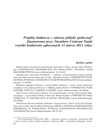 Projekty badawcze z zakresu polityki społecznej1 finansowane przez Narodowe Centrum Nauki (wyniki konkursów ogłoszonych 15 marca 2011 roku) Konkurs ogólny Bezpieczeństwo ekonomiczne gospodarstw domowych w Polsce, dr hab. Maria Piotrowska, UNIWERSYTET EKONOMICZNY WE WROCŁAWIU; WYDZIAŁ NAUK EKONOMICZNYCH; kwota dofinansowania: 124 614,00 Zabezpieczenie egzystencji (livelihood) — nadzieja i uwarunkowania nowego paradygmatu dla badań nad rozwojem, prof. dr hab. Mirosława Czerny, UNIWERSYTET WARSZAWSKI; WYDZIAŁ GEOGRAFII I STUDIÓW REGIONALNYCH, kwota dofinansowania: 119 100,00 Mobilność kapitału ludzkiego a rozwój polskich regionów — teoria, model empiryczny i implikacje dla polityki publicznej, dr Mikołaj Julian Herbst, UNIWERSYTET WARSZAWSKI; INSTYTUT AMERYK I EUROPY, kwota dofinansowania: 307 900,00 Opracowanie systemowego podejścia do zrównoważonego rozwoju społeczeństwa informacyjnego — na przykładzie Polski, dr hab. Ewa Wanda Ziemba, UNIWERSYTET EKONOMICZNY W KATOWICACH; WYDZIAŁ EKONOMII, kwota dofinansowania: 502 500,00 Nierówności płacowe pomiędzy kobietami i mężczyznami w Polsce na tle Unii Europejskiej, prof. dr hab. Dorota Maria Witkowska, SZKOŁA GŁÓWNA GOSPODARSTWA WIEJSKIEGO W WARSZAWIE; WYDZIAŁ ZASTOSOWAŃ INFORMATYKI I MATEMATYKI, kwota dofinansowania: 188 217,00 Pod uwagę brane były panele: HS4 — ekonomia, finanse, zarządzanie, demografia; HS5 — prawo, nauki o polityce, polityka regionalna i społeczna; HS6 — psychologia, pedagogika, socjologia. 1 160 Z życia naukowego Dyskryminacja płacowa ze względu na płeć: stan, przyczyny i skutki — analiza sektorowego zróżnicowania wynagrodzeń w krajach OECD, dr Joanna Justyna Wolszczak-Derlacz, POLITECHNIKA GDAŃSKA; WYDZIAŁ ZARZĄDZANIA I EKONOMII, kwota dofinansowania: 42 900,00 Społeczna odpowiedzialność przedsiębiorstw sektora TSL w Polsce — diagnoza i przyszłe wyzwania, dr Izabela Dembińska, UNIWERSYTET SZCZECIŃSKI; WYDZIAŁ ZARZĄDZANIA I EKONOMIKI USŁUG, kwota dofinansowania: 70 000,00 Urlopy szkoleniowe i zwolnienie z dnia pracy, jako instrumenty wspierające podnoszenie kwalifikacji zawodowych pracowników, prof. dr hab. Elżbieta Kryńska, INSTYTUT PRACY I SPRAW SOCJALNYCH, kwota dofinansowania: 298 926,00 Ostatni rok życia Europejczyka — analiza warunków społeczno-ekonomicznych końca życia i determinanty umieralności na podstawie danych SHARE w latach 2005–2010, dr Małgorzata Kalbarczyk-Stęclik, UNIWERSYTET WARSZAWSKI; WYDZIAŁ NAUK EKONOMICZNYCH, kwota dofinansowania: 105 000,00 Uwarunkowania zabezpieczania starości w polskich gospodarstwa domowych, prof. dr hab. Małgorzata Maria Rószkiewicz, SZKOŁA GŁÓWNA HANDLOWA; KOLEGIUM ANALIZ EKONOMICZNYCH, kwota dofinansowania: 140 000,00 Struktura sfery realnej gospodarek narodowych w UE a poziom dobrobytu, dr hab. Teresa Alicja Kamińska, UNIWERSYTET GDAŃSKI, WYDZIAŁ EKONOMICZNY, kwota dofinansowania: 226 200,00 Terytorialne zróżnicowanie umieralności w Polsce, dr Magdalena Muszyńska, SZKOŁA GŁÓWNA HANDLOWA, KOLEGIUM ANALIZ EKONOMICZNYCH, kwota dofinansowania: 173 125,00 Nordycki model równoważenia finansów publicznych i osiągania stabilności społecznej, dr hab. Dariusz Filar, UNIWERSYTET GDAŃSKI; WYDZIAŁ EKONOMICZNY, kwota dofinansowania: 285 120,00 Metodologia tworzenia systemu mierników jakości usług medycznych świadczonych przez szpitale, dr Cyprian Kozyra, UNIWERSYTET EKONOMICZNY WE WROCŁAWIU; WYDZIAŁ ZARZĄDZANIA, INFORMATYKI I FINANSÓW, kwota dofinansowania: 66 492,50 Metody symulacyjne i symulacyjne modele komputerowe w zarządzaniu systemami ochrony zdrowia, dr inż. Bożena Mielczarek, POLITECHNIKA WROCŁAWSKA, WYDZIAŁ INFORMATYKI I ZARZĄDZANIA, kwota dofinansowania: 114 800,00 Dyskryminacja pośrednia w prawie Unii Europejskiej: ewolucja, istota oraz relacje ze zbliżonymi koncepcjami prawnymi, dr hab. Justyna Zofia Maliszewska-Nienartowicz, UNIWERSYTET MIKOŁAJA KOPERNIKA; WYDZIAŁ POLITOLOGII I STUDIÓW MIĘDZYNARODOWYCH, kwota dofinansowania: 48 460,00 Międzysektorowe instrumenty realizacji zadań publicznych a polityka społeczna, dr Stanisław Kamiński, UNIWERSYTET EKONOMICZNY WE WROCŁAWIU; WYDZIAŁ NAUK EKONOMICZNYCH, kwota dofinansowania: 66 750,00 Z życia naukowego 161 Poziom życia ludności wiejskiej o niepewnych dochodach w Polsce, dr Sławomir Marcin Kalinowski, UNIWERSYTET PRZYRODNICZY W POZNANIU; WYDZIAŁ EKONOMICZNO-SPOŁECZNY, kwota dofinansowania: 126 600,00 Koncepcja i zakres wspólnotowej polityki dotyczącej ochrony zdrowia w XXI wieku. Uwarunkowania i szanse współczesnych trendów w sferze legislacji, zarządzania publicznego i działań implementacyjnych, dr Anna Mokrzycka, UNIWERSYTET JAGIELLOŃSKICOLLEGIUM MEDICUM; WYDZIAŁ NAUK O ZDROWIU, kwota dofinansowania: 78 760,00 Podmioty gospodarki społecznej w polityce Unii Europejskiej, dr Monika Katarzyna Klimowicz, UNIWERSYTET WROCŁAWSKI; WYDZIAŁ NAUK SPOŁECZNYCH, kwota dofinansowania: 33 800,00 Jak młodzież zagrożona wykluczeniem społecznym radzi sobie ze stresem? Dynamika zmian w obrębie symptomów emocjonalnego odrętwienia, dr Agnieszka Wilczyńska, UNIWERSYTET ŚLĄSKI W KATOWICACH; WYDZIAŁ PEDAGOGIKI I PSYCHOLOGII, kwota dofinansowania: 98 125,00 Konkurs na finansowanie projektów badawczych realizowanych przez osoby rozpoczynające karierę naukową, posiadające stopień naukowy doktora Modelowanie makroekonomicznych skutków reform systemów emerytalnych, dr Joanna Tyrowicz, UNIWERSYTET WARSZAWSKI; WYDZIAŁ NAUK EKONOMICZNYCH, kwota dofinansowania: 506 500,00 Ewaluacja społecznie odpowiedzialnej działalności przedsiębiorstw, dr inż. Agata Lulewicz-Sas, Politechnika Białostocka, Wydział Zarządzania, kwota dofinansowania: 99 600,00 Pozasytuacyjne determinanty reakcji konsumentów wobec kampanii marketingu społecznie zaangażowanego, dr Grzegorz Zasuwa, KATOLICKI UNIWERSYTET LUBELSKI JANA PAWŁA II; WYDZIAŁ NAUK SPOŁECZNYCH, kwota dofinansowania: 59 520,00 Oc
