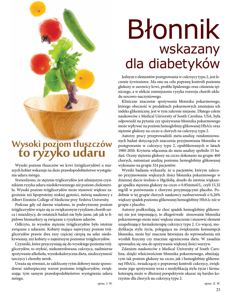 Błonnik wskazany dla diabetyków Wysoki poziom tłuszczów we krwi (trójglicerydów) u starszych kobiet wskazuje na duże prawdopodobieństwo wystąpienia udaru mózgu. Stwierdzono, że stężenie triglicerydów jest silniejszym czynnikiem ryzyka udaru niedokrwiennego niż poziom cholesterolu. Wysoki poziom trójglicerydów może stanowić większe zagrożenie niż lipoproteiny niskiej gęstości, mówią naukowcy z Albert Einstein College of Medicine przy Yeshiva University. Podczas gdy od dawna wiadomo, że podwyższony poziom trójglicerydów wiąże się ze zwiększonym ryzykiem chorób serca i miażdżycy, do ostatnich badań nie było jasne, jak jak te lipidowe biomarkery są związane z ryzykiem udarów. Odkryto, że wysokie stężenie trójglicerydów było istotnie związane z udarami. Kobiety mające najwyższy poziom trójglicerydów prawie dwa razy częściej cierpią na udar niedokrwienny, niż kobiety o najniższym poziomie trójglicerydów. Czynniki, które przyczyniają się do wysokiego poziomu trójglicerydów, to otyłość, niekontrolowana cukrzyca, nadmierne spożywanie alkoholu, wysokokaloryczna dieta, niedoczynność tarczycy i choroby nerek. Uważa się również, że zakłócony rytm dobowy może spowodować niebezpieczny wzrost poziomu trójglicerydów, zwiększając tym samym prawdopodobieństwo wystąpienia udaru mózgu. Jednym z elementów postępowania w cukrzycy typu 2, jest leczenie żywieniowe. Ma ono na celu poprawę kontroli poziomu glukozy w surowicy krwi, profilu lipidowego oraz ciśnienia tętniczego, a w efekcie zmniejszenie ryzyka rozwoju chorób układu sercowo-naczyniowego. Kliniczne znaczenie spożywania błonnika pokarmowego, którego obecność w produktach pokarmowych zmniejsza ich indeks glikemiczny, jest w tym zakresie niejasne. Dlatego celem naukowców z Medical University of South Carolina, USA, była odpowiedź na pytanie czy spożywanie błonnika pokarmowego może wpływać na poziom hemoglobiny glikowanej HbA1c oraz stężenie glukozy na czczo u chorych na cukrzycę typu 2. Autorzy pracy przeprowadzili meta-analizę randomizowanych badań dotyczących znaczenia przyjmowania błonnika w postępowaniu w cukrzycy typu 2, opublikowanych w latach 1980-2010. Kryteria włączenia do meta-analizy spełniło 15 badań. Oceny stężenia glukozy na czczo dokonano na grupie 400 chorych, natomiast analizę poziomu hemoglobiny glikowanej wykonano na grupie 324 pacjentów. Wyniki badania wykazały, że u pacjentów, którym zalecono przyjmowanie większych ilości błonnika pokarmowego w dziennej diecie średnio o 18g/dobę, doszło do istotnie większego spadku stężenia glukozy na czczo o 0.85mmol/L, czyli 15,32 mg/dl w porównaniu z chorymi przyjmującymi placebo. Podobnie w tej grupie chorych naukowcy zaobserwowali o 0,26% większy spadek poziomu glikowanej hemoglobiny HbA1c niż w grupie z placebo. Autorzy podkreślają, że choć spadek hemoglobiny glikowanej nie jest imponujący, to długotrwałe stosowanie błonnika pokarmowego może mieć większe znaczenie i stanowić element uzupełniający farmakoterapię cukrzycy typu 2. Co więcej, modyfikacja stylu życia, polegająca na zwiększeniu konsumpcji błonnika, może być znacznie łatwiejsza do wprowadzenia niż wysiłek fizyczny czy znacznie ograniczona dieta. W zasadzie sprowadza się ona do spożywania większej ilości warzyw. Zdaniem naukowców z Medical University of South Carolina, dzięki właściwościom błonnika pokarmowego, obniżającym tak poziom glukozy na czczo, jak i hemoglobiny glikowanej HbA1c, świadczącej o poprawnej kontroli cukrzycy, zwiększone jego spożywanie wraz z modyfikacją stylu życia i farmakoterapią może w dłuższej perspektywie okazać się bardzo korzystne dla chorych na cukrzycę typu 2. oprac. J. W. oprac. E. W. Wysoki poziom tłuszczów to ryzyko udaru 23
