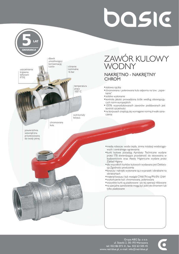 5 LAT GWARANCJI dławik umożliwiający kompensację luzów uszczelnienie trzpienia teflonem PTFE ciśnienie nominalne 16 bar temperatura pracy 100° C wytrzymały korpus ZAWÓR KULOWY WODNY NAKRĘTNO - NAKRĘTNY CHROM • stalowa rączka • chromowana i polerowana kula odporna na tzw. „zapiekanie” • solidne wykonanie • kontrola jakości prowadzona ściśle według obowiązujących norm europejskich • 100% wyprodukowanych zaworów poddawanych jest kontroli szczelności • na korpusach znajdują się wymagane normą trwałe oznaczenia chromowana kula powierzchnia wewnętrzna przystosowana do wody pitnej • media robocze: woda ciepła, zimna instalacji wodociągowych i centralnego ogrzewania • kurki kulowe posiadają Aprobaty Techniczne wydane przez ITB stwierdzające przydatność do stosowania w budownictwie oraz Atesty Higieniczne wydane przez Zakład Higieny • dla wszystkich kurków kulowych wydawana jest Deklaracja Zgodności producenta • korpusy i nakrętki wykonane są z wyprasek i obrabiane na obrabiarkach • materiał korpusu i kuli: mosiądz CW617N wg PN-EN 12164 • wykończenie kuli: chromowana, polerowana • wszystkie kurki są piaskowane i po tej operacji niklowane • na specjalne zamówienie mogą być pokryte chromem lub tylko piaskowane Grupa ABG Sp. z o.o. ul. Stawki 2, 00-193 Warszawa tel: 022 86 073 31, fax. 022 63 505 45 www.red-blue.pl, e-mail: [email protected] ZAWÓR KULOWY WODNY Z DŁAWIKIEM C D A d B DN d [mm] p nom [MPa] A [cal] B [mm] C [mm] D [mm] Kvs [m³/h] kod artykułu 15 13,5 1,6 1/2 45 85 43,5 8 C023402001 20 17 1,6 3/4 52 85 46 14 C023402002 25 21,5 1,6 1 63 96 50,5 21 C023402003 32 27 1,6 5/4 70,2 111 61,4 43 C023402004 40 35,5 1,6 6/4 81,6 148 67,6 88 C023402005 50 44,50 1,6 2 95,6 148 74,9 128 C023402006 NAJLEPSZA CENA