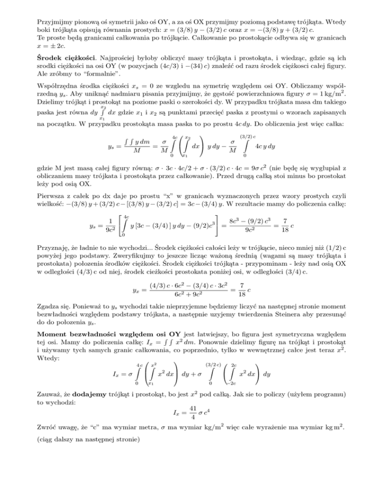 Przyjmijmy pionową oś symetrii jako oś OY, a za oś OX przymijmy poziomą podstawę trójkąta. Wtedy boki trójkąta opisują równania prostych: x = (3/8) y − (3/2) c oraz x = −(3/8) y + (3/2) c. Te proste będą granicami całkowania po trójkącie. Całkowanie po prostokącie odbywa się w granicach x = ± 2c. Środek ciężkości. Najprościej byłoby obliczyć masy trójkąta i prostokąta, i wiedząc, gdzie są ich srodki ciężkości na osi OY (w pozycjach (4c/3) i −(34) c) znaleźć od razu środek ciężkosci całej figury. Ale zróbmy to “formalnie”. Współrzędna środka ciężkości xs = 0 ze wzgledu na symetrię względem osi OY. Obliczamy współrzedną ys . Aby uniknąć nadmiaru pisania przyjmijmy, że gęstość powierzchniowa figury σ = 1 kg/m2 . Dzielimy trójkąt i prostokąt na poziome paski o szerokości dy. W przypadku trójkata masa dm takiego paska jest równa dy x R2 dx gdzie x1 i x2 są punktami przecięć paska z prostymi o wzorach zapisanych x1 na początku. W przypadku prostokąta masa paska to po prostu 4c dy. Do obliczenia jest więc całka: RR ys = y dm σ = M M (3/2) Z4c Zx2 Z c σ dx y dy − 4c y dy 0 M x1 0 gdzie M jest masą całej figury równą: σ · 3c · 4c/2 + σ · (3/2) c · 4c = 9σ c2 (nie będę się wygłupiał z obliczaniem masy trójkata i prostokąta przez całkowanie). Przed drugą całką stoi minus bo prostokat leży pod osią OX. Pierwsza z całek po dx daje po prostu “x” w granicach wyznaczonych przez wzory prostych czyli wielkość: −(3/8) y + (3/2) c − [(3/8) y − (3/2) c] = 3c − (3/4) y. W rezultacie mamy do policzenia całkę: 4c Z 1 8c3 − (9/2) c3 7 ys = 2 y [3c − (3/4) ] y dy − (9/2)c3 = = c 2 9c 9c 18 0 Przyznaję, że ładnie to nie wychodzi... Środek ciężkości całości leży w trójkącie, nieco mniej niż (1/2) c powyżej jego podstawy. Zweryfikujmy to jeszcze licząc ważoną średnią (wagami są masy trójkąta i prostokata) połozenia środków ciężkości. Środek ciężkości trójkąta - przypominam - leży nad osią OX w odległości (4/3) c od niej, środek cieżkości prostokata poniżej osi, w odległości (3/4) c. (4/3) c · 6c2 − (3/4) c · 3c2 7 = c 2 2 6c + 9c 18 yx = Zgadza się. Ponieważ to ys wychodzi takie nieprzyjemne będziemy liczyć na następnej stronie moment bezwładności względem podstawy trójkata, a następnie uzyjemy twierdzenia Steinera aby przesunąć do do połozenia ys . Moment bezwładności względem osiR OY jest łatwiejszy, bo figura jest symetryczna względem R 2 tej osi. Mamy do policzenia całkę: Ix = x dm. Ponownie dzielimy figurę na trójkąt i prostokąt i używamy tych samych granic całkowania, co poprzednio, tylko w wewnętrznej całce jest teraz x2 . Wtedy: Zx2 Z4 c Ix = σ 0 x2 dx dy + σ x1 (3/2 Z c) Z2c 0 Zauważ, że dodajemy trójkąt i prostokąt, bo jest to wychodzi: Ix = x2 x2 dx dy −2c pod całką. Jak sie to policzy (użyłem programu) 41 4 σc 4 Zwróć uwagę, że “c” ma wymiar metra, σ ma wymiar kg/m2 więc całe wyrażenie ma wymiar kg m2 . (ciąg dalszy na następnej stronie) Moment bezwładności względem osi OX liczymy dodając momenty bezwładnosci trójkąta i prostokąta względem podstawy trójkata. Wzór jest podobny do tego, uzywanego do obliczania środka masy, tylko zamiast y piszemy y 2 oraz sumujemy obie całki. Iy0 = Z Z (3/2) Z4c Zx2 Z c 2 2 y dm = σ dx y dy + σ 4c y 2 dy x1 0 0 Zauważ, że napisałem Iy0 bo to nie jest jeszcze moment bezwładnosci względem srodka masy. Wykonujemy wewnętrzną całke jak poprzednio i mamy: 4c Z 41 4 σc Iy0 = σ y 2 [3c − (3/4) ] y dy + σ (9/2)c4 = 16c4 + (9/2) c4 = 2 0 Ostatni krok do wyznaczenia momentu bezwładności względem osi przechodzącej przez srodek masy to uzycie tw. Steinera: Iy = Iy0 − M ys2 = 41 4 72 689 4 σ c − 9 σ c2 · 2 c2 = σc 2 18 36 RR xy dm Poprawka na twierdzenie Steinera jest tutaj Moment dewiacji jest określany całką: Ixy = zerem gdyż współrzędna xs leży na osi symetrii układu, będącej jednocześnie jedną z osi głównych. Do policzenia mamy więc całkę: 0 Ixy = Ixy =σ Z4 c Zx2 0 x1 (3/2 Z c) Z2c x dx y dy + σ 0 x dx y dy = 0 −2c Zauważ, że obie całki po dx zerują się wskutek symetrii względem pionowej osi. Dlatego cały wynik jest zerem - brak jest momentów dewiacyjnych. Wynika z tego także, że osie przechodzące przez punkt (0; 7/18) i równoległe do przyjetych początkowo osi OX i OY są jednocześnie głównymi osiami bezwładnosci. Przykro mi, ale nie wiem, co to jest “koło Landa-Mohra”. Nie jestem z Politechniki i nie chciałbym napisać czegoś źle. W razie pytań pisz proszę na priv. Pozdrowienia - Antek