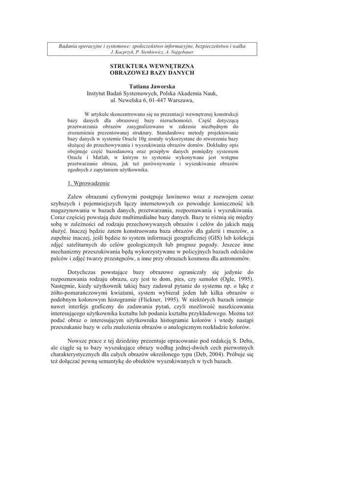 Badania operacyjne i systemowe: spo ecze!stwo informacyjne, bezpiecze!stwo i walka J. Kacprzyk, P. Sienkiewicz, A. Najgebauer STRUKTURA WEWN TRZNA OBRAZOWEJ BAZY DANYCH Tatiana Jaworska Instytut Bada Systemowych, Polska Akademia Nauk, ul. Newelska 6, 01-447 Warszawa, W artykule skoncentrowano si! na prezentacji wewn!trznej konstrukcji bazy danych dla obrazowej bazy nieruchomo"ci. Cz!"# dotycz$c$ przetwarzania obrazów zasygnalizowano w zakresie niezb!dnym do zrozumienia prezentowanej struktury. Standardowe metody projektowanie bazy danych w systemie Oracle 10g zosta%y wykorzystane do stworzenia bazy s%u&$cej do przechowywania i wyszukiwania obrazów domów. Dok%adny opis obejmuje cz!"# bazodanow$ oraz przep%yw danych pomi!dzy systemem Oracle i Matlab, w którym to systemie wykonywane jest wst!pne przetwarzanie obrazu, jak te& porównywanie i wyszukiwanie obrazów zgodnych z zapytaniem u&ytkownika. 1. Wprowadzenie Zalew obrazami cyfrowymi post!puje lawinowo wraz z rozwojem coraz szybszych i pojemniejszych %$czy internetowych co powoduje konieczno"# ich magazynowania w bazach danych, przetwarzania, rozpoznawania i wyszukiwania. Coraz cz!"ciej powstaj$ du&e multimedialne bazy danych. Bazy te ró&ni$ si! mi!dzy sob$ w zale&no"ci od rodzaju przechowywanych obrazów i celów do jakich maj$ s%u&y#. Inaczej b!dzie zatem konstruowana baza obrazów dla galerii i muzeów, a zupe%nie inaczej, je"li b!dzie to system informacji geograficznej (GIS) lub kolekcja zdj!# satelitarnych do celów geologicznych lub prognoz pogody. Jeszcze inne mechanizmy przeszukiwania b!d$ wykorzystywane w policyjnych bazach odcisków palców i zdj!# twarzy przest!pców, a inne przy obrazach kosmosu dla astronomów. Dotychczas powstaj$ce bazy obrazowe ogranicza%y si! jedynie do rozpoznawania rodzaju obrazu, czy jest to dom, pies, czy samolot (Ogle, 1995). Nast!pnie, kiedy u&ytkownik takiej bazy zadawa% pytanie do systemu np. o %$k! z &ó%to-pomara czowymi kwiatami, system wybiera% jeden lub kilka obrazów o podobnym kolorowym histogramie (Flickner, 1995). W niektórych bazach istnieje nawet interfejs graficzny do zadawania pyta , czyli mo&liwo"# naszkicowania interesuj$cego u&ytkownika kszta%tu lub podania kszta%tu przyk%adowego. Mo&na te& poda# obraz o interesuj$cym u&ytkownika histogramie kolorów i wtedy nast$pi przeszukanie bazy w celu znalezienia obrazów o analogicznym rozk%adzie kolorów. Nowsze prace z tej dziedziny prezentuje opracowanie pod redakcj$ S. Deba, ale ci$gle s$ to bazy wyszukuj$ce obrazy wed%ug jednej-dwóch cech pierwotnych charakterystycznych dla ca%ych obrazów okre"lonego typu (Deb, 2004). Próbuje si! te& do%$cza# pewn$ semantyk! do obiektów wyszukiwanych w tych bazach. T. Jaworska Celem budowanego przez nas systemu jest wspomaganie klientów szukaj$cych odpowiedniego dla nich, a istniej$cego ju& domu na podstawie zdj!# posiadanych przez agencje nieruchomo"ci. Nie jest natomiast celem (na razie) stworzenie systemu komercyjnego, mieszcz$cego wszystkie informacje na temat nieruchomo"ci takie jak: cena, metra&, po%o&enie, itp. Zak%adamy jednak, &e w miar! rozwoju tego systemu struktura bazy danych umo&liwi dodanie informacji wymaganych przez konkretn$ agencj!. Na obecnym etapie system s%u&y do testowania okre"lonych algorytmów ukierunkowanych na wyszukiwanie obrazów. System obejmuje wyszukiwanie obrazu na podstawie poszczególnych jego elementów architektonicznych zgodnie z graficznym zapytaniem u&ytkownika. W multimedialnym interfejsie systemu pokazuj$ si! poszczególne elementy uporz$dkowane w okre"lone kategorie (oddzielnie dachy, okna, drzwi, itp.), z których u&ytkownik mo&e, jak z puzzli u%o&y#, swój dom. System uwzgl!dnia nie tylko cechy pierwotne, ale te& lokalizacj! poszczególnych elementów wzgl!dem siebie. Na ca%y system sk%adaj$ si! trzy podstawowe bloki: blok przetwarzaj$cy obraz (dokonuj$cy segmentacji obrazu), napisany w Matlabie, baza danych, pod kontrol$ systemu Oracle, przechowuj$ca informacje o ca%ych obrazach, o ich segmentach (zwanych przez nas obiektami) oraz ich atrybutach, jak te& o lokalizacji obiektów, graficzny interfejs u&ytkownika dost!pny poprzez przegl$dark! WWW. 2. Ca%kowita struktura obrazowej bazy danych W naszym projekcie wykorzystywane s$ kolorowe fotografie domów jednorodzinnych pobrane z Internetu w formacie JPEG. Mechanizmy analizy obrazu s$ zaimplementowane za pomoc$ pakietu MatLab (wersja 2008a) ze wspomaganiem nast!puj$cych ToolBoxów: Image Processing, Fuzzy, Statistics, Wavelet i Data Base. Baza danych zosta%a przygotowana z u&yciem Oracle Designera wersja 6i i zrealizowana w Oracle’u wersja 10g, natomiast interfejs u&ytkownika stanowi strona WWW, generowana przez skrypt napisany w Perlu. Ka&dy nowy obraz do%$czany do bazy przechodzi obróbk! wst!pn$, na Rys. 1 przedstawion$ w segmencie analizy zawarto"ci obrazu jako selekcja cech. W ramach tego przygotowania wydzielane s$ wszystkie interesuj$ce nas elementy architektoniczne (takie jak okna, drzwi, dachy, itp.) oraz oddzielane s$ one od otoczenia. W sytuacji, w której kolorowe obrazy domów s$ pobierane z Internetu i ich wst!pna obróbka jest prowadzona w sposób nienadzorowany, kluczowym zagadnieniem staje si! takie wyekstrahowanie obiektów z obrazu, &eby nie trzeba by%o ingerowa# w dalsze etapy w%$czania tych obrazów do bazy danych. W tym celu stosujemy dwu-etapow$ segmentacj! umo&liwiaj$c$ dok%adne wydzielenie interesuj$cych nas obiektów z obrazu. W pierwszym etapie obraz jest dzielony na pojedyncze kolorowe warstwy RGB wed%ug trzech poziomów jasno"ci. W drugim etapie z poszczególnych warstw wydziela si! ju& pojedyncze obiekty, które odpowiadaj$ elementom architektonicznym domów. Dla ka°o obiektu (rozumia98 Struktura wewn"trzna obrazowej bazy danych 99 T. Jaworska Rys. 1. Ogólny schemat obrazowej bazy danych nego jako fragment ca%ego obrazu) wyznaczane s$ nast!puj$ce cechy pierwotne: powierzchnia, kolor, momenty bezw%adno"ci, "rodek ci!&ko"ci, mimo"ród, parametry tekstury, itp. Algoryt