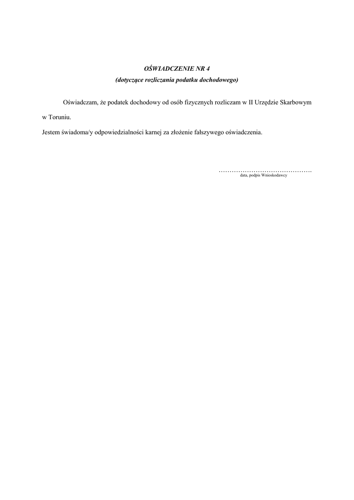 OŚWIADCZENIE NR 4 (dotyczące rozliczania podatku dochodowego) Oświadczam, że podatek dochodowy od osób fizycznych rozliczam w II Urzędzie Skarbowym w Toruniu. Jestem świadoma/y odpowiedzialności karnej za złożenie fałszywego oświadczenia. ……………………………………. data, podpis Wnioskodawcy