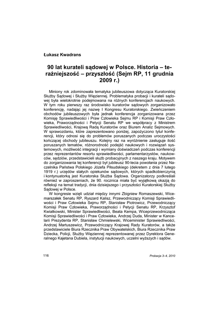 Ł. Kwadrans Łukasz Kwadrans 90 lat kurateli sądowej w Polsce. Historia – teraźniejszość – przyszłość (Sejm RP, 11 grudnia 2009 r.) Miniony rok zdominowała tematyka jubileuszowa dotycząca Kuratorskiej SłuŜby Sądowej i SłuŜby Więziennej. Problematyka probacji i kurateli sądowej była wielokrotnie podejmowana na róŜnych konferencjach naukowych. W tym roku pierwszy raz środowisko kuratorów sądowych zorganizowało konferencję, nadając jej nazwę I Kongresu Kuratorskiego. Zwieńczeniem obchodów jubileuszowych była jednak konferencja zorganizowana przez Komisję Sprawiedliwości i Praw Człowieka Sejmu RP i Komisji Praw Człowieka, Praworządności i Petycji Senatu RP we współpracy z Ministrem Sprawiedliwości, Krajową Radą Kuratorów oraz Biurem Analiz Sejmowych. W sprawozdaniu, które zaprezentowano poniŜej, zapoŜyczono tytuł konferencji, który odnosi się do problemów poruszanych podczas uroczystości kończącej obchody jubileuszu. Kolejny raz na wyróŜnienie zasługuje ilość poruszanych tematów, róŜnorodność podejść naukowych i rozwiązań systemowych, moŜliwość integracji i wymiany doświadczeń podczas konferencji przez reprezentantów resortu sprawiedliwości, parlamentarzystów, naukowców, sędziów, przedstawicieli słuŜb probacyjnych z naszego kraju. Motywem do zorganizowania tej konferencji był jubileusz 90-lecia powołania przez Naczelnika Państwa Polskiego Józefa Piłsudskiego (dekretem z dnia 7 lutego 1919 r.) urzędów stałych opiekunów sądowych, których spadkobierczynią i kontynuatorką jest Kuratorska SłuŜba Sądowa. Organizatorzy podkreślali równieŜ w zaproszeniach, Ŝe 90. rocznica miała być wyjątkową okazją do refleksji na temat tradycji, dnia dzisiejszego i przyszłości Kuratorskiej SłuŜby Sądowej w Polsce. W kongresie wzięli udział między innymi Zbigniew Romaszewski, Wicemarszałek Senatu RP, Ryszard Kalisz, Przewodniczący Komisji Sprawiedliwości i Praw Człowieka Sejmu RP, Stanisław Piotrowicz, Przewodniczący Komisji Praw Człowieka, Praworządności i Petycji Senatu RP, Krzysztof Kwiatkowski, Minister Sprawiedliwości, Beata Kempa, Wiceprzewodnicząca Komisji Sprawiedliwości i Praw Człowieka, Andrzej Duda, Minister w Kancelarii Prezydenta RP, Stanisław Chmielewski, Wiceminister Sprawiedliwości, Andrzej Martuszewicz, Przewodniczący Krajowej Rady Kuratorów, a takŜe przedstawiciele Biura Rzecznika Praw Obywatelskich, Biura Rzecznika Praw Dziecka, Policji, SłuŜby Więziennej reprezentowanej przez Dyrektora Generalnego Kajetana Dubiela, instytucji naukowych, uczelni wyŜszych i sądów. 116 Probacja 3–4, 2010 90 lat kurateli sądowej w Polsce... Konferencja była nie tylko miejscem debaty naukowej, ale takŜe pozwoliła celebrować jubileusz poprzez spotkanie kuratorów sądowych, nadanie odznaczeń państwowych i resortowych oraz Ŝyczenia i wypowiedzi parlamentarzystów, a takŜe przedstawicieli Ministerstwa Sprawiedliwości. Głównymi obszarami zainteresowań naukowych konferencji organizatorzy uczynili następujące tematy: „Miejsce kurateli w realizacji polityki karnej w Polsce” – prof. Teodor Szymanowski; „Kurator sądowy jako organ postępowania wykonawczego” – prof. Stefan Lelental; „Resocjalizacyjna rola kuratora sądowego. Nadzieje a rzeczywistość” – prof. Marek Konopczyński; „Etos pracy kuratora sądowego” – prof. Jarosław Utrat-Milecki. Całość obrad konferencji była prowadzona przez Przewodniczących Komisji Sejmu i Senatu RP. Senator Zbigniew Romaszewski dokonał oficjalnego otwarcia konferencji. W pierwszych słowach swego wystąpienia powitał zgromadzonych gości, aby potem dokonać krótkiej analizy funkcjonującej polityki karnej oraz roli kurateli dla dorosłych i kurateli społecznej. Następnie głos zabrał poseł Ryszard Kalisz, odnosząc się do historii kurateli sądowej. Zwrócił równieŜ uwagę na wymiar kurateli w procesie resocjalizacji oraz trudności związane z warunkami wykonywania pracy przez kuratorów sądowych. Minister Sprawiedliwości Krzysztof Kwiatkowski rozpoczął swoje wystąpienie od rysu historycznego oraz zestawienia statystyk dotyczących kurateli. Podziękował ok. 35 tysiącom kuratorów sądowych w Polsce i podkreślił, Ŝe zajmują się oni milionami osób (podopiecznych). Dziękując, nawiązał do tegorocznych wydarzeń, I Kongresu Kuratorskiego w Ustce i wypowiedzi przedmówców, polityki karnej, stanu więziennictwa, kar alternatywnych. Minister zwrócił uwagę na konieczność współdziałania w ramach prowadzonej polityki karnej państwa. Przypomniał o znaczeniu Kuratorskiej SłuŜby Sądowej i 90 latach historii, a takŜe wskazał akty prawne dotyczące kurateli. Wspominał datę wprowadzenia nazwy „kurator sądowy”, ewolucję kurateli sądowej, powstanie kurateli dla dorosłych. Odniósł się równieŜ do prac nad reformą kurateli sądowej, ustawy o kuratorach sądowych. Dokonał teŜ charakterystyki osób, które pełnią obowiązki kuratorów sądowych, i zapewniał o utrzymaniu dotychczasowego modelu kurateli sądowej oraz jej właściwego funkcjonowania w obecnych warunkach. Na koniec swojego wystąpienia Minister Krzysztof Kwiatkowski podziękował za współpracę Przewodniczącemu Andrzejowi Martuszewiczowi i Krajowej Radzie Kuratorów. Następnie głos zabrał wspomniany przez ministra Przewodniczący KRK Andrzej Martuszewicz, który przywitał wszystkich obecnych i odniósł się do wystąpień poprzedników. Wspomniał, Ŝe pominie rys historyczny i wiele kwestii zawartych w wystąpieniach przedmówców. Wskazał na przekazane wcześniej uczestnikom konferencji materiały z jego referatem. Przewodniczący KRK skrócił swoje wystąpienie do najwaŜniejszych zagadnień. Odniósł się przede wszystkim do najwaŜniejszych wyzwań dla kurateli sądowej, statystyk doty- Probacja 3–4, 2010 117 Ł. Kwadrans czących pracy, kosztów z tym związanych. Zwrócił równieŜ uw