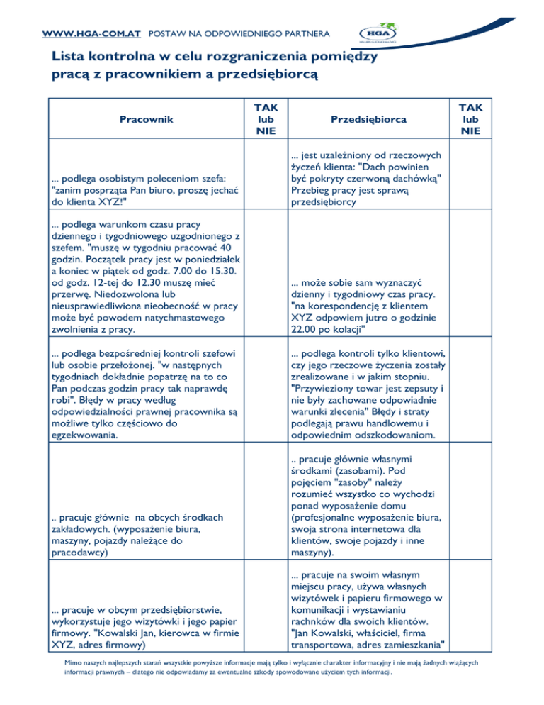 WWW.HGA-COM.AT POSTAW NA ODPOWIEDNIEGO PARTNERA Lista kontrolna w celu rozgraniczenia pomiędzy pracą z pracownikiem a przedsiębiorcą Pracownik TAK lub NIE Przedsiębiorca ... podlega osobistym poleceniom szefa: "zanim posprząta Pan biuro, proszę jechać do klienta XYZ!" ... jest uzależniony od rzeczowych życzeń klienta: "Dach powinien być pokryty czerwoną dachówką" Przebieg pracy jest sprawą przedsiębiorcy ... podlega warunkom czasu pracy dziennego i tygodniowego uzgodnionego z szefem. "muszę w tygodniu pracować 40 godzin. Początek pracy jest w poniedziałek a koniec w piątek od godz. 7.00 do 15.30. od godz. 12-tej do 12.30 muszę mieć przerwę. Niedozwolona lub nieusprawiedliwiona nieobecność w pracy może być powodem natychmastowego zwolnienia z pracy. ... może sobie sam wyznaczyć dzienny i tygodniowy czas pracy. "na korespondencję z klientem XYZ odpowiem jutro o godzinie 22.00 po kolacji" ... podlega bezpośredniej kontroli szefowi lub osobie przełożonej. "w następnych tygodniach dokładnie popatrzę na to co Pan podczas godzin pracy tak naprawdę robi". Błędy w pracy według odpowiedzialności prawnej pracownika są możliwe tylko częściowo do egzekwowania. ... podlega kontroli tylko klientowi, czy jego rzeczowe życzenia zostały zrealizowane i w jakim stopniu. "Przywieziony towar jest zepsuty i nie były zachowane odpowiadnie warunki zlecenia" Błędy i straty podlegają prawu handlowemu i odpowiednim odszkodowaniom. .. pracuje głównie na obcych środkach zakładowych. (wyposażenie biura, maszyny, pojazdy należące do pracodawcy) .. pracuje głównie własnymi środkami (zasobami). Pod pojęciem "zasoby" należy rozumieć wszystko co wychodzi ponad wyposażenie domu (profesjonalne wyposażenie biura, swoja strona internetowa dla klientów, swoje pojazdy i inne maszyny). ... pracuje w obcym przedsiębiorstwie, wykorzystuje jego wizytówki i jego papier firmowy. "Kowalski Jan, kierowca w firmie XYZ, adres firmowy) ... pracuje na swoim własnym miejscu pracy, używa własnych wizytówek i papieru firmowego w komunikacji i wystawianiu rachnków dla swoich klientów. "Jan Kowalski, właściciel, firma transportowa, adres zamieszkania" TAK lub NIE Mimo naszych najlepszych starań wszystkie powyższe informacje mają tylko i wyłącznie charakter informacyjny i nie mają żadnych wiążących informacji prawnych – dlatego nie odpowiadamy za ewentualne szkody spowodowane użyciem tych informacji. WWW.HGA-COM.AT POSTAW NA ODPOWIEDNIEGO PARTNERA ... jest włączony do organizacji obcego przedsiębiorstwa. "regularnie biorę udział w spotkaniach i rozmowach w firmie, mam własne miejsce pracy, muszę czas pracy kontrolować" ... organizuje siebie sam. "jestem sobie sam szefem, umawiam terminy spotkań i rozmów z moimi zleceniodawcami według mojego kalendarza terminów w różnych miejscach i w moim biurze; gdzie i ile pracuję jest to moja sprawa" ... otrzymuje płacę za to, że samego siebie i swoją siłę roboczą daje do dyspozycji obcemu przedsiębiorstwu. Zadaniem szefa jest pracownika odpowiednio zadysponować. "wczoraj otrzymałem wypłatę 2.000,- mimo, że niewiele w tym miesiącu pracowałem ze względów pogodowych" Jeżeli pracodawca nie potrzebuje pracownika z powodów np. złej koniunktury lub nie jest zadowolony z jego wydajności może go zwolnić. ... otrzymuje zapłatę za to, że klientowi wykonał konkretną usługę. (za usługę transportu .............. w dniach z ..... do ..... cena 2.000,-€ ). Jeżeli klient jest z usługi niezadowolony - nie zatrudni więcej tego samego przedsiębiorcę, ewentualnie będzie dochodził odszkodowania. ... musi swoją pracę wykonać osobiście. "Najchętniej wysłałbym mojego brata dzisiaj na rozmowę z moim szefem" ... może być reprezentowany przez innego przedsiębiorcę lub przez jego pracowników. "dzisiejsze zlecenie w firmie XYZ nie mogę wykonać sam ponieważ nie wyrobiłem się jeszcze z poprzednim zleceniem i wyślę innego podwykonawcę" ... nie może pracować dla konkurencji. (w mojej umowie stoi, że nie mogę pracować dla konkurencji) Razem punkty ... może pracować dla wszystkich klientów bez względu od zależności. "Wykonałem zlecenia transportu dla firmy XYZ tak szybko, że poleciła mnie swojej filii w innym kraju i teraz będę tylko dla niej ładunki transportowaŁ" Mimo naszych najlepszych starań wszystkie powyższe informacje mają tylko i wyłącznie charakter informacyjny i nie mają żadnych wiążących informacji prawnych – dlatego nie odpowiadamy za ewentualne szkody spowodowane użyciem tych informacji.
