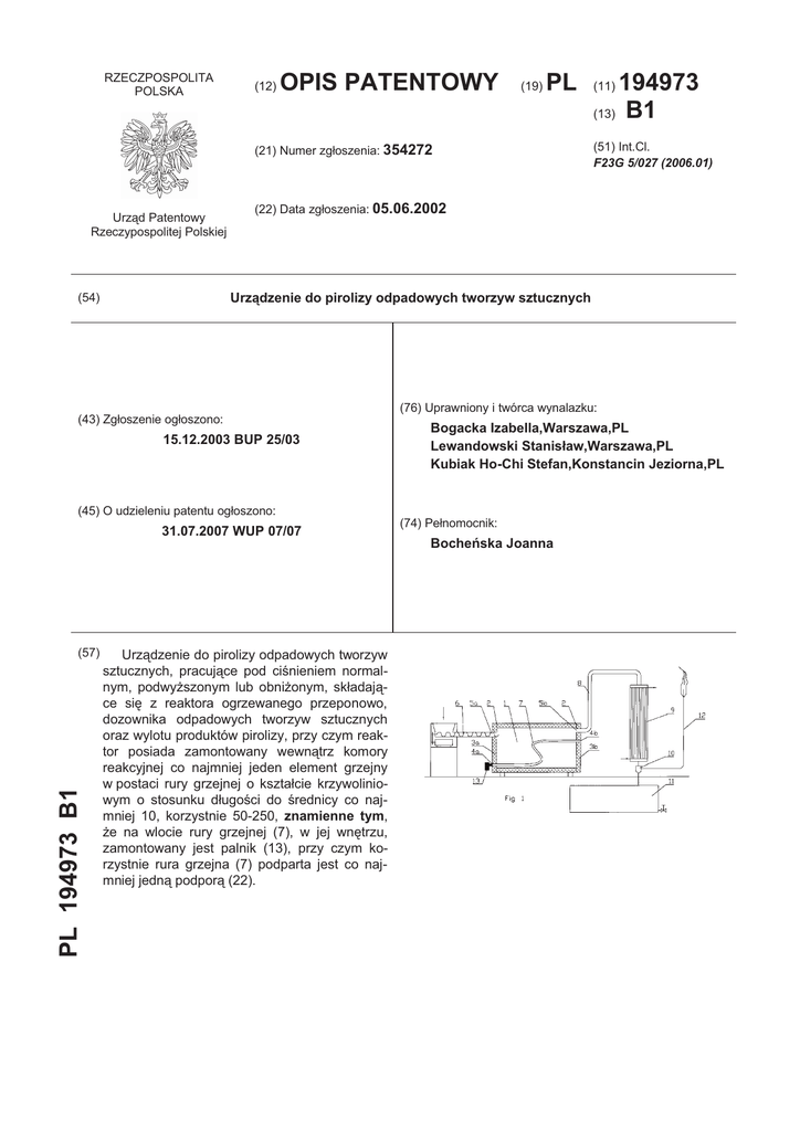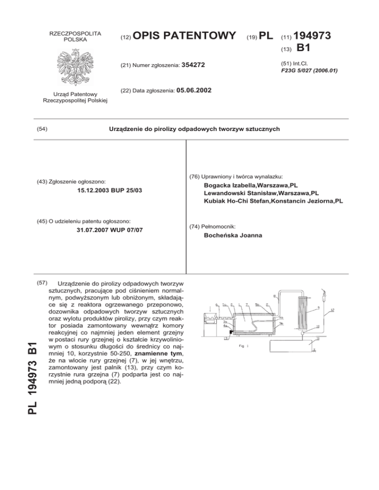 RZECZPOSPOLITA POLSKA (12) OPIS PATENTOWY (19) PL (21) Numer zgłoszenia: 354272 Urząd Patentowy Rzeczypospolitej Polskiej (54) Urządzenie do pirolizy odpadowych tworzyw sztucznych 15.12.2003 BUP 25/03 (45) O udzieleniu patentu ogłoszono: 31.07.2007 WUP 07/07 PL 194973 B1 (51) Int.Cl. F23G 5/027 (2006.01) (22) Data zgłoszenia: 05.06.2002 (43) Zgłoszenie ogłoszono: (57) 194973 (13) B1 (11) Urządzenie do pirolizy odpadowych tworzyw sztucznych, pracujące pod ciśnieniem normalnym, podwyższonym lub obniżonym, składające się z reaktora ogrzewanego przeponowo, dozownika odpadowych tworzyw sztucznych oraz wylotu produktów pirolizy, przy czym reaktor posiada zamontowany wewnątrz komory reakcyjnej co najmniej jeden element grzejny w postaci rury grzejnej o kształcie krzywoliniowym o stosunku długości do średnicy co najmniej 10, korzystnie 50-250, znamienne tym, że na wlocie rury grzejnej (7), w jej wnętrzu, zamontowany jest palnik (13), przy czym korzystnie rura grzejna (7) podparta jest co najmniej jedną podporą (22). (76) Uprawniony i twórca wynalazku: Bogacka Izabella,Warszawa,PL Lewandowski Stanisław,Warszawa,PL Kubiak Ho-Chi Stefan,Konstancin Jeziorna,PL (74) Pełnomocnik: Bocheńska Joanna 2 PL 194 973 B1 Opis wynalazku Przedmiotem wynalazku jest urządzenie do pirolizy odpadowych tworzyw sztucznych, pracujące pod ciśnieniem normalnym, podwyższonym lub obniżonym. W Polsce zużycie tworzyw sztucznych jest dużo mniejsze niż w krajach wysoko uprzemysłowionych, ilość odpadów tworzyw sztucznych powstających w kraju i wymagających utylizacji jest znacznie większa, niż wynikałoby to z ilości przetwarzanych tworzyw. Na rynek krajowy trafia dodatkowo duża ilość opakowań towarów i wyrobów, często krótkotrwałego użytku. Wielkość ta jest trudna do oszacowania, ale w sumie ilość odpadów tworzyw sztucznych nie jest mniejsza niż 500 - 800 tys.t/rok. Opakowania z tworzyw sztucznych po wykorzystaniu prawie w 100% trafiają do odpadów komunalnych. Problem wykorzystania odpadowych tworzyw sztucznych natrafia na problemy już na etapie ich selekcjonowania. W Polsce do dziś nie skupuje się opakowań z tworzyw sztucznych w sposób systemowy. Są one razem z innymi odpadami kierowane na wysypiska. Selekcja śmieci na wysypiskach w Polsce odbywa się w zasadzie wyłącznie w sposób ręczny. Forma odpadów, rodzaj i stopień ich zanieczyszczenia zależą od źródła ich powstawania. Odpady z tworzyw sztucznych powstałe jako poużytkowe z różnych dziedzin gospodarki są wspólnie gromadzone i wymagają oczyszczenia i rozdzielenia. Także zbieranie odpadów bezpośrednio u użytkownika nie gwarantuje ich czystości. Szczególnie uciążliwe i kosztowne jest jednak odzyskiwanie tworzyw z odpadów komunalnych, gdyż wymaga dużych nakładów na sortowanie i oczyszczanie. Podstawą każdego sposobu rozdzielania mieszaniny odpadów tworzyw sztucznych jest identyfikacja poszczególnych składników. W wielu ośrodkach są prowadzone próby wykorzystania do tego celu np. spektrometrii masowej, spektroskopii fluorescencji rentgenowskiej, spektroskopii w bliskiej podczerwieni, spektroskopii neutronowej, metod optycznych i termooptycznych. Niektóre z tych metod znalazły już zastosowanie praktyczne. Wybór sposobu rozdziału zależy od tego, czy ma się do czynienia z odpadami w całości, kawałkach, czy też są to odpady już bardzo rozdrobnione. Odpady transportowane przenośnikiem są rozdzielane ręcznie przez załogę lub mechanicznie za pomocą specjalnych urządzeń optoelektronicznych. Po wstępnym rozdrobnieniu mieszaniny odpadów konieczne jest oddzielenie zanieczyszczeń, możliwych do usunięcia za pomocą klasyfikatora powietrznego bądź magnesów (metale) oraz dalsze rozdrobnienie. Kolejnym etapem jest usunięcie składników mineralnych cięższych od wody myjącej (piasek, glina, ziemia), zanieczyszczeń zdolnych do flotacji (drewno, papier, tytoń) lub też składników rozpuszczalnych (sole, tłuszcze, proszek mleczny). Odpady tworzyw sztucznych mogą też być rozdrabniane na mokro. Do segregacji tworzyw sztucznych wykorzystywane są różnice w niektórych ich właściwościach fizycznych lub chemicznych, takich jak gęstość właściwa, stała dielektryczna, rozpuszczalność, zwilżalność, przewodność cieplna i dielektryczna, temperatura mięknienia itp. W metodzie flotacyjnej mieszanina typowych termoplastów opakowaniowych poddana flotacji rozdziela się na pływającą frakcję poliolefinową (PE-HD, PE-LD i PP) oraz na frakcję opadającą (PVC, PS i PA). Wadą tej metody jest brak rozdziału na poszczególne rodzaje tworzyw. Metoda rozdziału w hydrocyklonach, działających na zasadzie dużej siły odśrodkowej jest metodą znacznie wydajniejszą, ale również ona nie pozwala wyodrębnić poszczególnych polimerów. Metody, w których wykorzystuje się różnice gęstości są najczęściej stosowane do oddzielania poliolefin (PE i PP) od innych polimerów o większej gęstości, natomiast rozdział PVC od PET bądź PE od PP za pomocą tej techniki jest już zupełnie niemożliwy. Niekompatybilność termodynamiczna tworzyw, będąca przyczyną ich ograniczonej mieszalności, stwarza możliwość rozdzielenia tworzyw na drodze selektywnego rozpuszczania. (Rensselaer Polytechnic Institute, Troy, Nowy Jork). Istota metody polega na sukcesywnym rozpuszczaniu przez rozpuszczalnik kolejnych składników mieszaniny tworzyw. Metodą tą stopniowo odzyskuje się zawarte w mieszaninie polimery. Ogólnie można wyróżnić trzy metody ponownego wykorzystania odpadów tworzyw sztucznych: recykling materiałowy, tj. ponowne, bezpośrednie przetwarzanie odpadów bez stosowania procesów chemicznych z uzyskaniem materiału stanowiącego pełnowartościowy surowiec do dalszego przetwarzania, recykling surowcowy tj. degradacja cząsteczek na frakcje o mniejszej masie cząsteczkowej, które mogą być następnie ponownie użyte jako monome