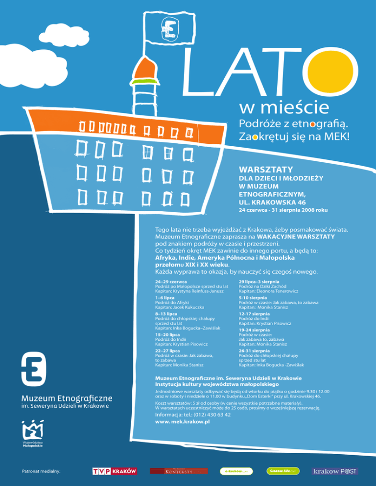 Podróże z etnografią. Zaokrętuj się na MEK! Warsztaty dla dzieci i młodzieży w Muzeum Etnograficznym, ul. Krakowska 46 24 czerwca - 31 sierpnia 2008 roku Tego lata nie trzeba wyjeżdżać z Krakowa, żeby posmakować świata. Muzeum Etnograficzne zaprasza na wakacyjne warsztaty pod znakiem podróży w czasie i przestrzeni. Co tydzień okręt MEK zawinie do innego portu, a będą to: Afryka, Indie, Ameryka Północna i Małopolska przełomu XIX i XX wieku. Każda wyprawa to okazja, by nauczyć się czegoś nowego. 24–29 czerwca Podróż po Małopolsce sprzed stu lat Kapitan: Krystyna Reinfuss-Janusz 29 lipca–3 sierpnia Podróż na Dziki Zachód Kapitan: Eleonora Tenerowicz 1–6 lipca Podróż do Afryki Kapitan: Jacek Kukuczka 5-10 sierpnia Podróż w czasie: Jak zabawa, to zabawa Kapitan: Monika Stanisz 8–13 lipca Podróż do chłopskiej chałupy sprzed stu lat Kapitan: Inka Bogucka–Zawiślak 12-17 sierpnia Podróż do Indii Kapitan: Krystian Pisowicz 15–20 lipca Podróż do Indii Kapitan: Krystian Pisowicz 19-24 sierpnia Podróż w czasie: Jak zabawa to, zabawa Kapitan: Monika Stanisz 22–27 lipca Podróż w czasie: Jak zabawa, to zabawa Kapitan: Monika Stanisz 26-31 sierpnia Podróż do chłopskiej chałupy sprzed stu lat Kapitan: Inka Bogucka -Zawiślak Muzeum Etnograficzne im. Seweryna Udzieli w Krakowie Instytucja kultury województwa małopolskiego Jednodniowe warsztaty odbywać się będą od wtorku do piątku o godzinie 9.30 i 12.00 oraz w soboty i niedziele o 11.00 w budynku „Dom Esterki” przy ul. Krakowskiej 46. Koszt warsztatów: 5 zł od osoby (w cenie wszystkie potrzebne materiały). W warsztatach uczestniczyć może do 25 osób, prosimy o wcześniejszą rezerwację. Informacja: tel.: (012) 430 63 42 www. mek.krakow.pl Patronat medialny: EKRAKOW#Xdb #RACOW,IFE#Xdb krakow FEIJ