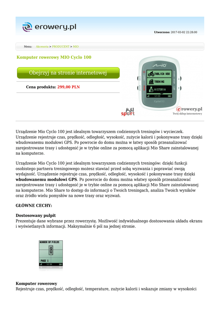 Utworzono: 2017-03-02 22:28:00 Menu: Akcesoria > PRODUCENT > MIO Komputer rowerowy MIO Cyclo 100 Obejrzyj na stronie internetowej Cena produktu: 299,00 PLN Urządzenie Mio Cyclo 100 jest idealnym towarzyszem codziennych treningów i wycieczek. Urządzenie rejestruje czas, prędkość, odległość, wysokość, zużycie kalorii i pokonywane trasy dzięki wbudowanemu modułowi GPS. Po powrocie do domu można w łatwy sposób przeanalizować zarejestrowane trasy i udostępnić je w trybie online za pomocą aplikacji Mio Share zainstalowanej na komputerze. Urządzenie Mio Cyclo 100 jest idealnym towarzyszem codziennych treningów: dzięki funkcji osobistego partnera treningowego możesz stawiać przed sobą wyzwania i poprawiać swoją wydajność. Urządzenie rejestruje czas, prędkość, odległość, wysokość i pokonywane trasy dzięki wbudowanemu modułowi GPS. Po powrocie do domu można włatwy sposób przeanalizować zarejestrowane trasy i udostępnić je w trybie online za pomocą aplikacji Mio Share zainstalowanej na komputerze. Mio Share to dostęp do informacji o Twoich treningach, analiza Twoich wyników oraz źródło wielu pomysłów na nowe trasy oraz wyzwań. GŁÓWNE CECHY: Dostosowany pulpit Prezentuje dane wybrane przez rowerzystę. Możliwość indywidualnego dostosowania układu ekranu i wyświetlanych informacji. Maksymalnie 6 pól na jednej stronie. Komputer rowerowy Rejestruje czas, prędkość, odległość, temperature, zużycie kalorii i wskazuje zmiany w wysokości oraz dostarcza wyjątkowo precyzyjnych danych dotyczących kąta nachylenia terenu w górę i w dół. Aplikacja Mio Share Przy użyciu aplikacji Mio Share możesz zapisywać swoje dane, zarządzać przebytymi trasami i udostępniać je znajomym. Ta łatwa w użyciu aplikacja umożliwia pobieranie tras oraz poznawanie nowych dróg i miejsc, które inni użytkownicy uznali za interesujące. Aplikacja umożliwia także zarządzanie urządzeniem oraz pobieranie aktualizacji map i najnowszych informacji o produktach. Aplikacja bezpośrednio przesyła dane do Strava, TreiningPeaks, Endomondo, Today's Plans. Bateria o dużej żywotności Dzięki długiemu czasowi pracy akumulatora, wynoszącemu do 18 godzin, można pokonywać dłuższe dystanse bez martwienia się o konieczność jego ponownego naładowania. Wodoodporna obudowa (standard IPX7) Wytrzymała, wodoodporna obudowa (standard IPX7) sprawia, że nawigacja jest możliwa w każdych warunkach pogodowych. Łatwe w użyciu Z urządzenia można korzystać natychmiast po wyjęciu z opakowania i zamontowaniu na rowerze w układzie poziomym lub pionowym. Wyposażone w uchwyt, który pozwala zamocować urządzenie na kierownicy lub mostku Programy treningowe Programy treningowe — stawiaj sobie wyzwania i trenuj - zarówno w terenie jak i w pomieszczeniach. Funkcje rowerowe: -prędkość aktualna -prędkość średnia -prędkość maksymalna -odległość -prędkość w zone -PACE AVG (min/km) -PACE BEST -PACE INZN -tempo -licznik kalorii -kalorie Funkcje wysokości: -aktualna wysokość -max. wysokość -min. wysokość -nachylenie terenu w % (odświeżanie danych co 20/45/90 s) -prędkość wznoszenia m/h -łącznie w górę -łącznie w dół Łączność z komputerem: -łączność poprzez mini USB -transmisja danych z urządzenia do komputera za pomocą CYCLO AGENT -szczegółowa analiza danych w programie Mio Share -możliwość eksportu danych do Strava, TreiningPeaks, Endomondo, Today's Plans -łączność z komputerami PC/MAC Funkcje czasu: -czas treningu -czas dzienny -format daty do wyboru -alarm (budzik) -czas letni wł/wył -format czasu 12h/24h -konfiguracja strefy czasowej Funkcje okążeń: -numer bieżącego okrążenia -czas okrążenia -międzyczas -odległość okrążenia -tempo okrążenia -prędkość okrążenia -automatyczny start na podstawie czasu/odległości Funkcje nawigacji: -dwa tryby wyświetlania śladu -tryb powtórzenia trasy -kierunek -ostrzeżenie przed zjechaniem z trasy -jazda w przód i wstecz tras -pozostała odległość Dodatkowe informacje: -konfigurowalny wyświetlacz 2-6 pola danych na 1 stronie -możliwość personalizacji wyświetlanych funkcji -funkcje treningu -wskaźnik baterii -menu w języku polskim -automatyczna pauza -podświetlenie wyświetlacza -orientacja pozioma/pionowa -możliwość wł/wył alarmów przekroczeń czas/odległość, prędkość/tempo -ustawienia kontrastu wyświetlacza -ustawienie czasu podświetlenia -jednostki km / mile -wodoszczelny - IPX7 -alerty dźwiękowe wł/wył -konfiguracja poziomu treningu -opcja dodatkowego obciążenia treningowego w kg -czytelne ikony ekranowe -bardzo dokładny sygnał GPS (obsługuję WAAS/EGNOS) -profile użytkownika -czas zapisu danych (w sekundach) OPAKOWANIE ZAWIERA: -kabel USB -ładowarka domowa -uchwyt na kierownice Producent Rodzaj Akcesoria MIO Komputer rowerowy GPS - Mimo dołożenia wszelkich starań nie gwarantujemy, że publikowane opisy i specyfikacje techniczne niezawierają uchybień lub błędów, które nie mogą jednak być podstawą do roszczeń. W przypadku jakichkolwiek wątpliwości, przed podjęciem decyzji prosimy o kontakt. Adres: www.erowery.pl Telefon: 605 515 185, 34 361 16 71 Email: [email protected]