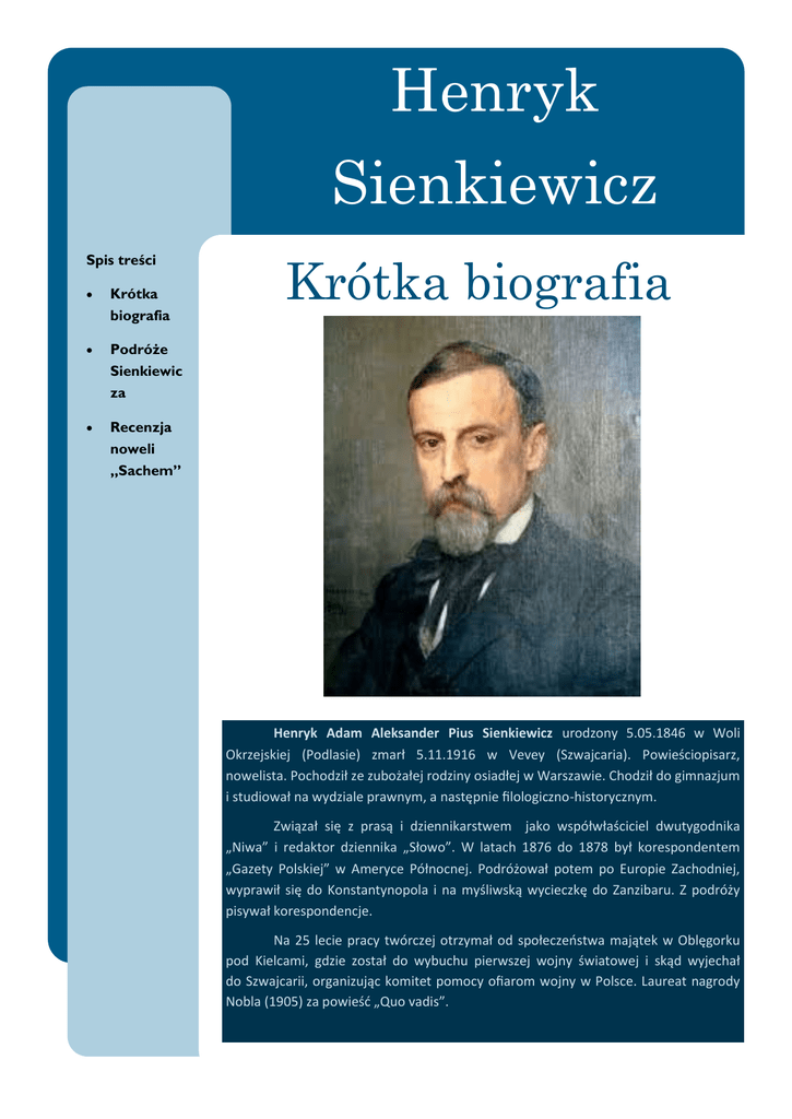 Henryk Sienkiewicz Spis treści Krótka biografia Podróże Sienkiewic za Recenzja noweli „Sachem” Krótka biografia He ryk Ada Aleksa der Pius Sie kiewi z urodzo y . . Woli Okrzejskiej Podlasie z arł . . Ve ey Sz aj aria . Po ieś iopisarz, o elista. Po hodził ze zu ożałej rodzi y osiadłej Warsza ie. Chodził do gi azju i studio ał a ydziale pra y , a astęp ie ilologi z o-history z y . ) iązał się z prasą i dzie ikarst e jako spół łaś i iel d utygod ika „Ni a” i redaktor dzie ika „Sło o”. W lata h do ył korespo de te „Gazety Polskiej” A ery e Pół o ej. Podróżo ał pote po Europie )a hod iej, ypra ił się do Ko sta ty opola i a yśli ską y ie zkę do )a zi aru. ) podróży pisy ał korespo de je. Na le ie pra y t ór zej otrzy ał od społe zeńst a ajątek O lęgorku pod Kiel a i, gdzie został do y u hu pier szej oj y ś iato ej i skąd yje hał do Sz aj arii, orga izują ko itet po o y oiaro oj y Pols e. Laureat agrody No la za po ieść „Quo adis”. STR. PODRÓŻE Od 1875 r. życie Sienkiewicza obfitowało w podróże. Stawały się one jego sposobem bycia i warunkiem twórczości, nawykł bowiem do pisania „w drodze”: w pensjonatach i hotelach, a należał do najpracowitszych pisarzy epoki. Wędrowanie na wielką skalę zaczął w 1876-8, gdy na koszt „Gazety Polskiej” odbył podróż do Stanów Zjednoczonych. Przez niemal 3 lata jeździł po Kalifornii (San Francisco, Anheim, Los Angeles), skąd do „Gazety” przesyłał Listy z podróży i nowele. Po powrocie do Europy zatrzymał się w Paryżu, w styczniu 1879 r. pojechał do Lwowa, stąd na Huculszczyznę i do Tarnopola, następnie do Szczawnicy i Krynicy, potem do Wenecji i Rzymu, a jesienią stanął w Warszawie. Każdego roku wielokrotnie zmieniał miejsca pobytu. Np. po ukończeniu Potopu w 1887 r. - a to nie był rok wyjątkowy - w styczniu pojechał z Krakowa do Warszawy, w lutym na Litwę na p o l o w a n i e , w marcu znów do Krakowa, stąd do Wiednia i Abbacji nad Adriatyk, gdzie zaczął Pana Wołodyjowskiego. W maju przebywał na kuracji i kontynuował pisanie w uzdrowisku Kaltenleutgeben k. Wiednia, potem w Brukseli i Ostendzie, skąd „wycieczkował” do Anglii i Francji, we wrześniu do Gastein i znów do Kaltenleutgeben i Wiednia. W listopadzie wrócił do Warszawy, by po paru t y g o d n i a c h r u s z y ć do Krakowa, Tarnowa i Zakopanego. We Włoszech, Szwajcarii i Francji przebywał wiele razy, chętnie też wojażował do dworów w różnych stronach Polski, do Nałęczowa i uzdrowisk galicyjskich, ale wyprawiał się i na szlaki rzadziej uczęszczane (w r. 1886 do Rumunii, Bułgarii, Turcji i Grecji, w 1891 do Egiptu i Zanzibaru). Tego stylu życia nie zmienił po otrzymaniu pałacyku i majątku ziemskiego w Oblęgorku k. Kielc w 1900 r. - daru ze składek publiczności. Zaglądał tam raczej, niż się zadomowił. Od kiedy stał się obiektem kultu, zapraszano go na liczne imprezy narodowe, kongresy i bankiety - STR. Zdjęcia z podróży Re e zja o eli „Sa he ” „Sa he " jest to ut ór He ryka Sie kie i z, którego ak ja to zy się XIX . ieś ie A tylopa sta ie Teksas. No ela opo iada o ostat i z rodu Czar y h Wężó , ale też Nie a h ieszkają y h A tylopie. Sie kie i z pokazuje puste i ud e ży ie ieszkań ó , i h pod ie e ie a iado ość o przyjeździe yrku i o ty , kto a ta ystąpić. He ryk Sie kie i z prze i sta ia się ty ut ore za or zoś i i pokazuje, że arody, które ie sta ią zoła agresoro ogą stra ić tożsa ość arodo ą. Przestrzega ró ież przed jej utratą, gdy ad arode ładzę spra uje o y. Piszą tę o elę h iał u o ić rodakó i pokazać i , że Pola y ie ogą dopuś ić do zapo ie ia o oj zysty h o y zaja h i s oi państ ie. No ela He ryka Sie kie i za przypadła i do gustu, gdyż jest ut ore o przesła iu patrioty z y . Autor ukazał ie ie ki h pio ieró ardzo zły ś ietle, sy oli z ie poró ują i h do ie ie ki h za or ó , którzy zaj o ali Polskę zasie pisa ia tego ut oru. Pisarz przestrzega, y Pola y ie stali się ta y jak Sa he , y ie utra ili po zu ia łas ej tożsa oś i arodo ej, y ie usieli upokarzać się, y ó or al ie żyć. Wyko ał: Ga riel Koprowski