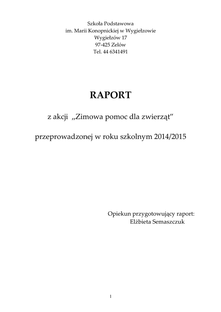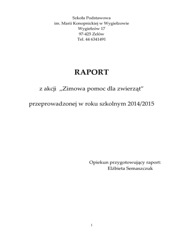 Szkoła Podstawowa im. Marii Konopnickiej w Wygiełzowie Wygiełzów 17 97-425 Zelów Tel. 44 6341491 RAPORT z akcji ,,Zimowa pomoc dla zwierząt” przeprowadzonej w roku szkolnym 2014/2015 Opiekun przygotowujący raport: Elżbieta Semaszczuk 1 Akcję dokarmiania zwierząt w naszej szkole prowadziliśmy w okresie od grudnia 2014 r. do marca 2015 r. W działaniach brali udział uczniowie klas I-VI (116 osób) oraz ich rodzice. Choć zima w tym roku nie była sroga, to zwierzęta i tak chętnie zjadały wykładaną przez nas karmę. Poza tym spacery po lesie na świeżym powietrzu pozytywnie wpływały na nasze zdrowie i rozwijały wrażliwość na piękno przyrody. Każde wyjście w teren dostarczało nam wielu wrażeń i nowych doświadczeń. Na lekcjach przyrody rozmawialiśmy o zagrożeniach dla zwierząt , które niesie ze sobą aura w okresie zimy oraz sposobach pomocy niesionej przez człowieka. Nasze działania w celu ochrony rodzimej przyrody w okresie zimy głównie polegały na: 1. Zbiórka kasztanów i żołędzi. W okresie jesieni zbieraliśmy kasztany i żołędzie. Udało nam się zebrać ok. 40 kg kasztanów. Na żołędzie w tym roku w naszych okolicach nie było urodzaju. Znajdowaliśmy je tylko pod niektórymi drzewami. Uzbieraliśmy tylko 15 kg żołędzi. Zebrane kasztany i żołędzie wykładaliśmy pod paśnikami i w miejscach wyznaczonych przez przedstawiciela Koła Łowieckiego ,,Leśnik” Sędziejowice Andrzeja Tarkę. 2 2. Zbiórka ziarna. Zebraliśmy łącznie 55 kg ziarna (żyta, pszenicy, jęczmienia, owsa, kukurydzy). Karmę ofiarowali nasi rodzice. Zebrane ziarno woziliśmy do lasu i sypaliśmy w miejscach wyznaczonych jako podsyp dla bażantów. Ziarno umieszczaliśmy także w karmikach zawieszonych wokół szkoły jako karmę dla ptaków. 3 3. Zbiórka siana Rodzice dwóch uczniów przywieźli dwa bale siana, które w czasie wycieczek do lasu w paśnikach dla saren. rozłożyliśmy 4. Rozwieszanie karmników dla ptaków wokół szkoły. W tym roku nie było potrzeby robienia nowych karmników dla ptaków. Powiesiliśmy karmniki wykonane w nadmiarze w ubiegłym roku przez rodziców. Zdjęliśmy stare, zniszczone karmniki i powiesiliśmy nowe. Systematycznie w ciągu zimy uzupełnialiśmy w nich karmę ( ziarna słonecznika, kaszę, ryż, zboża, suszony chleb) jednocześnie obserwując zachowania i zwyczaje ptaków. Jak zawsze korzystając z atlasów rozpoznawaliśmy gatunki przylatujących do karmników ptaków. Najczęstszymi gośćmi były sikorki, wróble i gile. Dzieci z pomocą rodziców wykonały także 2 budki lęgowe, które powiesiliśmy na drzewch przy szkole. 4 5 5. Wycieczki do lasu. W dniu 18.12.2014 roku zorganizowaliśmy pierwszą wycieczkę do lasu w okolice wsi Łęki. W wycieczce brali udział przedstawiciele uczniów z klasy V (4 uczniów i opiekun E. Semaszczuk). Zawieźliśmy do lasu kasztany i żołędzie. Rozsypaliśmy również ziarno dla bażantów. Naszym przewodnikiem po leśnych ostępach był przedstawiciel koła łowieckiego p. Andrzej Tarka. Myśliwy opowiadał nam o zwyczajach i zachowaniach zwierząt leśnych. Pokazał, gdzie i jak wykładać karmę dla nich. Zwrócił uwagę na kłusowników, którzy zabijają co roku wiele zwierząt przysparzajac im cierpień. W dniu 15.01.2015 roku zorganizowaliśmy drugą wycieczkę do lasu w okolice wsi Chajczyny. Zawieźliśmy siano do paśnika dla saren oraz ziarno dla bażantów i kuropatw. Rozłożyliśmy także przyniesioną przez dzieci karmę soczystą ( jabłka, marchew, buraki). W wycieczce uczestniczyła klasa V i opiekun E. Semaszczuk. W dniu 26.03.2015 roku wyruszyliśmy na trzecią wycieczkę do lasu w okolice wsi Łęki i Przecznia. W wycieczce brali udział przedstawiciele uczniów z klas IV (4 uczniów i opiekun E. Semaszczuk). Odwiedziliśmy poznane wcześniej miejsca, uzupełniliśmy brakującą karmę w paśniku dla saren i zajęcy oraz podsypaliśmy ziarno dla bażantów i kuropatw. Widzieliśmy stado saren i biegające po lesie zające. Obserwowaliśmy tropy zwierząt przy paśniku i w lesie. 6 7 6.Konkurs plastyczny o tematyce ,,Ochrona przyrody”. Łącznie dzieci: z klas I-III wykonały 53 prace z klas IV-VI wykonały 52 prace Młodzi plastycy wykorzystywali różne techniki pracy używając kredek, pasteli i farb plakatowych. Zastosowali wyklejankę , wydzierankę oraz łączyli różne techniki plastyczne. Z prac zrobiliśmy wystawkę na korytarzu szkolnym. Prace były podziwiane przez uczniów i rodziców. Na gazetce umieszczono również informacje propagujące akcję dokarmiania zwierząt w czasie zimy, sposoby pomocy zwierzętom, rodzaje karmy i wskazówki dotyczące budowy karmników. Urządzono także kącik przyrodniczy, w którym dzieci korzystając z czasopism i książek przyrodniczych mogły poszerzyć swoją wiedzę o trudnym losie zwierząt w czasie zimy. 8 Opiekun przygotowujący raport: 9