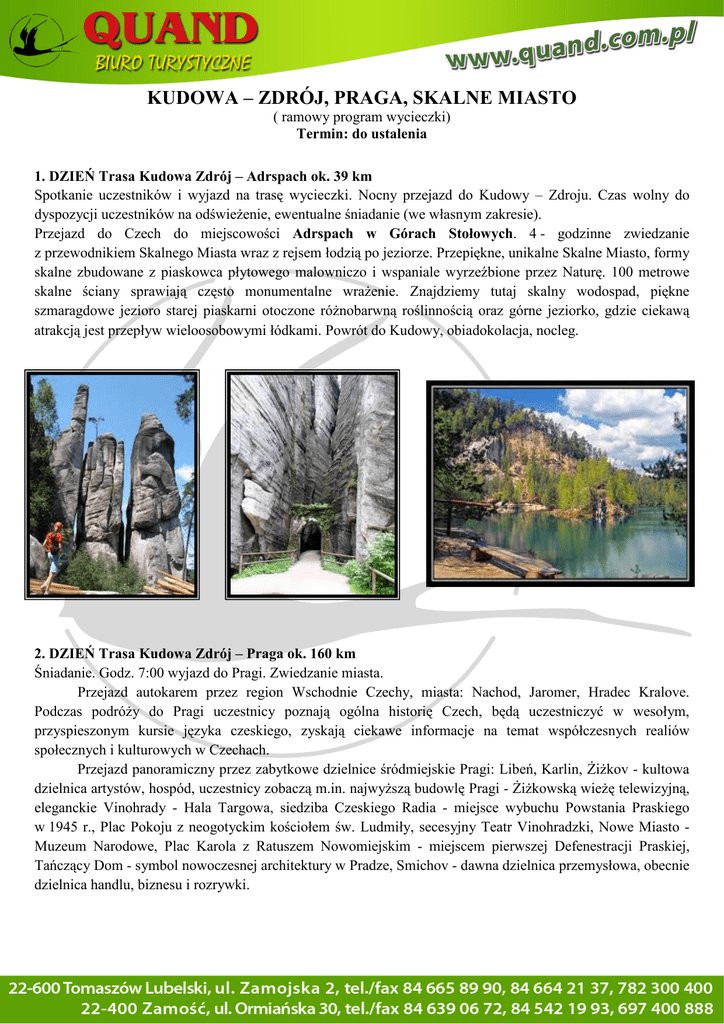 KUDOWA – ZDRÓJ, PRAGA, SKALNE MIASTO ( ramowy program wycieczki) Termin: do ustalenia 1. DZIEŃ Trasa Kudowa Zdrój – Adrspach ok. 39 km Spotkanie uczestników i wyjazd na trasę wycieczki. Nocny przejazd do Kudowy – Zdroju. Czas wolny do dyspozycji uczestników na odświeżenie, ewentualne śniadanie (we własnym zakresie). Przejazd do Czech do miejscowości Adrspach w Górach Stołowych. 4 - godzinne zwiedzanie z przewodnikiem Skalnego Miasta wraz z rejsem łodzią po jeziorze. Przepiękne, unikalne Skalne Miasto, formy skalne zbudowane z piaskowca płytowego malowniczo i wspaniale wyrzeźbione przez Naturę. 100 metrowe skalne ściany sprawiają często monumentalne wrażenie. Znajdziemy tutaj skalny wodospad, piękne szmaragdowe jezioro starej piaskarni otoczone różnobarwną roślinnością oraz górne jeziorko, gdzie ciekawą atrakcją jest przepływ wieloosobowymi łódkami. Powrót do Kudowy, obiadokolacja, nocleg. 2. DZIEŃ Trasa Kudowa Zdrój – Praga ok. 160 km Śniadanie. Godz. 7:00 wyjazd do Pragi. Zwiedzanie miasta. Przejazd autokarem przez region Wschodnie Czechy, miasta: Nachod, Jaromer, Hradec Kralove. Podczas podróży do Pragi uczestnicy poznają ogólna historię Czech, będą uczestniczyć w wesołym, przyspieszonym kursie języka czeskiego, zyskają ciekawe informacje na temat współczesnych realiów społecznych i kulturowych w Czechach. Przejazd panoramiczny przez zabytkowe dzielnice śródmiejskie Pragi: Libeń, Karlin, Żiżkov - kultowa dzielnica artystów, hospód, uczestnicy zobaczą m.in. najwyższą budowlę Pragi - Żiżkowską wieżę telewizyjną, eleganckie Vinohrady - Hala Targowa, siedziba Czeskiego Radia - miejsce wybuchu Powstania Praskiego w 1945 r., Plac Pokoju z neogotyckim kościołem św. Ludmiły, secesyjny Teatr Vinohradzki, Nowe Miasto Muzeum Narodowe, Plac Karola z Ratuszem Nowomiejskim - miejscem pierwszej Defenestracji Praskiej, Tańczący Dom - symbol nowoczesnej architektury w Pradze, Smichov - dawna dzielnica przemysłowa, obecnie dzielnica handlu, biznesu i rozrywki. Przejazd ponad dwukilometrowym tunelem Strahowskim na Hradczany. Zwiedzanie piesze: Klasztor Strahowski panorama miasta, Sanktuarium Loretańskie, Pałac Czerninów - obecna siedziba MSZ Republiki Czeskiej, przejście uliczką Novy Svet - jedną z najbardziej urokliwych na Hradczanach. Kościół św. Jana Nepomucena, Stary Ratusz, pałace przy Placu Hradczańskim. Przerwa na podziwianie zmiany warty Straży Zamkowej, następnie zwiedzanie Hradu czyli Zamku Praskiego: Katedra Św. Wita, Wacława i Wojciecha, Stary Pałac Królewski z Salą Władysławowską zbudowaną za czasów Władysława Jagiellończyka, romańska Bazylika Św. Jerzego. Przejście Złotą Uliczką do wieży Daliborka. Przejście przez Most Karola na Stare Miasto, Rynek Staromiejski, Ratusz Staromiejski ze słynnym zegarem astronomicznym Orloj. Obiadokolacja. Czas wolny do dyspozycji uczestników. Wieczorem przejazd na Kriżikove Fontanny - jest to wspaniałe multimedialne show przedstawiające piękno "tańczącej" wody wydobywającej się aż z trzech tysięcy dysz. Efekty świetlne wytwarzane są przez 1248 podwodnych reflektorów o różnych barwach. Wszystko to przy akompaniamencie muzyki klasycznej lub rozrywkowej słyszanej z 55 elektroakustycznych głośników – płatne indywidualnie, 220 CZK, ok. 37 zł. Ok. 22:00 wyjazd z Pragi, powrót do Kudowy ok. 24:00, nocleg. 3. DZIEŃ Trasa do Kłodzka ok. 40 km Śniadanie. Wykwaterowanie. Zwiedzanie Kudowy Zdrój, spacer po parku zdrojowym, zabytkowa zabudowa uzdrowiskowa, degustacja wody mineralnej w pijalni wód. Czermna - barokowa Kaplica Czaszek z 1776 r. Przejazd do Kłodzka, zwiedzanie twierdzy kłodzkiej. Obiad. Wyjazd w drogę powrotną, powrót do miejsc wsiadania w godzinach nocnych. CENA: 370 zł/os. – grupa 45 osób; 377 zł/os. – grupa 40 osób; 385 zł/os. – grupa 35 osób; Mniejsze grupy – cena na zapytanie. W RAMACH CENY GWARANTUJEMY: • 2 x nocleg w pokojach 2 - osobowych w pensjonacie w Kudowie - Zdrój; • wyżywienie jak w programie (2x śniadanie, 2x obiadokolacja, 1x obiad) • obsługę pilota - przewodnika; • ubezpieczenie NNW, KL; UWAGA! • cena nie zawiera kosztów transportu, opłat drogowych i parkingowych; • cena nie zawiera kosztów biletów wstępu, ok. 75 zł; • pokój 1-os. za dopłatą + 180 zł; • program ma charakter przykładowy, można go dowolnie modyfikować w zależności od zapotrzebowania grupy.