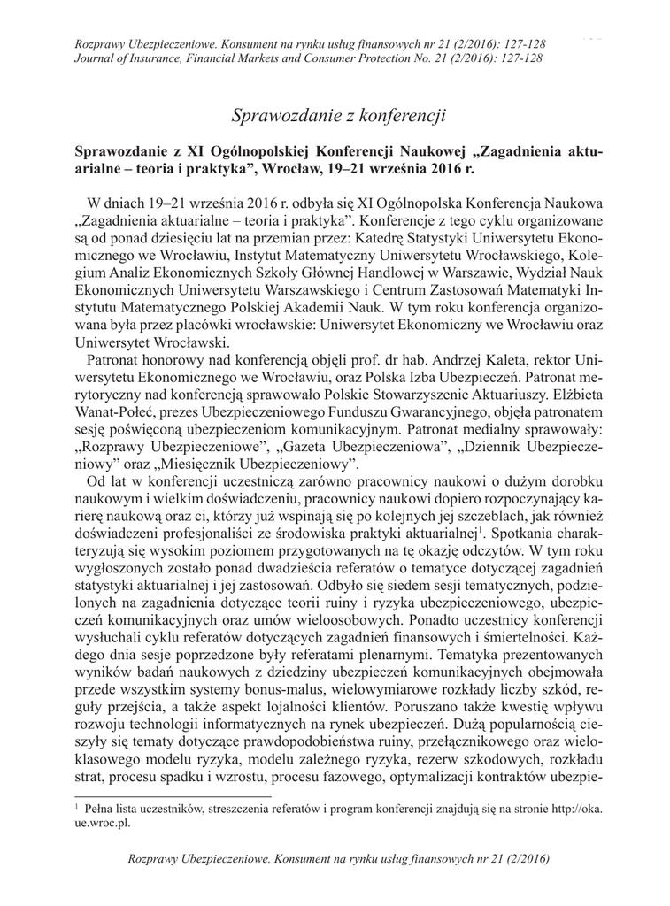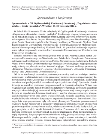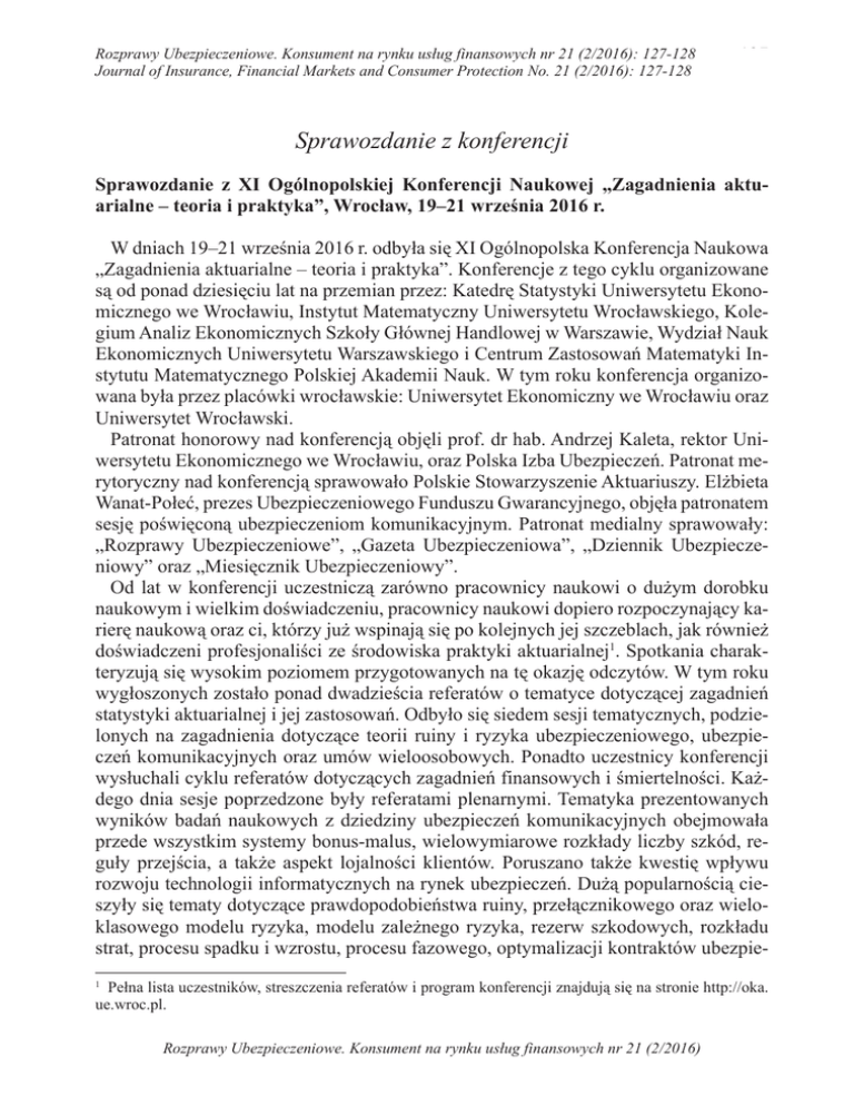 Rozprawy Ubezpieczeniowe. Konsument na rynku usług finansowych nr 21 (2/2016): 127-128 Journal of Insurance, Financial Markets and Consumer Protection No. 21 (2/2016): 127-128 127 Sprawozdanie z konferencji Sprawozdanie z XI Ogólnopolskiej Konferencji Naukowej „Zagadnienia aktuarialne – teoria i praktyka”, Wrocław, 19–21 września 2016 r. W dniach 19–21 września 2016 r. odbyła się XI Ogólnopolska Konferencja Naukowa „Zagadnienia aktuarialne – teoria i praktyka”. Konferencje z tego cyklu organizowane są od ponad dziesięciu lat na przemian przez: Katedrę Statystyki Uniwersytetu Ekonomicznego we Wrocławiu, Instytut Matematyczny Uniwersytetu Wrocławskiego, Kolegium Analiz Ekonomicznych Szkoły Głównej Handlowej w Warszawie, Wydział Nauk Ekonomicznych Uniwersytetu Warszawskiego i Centrum Zastosowań Matematyki Instytutu Matematycznego Polskiej Akademii Nauk. W tym roku konferencja organizowana była przez placówki wrocławskie: Uniwersytet Ekonomiczny we Wrocławiu oraz Uniwersytet Wrocławski. Patronat honorowy nad konferencją objęli prof. dr hab. Andrzej Kaleta, rektor Uniwersytetu Ekonomicznego we Wrocławiu, oraz Polska Izba Ubezpieczeń. Patronat merytoryczny nad konferencją sprawowało Polskie Stowarzyszenie Aktuariuszy. Elżbieta Wanat-Połeć, prezes Ubezpieczeniowego Funduszu Gwarancyjnego, objęła patronatem sesję poświęconą ubezpieczeniom komunikacyjnym. Patronat medialny sprawowały: „Rozprawy Ubezpieczeniowe”, „Gazeta Ubezpieczeniowa”, „Dziennik Ubezpieczeniowy” oraz „Miesięcznik Ubezpieczeniowy”. Od lat w konferencji uczestniczą zarówno pracownicy naukowi o dużym dorobku naukowym i wielkim doświadczeniu, pracownicy naukowi dopiero rozpoczynający karierę naukową oraz ci, którzy już wspinają się po kolejnych jej szczeblach, jak również doświadczeni profesjonaliści ze środowiska praktyki aktuarialnej1. Spotkania charakteryzują się wysokim poziomem przygotowanych na tę okazję odczytów. W tym roku wygłoszonych zostało ponad dwadzieścia referatów o tematyce dotyczącej zagadnień statystyki aktuarialnej i jej zastosowań. Odbyło się siedem sesji tematycznych, podzielonych na zagadnienia dotyczące teorii ruiny i ryzyka ubezpieczeniowego, ubezpieczeń komunikacyjnych oraz umów wieloosobowych. Ponadto uczestnicy konferencji wysłuchali cyklu referatów dotyczących zagadnień finansowych i śmiertelności. Każdego dnia sesje poprzedzone były referatami plenarnymi. Tematyka prezentowanych wyników badań naukowych z dziedziny ubezpieczeń komunikacyjnych obejmowała przede wszystkim systemy bonus-malus, wielowymiarowe rozkłady liczby szkód, reguły przejścia, a także aspekt lojalności klientów. Poruszano także kwestię wpływu rozwoju technologii informatycznych na rynek ubezpieczeń. Dużą popularnością cieszyły się tematy dotyczące prawdopodobieństwa ruiny, przełącznikowego oraz wieloklasowego modelu ryzyka, modelu zależnego ryzyka, rezerw szkodowych, rozkładu strat, procesu spadku i wzrostu, procesu fazowego, optymalizacji kontraktów ubezpie Pełna lista uczestników, streszczenia referatów i program konferencji znajdują się na stronie http://oka. ue.wroc.pl. 1 Rozprawy Ubezpieczeniowe. Konsument na rynku usług finansowych nr 21 (2/2016) 128 A. Marciniuk czeniowych oraz kontraktów z paryską dywidendą. Poruszana była także problematyka modelowania struktury zależności w ubezpieczeniach wieloosobowych, w których na szczególną uwagę zasługuje zastosowanie funkcji copula do modelowania struktury probabilistycznej w małżeńskich ubezpieczeniach życiowych oraz małżeńskich rentach hipotecznych. W tym roku bardzo dostrzegalna była współpraca naukowa tak wewnątrzuczelniana, jak i między poszczególnymi ośrodkami naukowymi. Kilka referatów wygłoszonych zostało w ramach projektów badawczych finansowanych przez Narodowe Centrum Nauki. Stałym elementem konferencji jest konkurs na najlepszy referat wygłoszony przez młodego uczestnika. Kapitułę konkursu stanowili obecni członkowie Komitetu Programowego pod przewodnictwem prof. dr. hab. Tomasza Rolskiego. Członkowie kapituły, wyłaniając laureata, wzięli pod uwagę wyniki ankiety przeprowadzonej wśród uczestników konferencji, a także własne spostrzeżenia i opinie. Z uwagi na to, że wygłoszone referaty były na wysokim poziomie, wybór zwycięzcy był bardzo trudny. Główną nagrodę, ufundowaną przez Elżbietę Wanat-Połeć, w wysokości 3000 zł netto, otrzymała dr Elżbieta Krajewska z Instytutu Matematyki Politechniki Łódzkiej za referat zatytułowany „Immunizacja portfela częściowo replikowalnego”. Przyznano również dwa wyróżnienia. Pierwsze otrzymał mgr Michał Krawiec, doktorant w Instytucie Matematycznym Uniwersytetu Wrocławskiego, który wygłosił referat „Detekcja zmiany dryfu w modelowaniu natężenia śmiertelności”. Drugie wyróżnienie za referat „Wpływ struktury probabilistycznej na wysokość świadczeń małżeńskiej renty hipotecznej”, otrzymała dr inż. Agnieszka Marciniuk, adiunkt w Katedrze Statystyki Uniwersytetu Ekonomicznego we Wrocławiu. Tegoroczne spotkanie było wyjątkowe, bowiem zostało zadedykowane Profesorowi Tomaszowi Rolskiemu z okazji siedemdziesiątej rocznicy urodzin. Agnieszka Marciniuk Journal of Insurance, Financial Markets & Consumer Protection No. 21 (2/2016)
