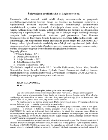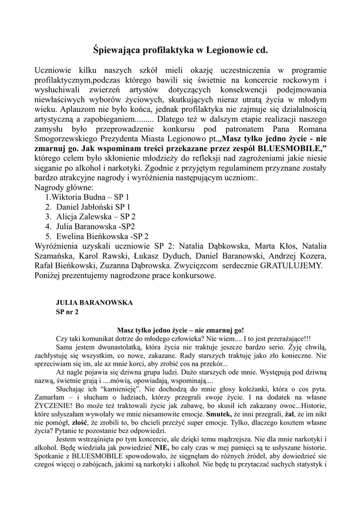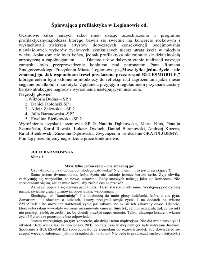 Śpiewająca profilaktyka w Legionowie cd. Uczniowie kilku naszych szkół mieli okazję uczestniczenia w programie profilaktycznym,podczas którego bawili się świetnie na koncercie rockowym i wysłuchiwali zwierzeń artystów dotyczących konsekwencji podejmowania niewłaściwych wyborów życiowych, skutkujących nieraz utratą życia w młodym wieku. Aplauzom nie było końca, jednak profilaktyka nie zajmuje się działalnością artystyczną a zapobieganiem......... Dlatego też w dalszym etapie realizacji naszego zamysłu było przeprowadzenie konkursu pod patronatem Pana Romana Smogorzewskiego Prezydenta Miasta Legionowo pt.„Masz tylko jedno życie - nie zmarnuj go. Jak wspominam treści przekazane przez zespół BLUESMOBILE,” którego celem było skłonienie młodzieży do refleksji nad zagrożeniami jakie niesie sięganie po alkohol i narkotyki. Zgodnie z przyjętym regulaminem przyznane zostały bardzo atrakcyjne nagrody i wyróżnienia następującym uczniom:. Nagrody główne: 1.Wiktoria Budna – SP 1 2. Daniel Jabłoński SP 1 3. Alicja Zalewska – SP 2 4. Julia Baranowska -SP2 5. Ewelina Bieńkowska -SP 2 Wyróżnienia uzyskali uczniowie SP 2: Natalia Dąbkowska, Marta Kłos, Natalia Szamańska, Karol Rawski, Łukasz Dyduch, Daniel Baranowski, Andrzej Kozera, Rafał Bieńkowski, Zuzanna Dąbrowska. Zwycięzcom serdecznie GRATULUJEMY. Poniżej prezentujemy nagrodzone prace konkursowe. JULIA BARANOWSKA SP nr 2 Masz tylko jedno życie – nie zmarnuj go! Czy taki komunikat dotrze do młodego człowieka? Nie wiem.... I to jest przerażające!!! Sama jestem dwunastolatką, która życia nie traktuje jeszcze bardzo serio. Żyję chwilą, zachłystuję się wszystkim, co nowe, zakazane. Rady starszych traktuję jako zło konieczne. Nie sprzeciwiam się im, ale az mnie korci, aby zrobić cos na przekór... Aż nagle pojawia się dziwna grupa ludzi. Dużo starszych ode mnie. Występują pod dziwną nazwą, świetnie grają i ....mówią, opowiadają, wspominają.... Słuchając ich “kamienieję”. Nie dochodzą do mnie głosy koleżanki, która o cos pyta. Zamarłam – i słucham o ludziach, którzy przegrali swoje życie. I na dodatek na własne ŻYCZENIE! Bo może też traktowali życie jak zabawę, bo skusił ich zakazany owoc...Historie, które usłyszałam wywołały we mnie niesamowite emocje. Smutek, że inni przegrali, żal, że im nikt nie pomógł, złość, że zrobili to, bo chcieli przeżyć super emocje. Tylko, dlaczego kosztem własne życia? Pytanie te pozostanie bez odpowiedzi. Jestem wstrząśnięta po tym koncercie, ale dzięki temu mądrzejsza. Nie dla mnie narkotyki i alkohol. Będę wiedziała jak powiedzieć NIE, bo cały czas w mej pamięci są te usłyszane historie. Spotkanie z BLUESMOBILE spowodowało, że sięgnęłam do różnych źródeł, aby dowiedzieć sie czegoś więcej o zabójcach, jakimi są narkotyki i alkohol. Nie będę tu przytaczać suchych statystyk i porad mądrych teoretyków. Myślę, że każdy młody człowiek, który raz SPRÓBOWAŁ powinien spotkać na swojej drodze BLUESMOBILE. Wierzę, że takie spotkanie podziała jak zimny prysznic. A jeśli nie .....to tylko wzrośnie liczba tych, którzy zmarnowali swoje życie NA WŁASNE ŻYCZENIE, bo zachciało się im zaszpanować, bo głupio wierzyli, że parę działek czy kieliszków nie uzależni...! Fakt, kilka razy nie uzależni, ale po woli zatracą sie w liczeniu (tych razów)....i znajdą się na dnie, z którego bardzo ciężko się wydostać! ALICJA ZALEWSKA SP nr 2 Myślę, że występ zespołu “BLUESMOBILE” może skutecznie zniechęcić wielu młodych ludzi do próbowania narkotyków. Panowie z tej grupy opowiadali tragiczne losy ludzi, którzy obracali sie w środowisku zażywającym narkotyki i te wypowiedzi wzbudziły we mnie i innych słuchaczach silne uczucie litości, bo były bardzo wzruszające i prawdziwe. Opisy konkretnych osób i konsekwencji błędnych decyzji i wyborów pomogły mi zrozumieć problemy wynikające z brania narkotyków. Dowiedziałam się też, że zdarza się, iż nawet dzieci zdolne i z dobrych rodzin staczają się czasem przez alkohol lub narkotyki. Jeśli nie umrą przed 20-tym rokiem zycia, to zostają kalekami albo marnują życie nie kończąc szkoły. Nikomu nie życzę, by skończył życie tak wcześnie i tak marnie. Nigdy nie chciałam brać narkotyków ani pić zbyt dużo alkoholu. Nie sądzę by “wspaniałe” narkotyki wniosły w nasze życie coś lepszego, czy uwalniały do trudów i nieprzyjemności. Moim zdaniem to nic dobrego! DANIEL JABŁOŃSKI SP nr 1 Masz tylko jedno życie – nie zmarnuj go! Wielu młodych ludzi, w dzisiejszych czasach, na każdym kroku styka się z różnymi nałogami. Są to przede wszystkim narkotyki, alkohol czy tytoń. Coraz młodsze pokolenie uważa, że dzięki używkom “wspomagaczom” świat staje się piękniejszy, problemy same znajdują rozwiązanie, a my zdobywamy wielu przyjaciół, jak się zresztą później okazuje fałszywych. Niestety, rzeczywistość jest całkiem inna i nie tak kolorowa, jak nam – dzieciom się wydaje. Życie to nie jest gra komputerowa, w której mogą być dla nas drogowskazem i których przesłanie jest bardzo znaczące i jakże ważne w życiu każdego młodego człowieka: “Masz tylko jedno życie – nie zmarnuj go!!!” Dlatego warto kształtować w nas, młodych ludziach, tak doskonała cechę, jaka jest asertywność poprzez organizowanie i zachęcanie do udziału nie tylko w spektaklach, zajęciach, warsztatach czy pogadankach profilaktycznych poświęconych nałogom i uzależnieniom do nich. Przede wszystkim warto organizować i zachęcać nas – młodych odbiorców do udziału w koncertach, zabawach, zlotach młodzieżowych, bo dzięki tak oryginalnym formom przekazu, gdzie pojawia się śpiew, taniec, zabawa, gry, żarty oraz spotkania i rozmowy z ludźmi, który w przeszłości mieli do czynienia z nałogami i byli od nich uzależnieni,