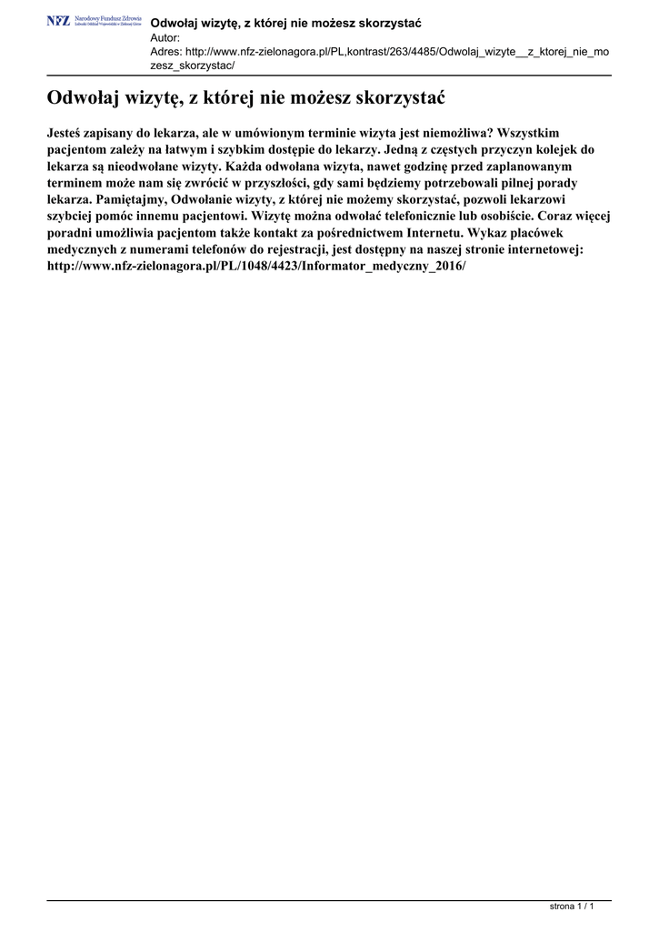 Odwołaj wizytę, z której nie możesz skorzystać Autor: Adres: http://www.nfz-zielonagora.pl/PL,kontrast/263/4485/Odwolaj_wizyte__z_ktorej_nie_mo zesz_skorzystac/ Odwołaj wizytę, z której nie możesz skorzystać Jesteś zapisany do lekarza, ale w umówionym terminie wizyta jest niemożliwa? Wszystkim pacjentom zależy na łatwym i szybkim dostępie do lekarzy. Jedną z częstych przyczyn kolejek do lekarza są nieodwołane wizyty. Każda odwołana wizyta, nawet godzinę przed zaplanowanym terminem może nam się zwrócić w przyszłości, gdy sami będziemy potrzebowali pilnej porady lekarza. Pamiętajmy, Odwołanie wizyty, z której nie możemy skorzystać, pozwoli lekarzowi szybciej pomóc innemu pacjentowi. Wizytę można odwołać telefonicznie lub osobiście. Coraz więcej poradni umożliwia pacjentom także kontakt za pośrednictwem Internetu. Wykaz placówek medycznych z numerami telefonów do rejestracji, jest dostępny na naszej stronie internetowej: http://www.nfz-zielonagora.pl/PL/1048/4423/Informator_medyczny_2016/ strona 1 / 1 Powered by TCPDF (www.tcpdf.org)