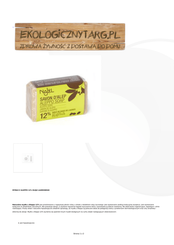 MYDŁO Z ALEPPO 12% OLEJU LAUROWEGO Naturalne mydło z Aleppo 12% jest produkowane z najwyższej jakości oliwy z oliwek z dodatkiem oleju laurowego. Jest wytwarzane według tradycyjnej receptury. Jest wytwarzane wyłącznie ze składników naturalnych. Nie powoduje alergii, a używane regularnie łagodzi wysuszenia skóry i pozostawia ją dobrze nawilżoną. Ma właściwości regenerujące, łagodzące i silnie nawilżające. Prosty skład i naturalne hipoalergiczne składniki sprawiają, że mydła z Aleppo są polecane także do pielęgnacji skóry z problemami dermatologicznymi oraz cery wrażliwej i skłonnej do alergii. Mydło z Aleppo 12% wyróżnia się spośród innych mydeł dostępnych na rynku dzięki następującym właściwościom: jest hipoalergiczne Strona 1 z 2 dzięki olejowi laurowemu posiada działanie antyseptycze i przeciwzapalne, wysoka zawartość oleju laurowego zwiększa jego właściwości regeneracyjne i łagodzące dzięki oliwie z oliwek doskonale nawilża i łagodzi skórę, odnawia film hydrolipidowy, oliwa posiada także właściwości regenerujące, uelastycznia skórę, wygładza ją. polecane także przy podrażnieniach skóry, bliznach, wspomaga gojenie skóry ulega biodegradacji w 100% nie zawiera sztucznych barwników, substancji konserwujących, zapachowych ani drażniących nie zawiera składników pochodzenia zwierzęcego nie jest testowane na zwierzętach produkowane według tradycyjnej receptury, proces produkcji i leżakowania mydła trwa minimum 9 miesięcy. bardzo wydajne - 1 kostka mydła wystarcza na około 3 miesiące polecane do pielęgnacji całego ciała, może służyć także jako szampon do włosów Mydło z Aleppo 12% jest polecane do pielęgnacji każdego rodzaju skóry. Jego naturalne właściwości nawilżające i przeciwzapalne oraz minimum składników sprawiają, że doskonale nadaje się do pielęgnacji skóry wrażliwej, skłonnej do alergii. Polecane jest dla alergików, przy atopowym zapaleniu skóry, egzemie, łuszczycy. Mydło z Aleppo 12% posiada większe stężenie oleju laurowego o leczniczych właściwościach. Jeśli jednak nie stosowaliście wcześniej mydła z Aleppo, warto najpierw kupić delikatniejsze mydło z Aleppo 5%, żeby skóra mogła się przyzwyczaić do oleju laurowego i potem można kupić mydło z Aleppo o większym stężeniu olejku laurowego. To mydło ma wiele cudownych właściwości i TYLKO 4 składniki. Nie ma potrzeby ulepszania tego doskonałego mydła niepotrzebnymi dodatkami chemicznymi. skład INCI: sodium olivate, sodium laurate 12%, aqua, sodium hydroxide skład w języku polskim: oliwa z oliwek (zmydlona), woda, olej laurowy (zmydlony) wodorotlenek sodu (ług sodowy pozyskiwany z soli morskiej) waga mydła: 100g Jakość mydła jest stale nadzorowana przez francuskie laboratoria marki NAJEL Strona 2 z 2