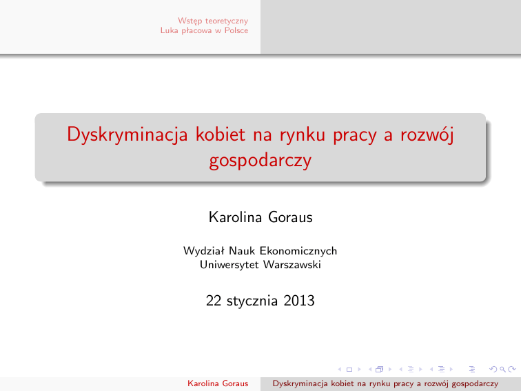 Wstęp teoretyczny Luka płacowa w Polsce Dyskryminacja kobiet na rynku pracy a rozwój gospodarczy Karolina Goraus Wydział Nauk Ekonomicznych Uniwersytet Warszawski 22 stycznia 2013 Karolina Goraus Dyskryminacja kobiet na rynku pracy a rozwój gospodarczy Wstęp teoretyczny Luka płacowa w Polsce Outline 1 Wstęp teoretyczny Motywacja Przegląd literatury Metodologia 2 Luka płacowa w Polsce Stan wiedzy Różnice w charakterystykach Wyniki dekompozycji Wnioski Bibliografia Karolina Goraus Dyskryminacja kobiet na rynku pracy a rozwój gospodarczy Wstęp teoretyczny Luka płacowa w Polsce Motywacja Przegląd literatury Metodologia Motywacja Większość społeczeństw deklaruje preferencję wobec równości płci, jednak występowanie luk płacowych między kobietami i mężczyznami wskazuje na możliwość występowania dyskryminacji oraz nieefektywności działań promujących równouprawnienie Na przestrzeni lat powstało wiele prac naukowych eksplorujących lukę płacową lub partycypacyjną między kobietami i mężczyznami. Dodatkowo dostępne są analizy badające zależność między sytuacją kobiet a rozwojem gospodarczym. Jednak te dwa zakresy badań są zazwyczaj traktowane rozłącznie Karolina Goraus Dyskryminacja kobiet na rynku pracy a rozwój gospodarczy Wstęp teoretyczny Luka płacowa w Polsce Motywacja Przegląd literatury Metodologia Cele badania Wykonanie szerokiego badania obejmującego zarówno spójny pomiar dyskryminacji kobiet dla wielu krajów na przestrzeni czasu, zanalizowanie zróżnicowania poziomu dyskryminacji pomiędzy krajami oraz jego zmiany w czasie, oraz eksplorację zależności między tym zróżnicowaniem, a stopniem rozwoju poszczególnych państw Uwzględnienie dwustronnej relacji między rozwojem a pozycją kobiet i próbę wyodrębnienia i oszacowania wpływu poziomu rozwoju na skalę dyskryminacji, poprzez znalezienie lub skonstruowanie odpowiedniej zmiennej instrumentalnej Karolina Goraus Dyskryminacja kobiet na rynku pracy a rozwój gospodarczy Wstęp teoretyczny Luka płacowa w Polsce Motywacja Przegląd literatury Metodologia Przegląd literatury Teoria preferencji Beckera Pracodawcy, kierując się niechęcią (lub preferencją) wobec niektórych grup demograficznych, społecznych, etnicznych lub religijnych, mogą zawyżać lub obniżać płace tym grupom, niewspółmiernie do ich produktywności Źródła luki płacowej Zróżnicowania płacy kobiet i mężczyzn według niektórych leży w dyskryminacji, natomiast inni mogą twierdzić, iż po prostu odzwierciedla ona różnice w obserwowalnych charakterystykach, które determinują otrzymywane wynagrodzenie (Nopo, 2008) Karolina Goraus Dyskryminacja kobiet na rynku pracy a rozwój gospodarczy Wstęp teoretyczny Luka płacowa w Polsce Motywacja Przegląd literatury Metodologia Przegląd literatury W badaniach empirycznych, miarą dyskryminacji jest zazwyczaj ta część różnicy w wynagrodzeniach, której nie można w sposób systematyczny przypisać różnicy w indywidualnych charakterystykach pracownika Metody dekompozycji 1 Parametryczne 2 Nieparametryczne Karolina Goraus Dyskryminacja kobiet na rynku pracy a rozwój gospodarczy Wstęp teoretyczny Luka płacowa w Polsce Motywacja Przegląd literatury Metodologia Przegląd literatury Brak możliwości dokonania porównań między szacunkami dyskryminacji w oparciu o badania dedykowane konkretnym krajom lub ich niewielkim grupom, związany ze stosowaniem różnych metod jej estymowania Weichselbaumer i Winter-Ebmer (2007) przeprowadzili metaanalizę 263 badań zawierających oszacowania różnic w płacach kobiet i mężczyzn w 62 krajach Nõpo, Daza i Ramos podjęli próbę oszacowania luki w płacach kobiet i mężczyzn, która nie może być objaśniona różnicą w charakterystykach, dla 63 krajów świata Karolina Goraus Dyskryminacja kobiet na rynku pracy a rozwój gospodarczy Wstęp teoretyczny Luka płacowa w Polsce Motywacja Przegląd literatury Metodologia Przegląd literatury Osobny nurt badań prowadzonych przez pracowników naukowych, czy organizacje międzynarodowe poświęcony jest zależności między poziomem rozwoju, a sytuacją kobiet Pogorszenia sytuacji gospodarczej skutkuje pogorszeniem sytuacji kobiet (Staveren, 2010; Knowles et al., 1999; Friedman i Schady, 2009) Wzmocnienie pozycji kobiet i rozwój gospodarczy są w ścisłej dwustronnej relacji (Duflo, 2011) Karolina Goraus Dyskryminacja kobiet na rynku pracy a rozwój gospodarczy Wstęp teoretyczny Luka płacowa w Polsce Motywacja Przegląd literatury Metodologia Metodologia Podstawowa ocena różnicy w płacach kobiet i mężczyzn jest dokonywana na podstawie tzw. surowej luki płacowej, czyli różnicy w średnich wynagrodzeniach (zazwyczaj godzinowych) kobiet i mężczyzn Dekompozycja Oaxaca-Blinder dwa czynniki: jeden związany z średnimi różnicami w charakterystykach kobiet i mężczyzn, oraz drugi związany z różnicą w schemacie wynagradzania obu grup za posiadane cechy istotne na rynku pracy Karolina Goraus Dyskryminacja kobiet na rynku pracy a rozwój gospodarczy Wstęp teoretyczny Luka płacowa w Polsce Motywacja Przegląd literatury Metodologia Metodologia Próby ulepszenia dekompozycji Oaxaca-Blinder Założenie o utrzymaniu męskiego równania płacy w wypadku braku dyskryminacji → Inne możliwe struktury płacy (Naumark, 1988; Oaxaca i Ransom, 1994;) Wymagana ciągła zmienna wynikowa → Rozwiązanie dla zmiennej zero-jedynkowej (Fairle, 2003), generalizacja dla dyskretnej lub ograniczonej zmiennej zależnej (Bauer and Sinning, 2008) Brak informacji o rozkładzie zróżnicowania w płacach → Rozszerzenie metody na parametry rozkładu wykraczające poza średnią (Juhn, Murphy, and Pierce, 1991; Machado, and Mata, 2005; DiNardo, Fortin, and Lemieux, 1996; Firpo, Fortin, Lemieux, 2007) Karolina Goraus Dyskryminacja kobiet na rynku pracy a rozwój gospodarczy Wstęp teoretyczny Luka płacowa w Polsce Motywacja Przegląd literatury Met