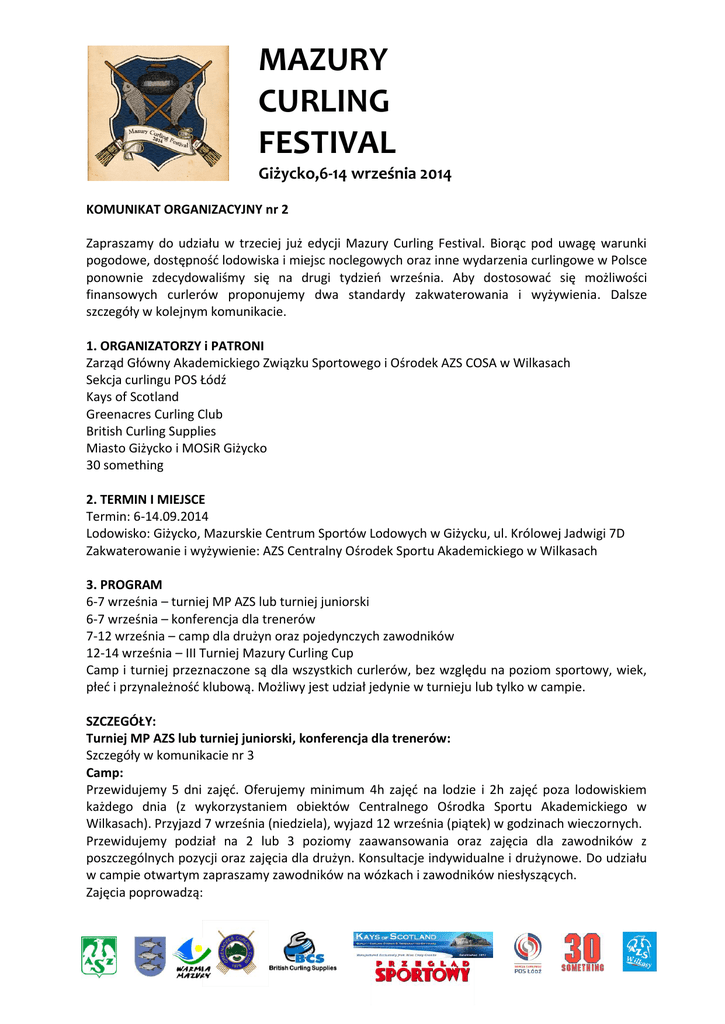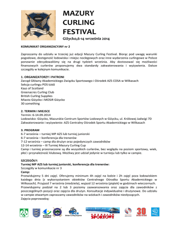 MAZURY CURLING FESTIVAL Giżycko,6-14 września 2014 KOMUNIKAT ORGANIZACYJNY nr 2 Zapraszamy do udziału w trzeciej już edycji Mazury Curling Festival. Biorąc pod uwagę warunki pogodowe, dostępność lodowiska i miejsc noclegowych oraz inne wydarzenia curlingowe w Polsce ponownie zdecydowaliśmy się na drugi tydzień września. Aby dostosować się możliwości finansowych curlerów proponujemy dwa standardy zakwaterowania i wyżywienia. Dalsze szczegóły w kolejnym komunikacie. 1. ORGANIZATORZY i PATRONI Zarząd Główny Akademickiego Związku Sportowego i Ośrodek AZS COSA w Wilkasach Sekcja curlingu POS Łódź Kays of Scotland Greenacres Curling Club British Curling Supplies Miasto Giżycko i MOSiR Giżycko 30 something 2. TERMIN I MIEJSCE Termin: 6-14.09.2014 Lodowisko: Giżycko, Mazurskie Centrum Sportów Lodowych w Giżycku, ul. Królowej Jadwigi 7D Zakwaterowanie i wyżywienie: AZS Centralny Ośrodek Sportu Akademickiego w Wilkasach 3. PROGRAM 6-7 września – turniej MP AZS lub turniej juniorski 6-7 września – konferencja dla trenerów 7-12 września – camp dla drużyn oraz pojedynczych zawodników 12-14 września – III Turniej Mazury Curling Cup Camp i turniej przeznaczone są dla wszystkich curlerów, bez względu na poziom sportowy, wiek, płeć i przynależność klubową. Możliwy jest udział jedynie w turnieju lub tylko w campie. SZCZEGÓŁY: Turniej MP AZS lub turniej juniorski, konferencja dla trenerów: Szczegóły w komunikacie nr 3 Camp: Przewidujemy 5 dni zajęć. Oferujemy minimum 4h zajęć na lodzie i 2h zajęć poza lodowiskiem każdego dnia (z wykorzystaniem obiektów Centralnego Ośrodka Sportu Akademickiego w Wilkasach). Przyjazd 7 września (niedziela), wyjazd 12 września (piątek) w godzinach wieczornych. Przewidujemy podział na 2 lub 3 poziomy zaawansowania oraz zajęcia dla zawodników z poszczególnych pozycji oraz zajęcia dla drużyn. Konsultacje indywidualne i drużynowe. Do udziału w campie otwartym zapraszamy zawodników na wózkach i zawodników niesłyszących. Zajęcia poprowadzą: 1 MAZURY CURLING FESTIVAL Giżycko,6-14 września 2014 - nowi doświadczeni trenerzy ze Szkocji i ew. z innych krajów europejskich – w trakcie negocjacji. Lars Berg (Szwecja), trener szwedzkich reprezentacji juniorskich i par mieszanych, stale współpracujący z polskimi drużynami reprezentacyjnymi czołowi polscy trenerzy poprowadzą zajęcia dla grup mniej zaawansowanych zajęcia dla zawodników niesłyszących (prowadzenie – trener reprezentacji Rosji niesłyszących Vitalij Karpinski). Zapewniamy transport z ośrodka na lodowisko i z powrotem oraz spotkania integracyjne w tawernie Wabędź. Dla wszystkich uczestników przygotujemy okolicznościowe koszulki i upominki. Koszt udziału: 399 zł (udział w campie) lub 699 zł (udział w campie, zakwaterowanie w domkach i wyżywienie w stołówce AZS COSA Wilkasy od 7 września od kolacji do 12 września do obiadu) lub 1.049 zł (udział w campie, zakwaterowanie w hotelu i wyżywienie w restauracji COSA Wilkasy od 7 września od kolacji do 12 września do obiadu). Przewidujemy także specjalne ceny dla osób towarzyszących oraz dla wszystkich uczestników, którzy chcą przyjechać wcześniej lub zostać dłużej. Zainteresowanych proszę o kontakt. Dla wszystkich uczestników przewidujemy pamiątkowe koszulki i upominki oraz ognisko integracyjne. Dodatkowe w cenie pobytu w AZS COSA Wilkasy – możliwość codziennego korzystania z obiektów sportowych i kompleksu SPA zniżki na zabiegi rehabilitacyjne i kriokomore. Zniżki i rabaty na camp dla osób korzystających z zakwaterowania w AZS COSA Wilkasy: Kadra ACSS – zniżka 400 zł oraz zabiegi rehabilitacyjne nieodpłatnie Zawodnicy POS Łódź i AZS UW Warszawa – zniżka 150 zł Kadry Wojewódzkie Juniorów i Młodzików – do negocjacji Poza godzinami zarezerwowanymi dla campu istnieje także możliwość wynajęcia toru dla drużyn nieuczestniczących oficjalnie w campie. Koszt wynajęcia toru wynosi 49zł za 1h. Ew. opłat dodatkowych można będzie dokonywać na miejscu. Formularz zgłoszeniowy Imię i nazwisko:……………………….. Wiek:………………….. Doświadczenie curlingowe (w latach):………………. Klub:………………………………………….. Telefon, email:……………………………. Rozmiar koszulki: XL, L, M, S Podpis uczestnika lub podpis rodzica w przypadku zawodników ……………………………………………………………………………………………….................... Zakwaterowanie i wyżywienie: Brak/domki i stołówka/hotel i restauracja (niepotrzebne skreślić) niepełnoletnich: 2 MAZURY CURLING FESTIVAL Giżycko,6-14 września 2014 Turniej Mazury Curling Cup: Zagwarantowane 4 lub 5 meczów. Start 12 września (piątek) w godzinach wieczornych, finał 14 września (niedziela) około 16.00. 16-32 drużyny, składy i wiek uczestników bez ograniczeń. Decyduje kolejność zgłoszeń. Organizator zastrzega sobie prawo przyjęcia poza kolejnością drużyn zagranicznych oraz możliwość nie przyjęcia więcej niż 2 drużyn z tego samego klubu. Koszt udziału 1 osoby w turnieju: 99 zł (udział w turnieju) lub 199 zł (udział w turnieju, zakwaterowanie w domkach i wyżywienie w stołówce COSA Wilkasy od 12 września od kolacji do 14 września do obiadu) lub 300 zł (udział w turnieju, zakwaterowanie w hotelu i wyżywienie w restauracji COSA Wilkasy od 12 września od kolacji do 14 września do obiadu) Dla wszystkich uczestników przewidujemy pamiątkowe koszulki i upominki oraz ognisko integracyjne. Dodatkowe w cenie pobytu w COSA Wilkasy – możliwość codziennego korzystania z obiektów sportowych i kompleksu SPA, zniżki na zabiegi rehabilitacyjne i kriokomorę. Zniżki na turniej dla osób korzystających z zakwaterowania w COSA Wilkasy: Uczestnicy campu – zniżka 100 zł (ta zniżka nie sumuje się z innymi zniżkami). Kadra ACSS – zniżka 15