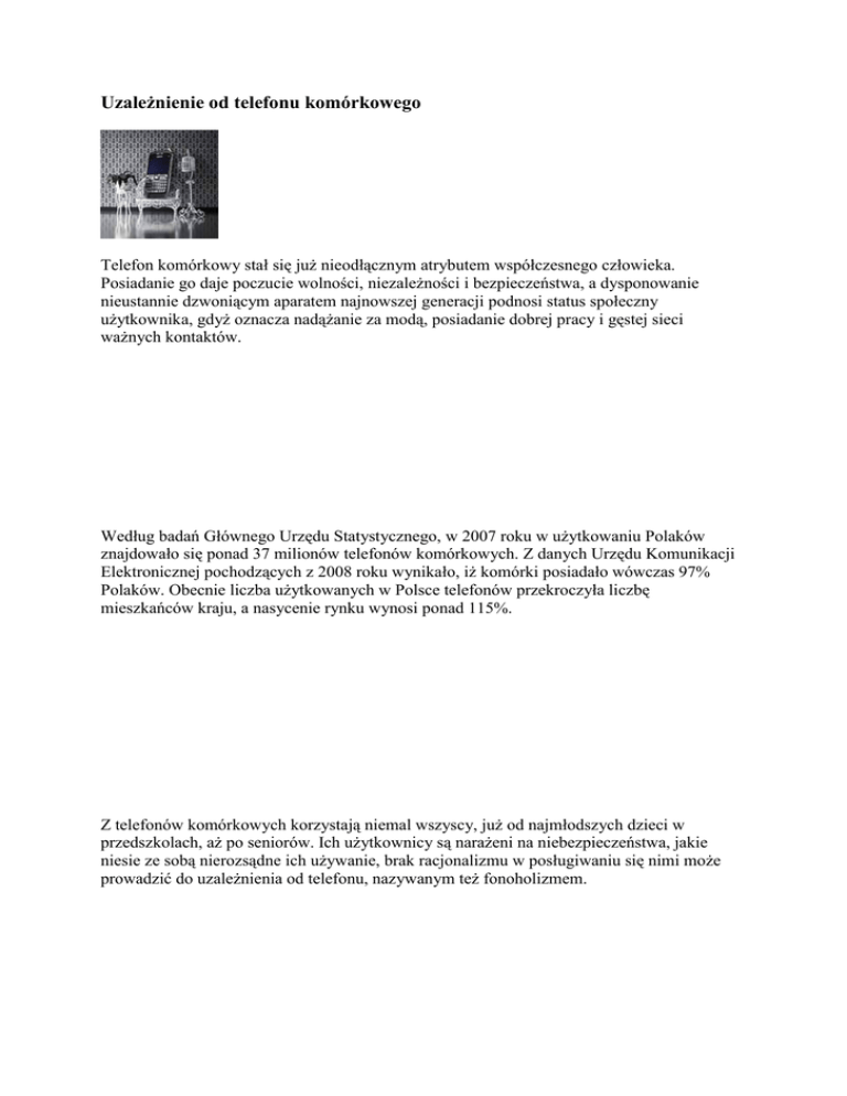 Uzależnienie od telefonu komórkowego Telefon komórkowy stał się już nieodłącznym atrybutem współczesnego człowieka. Posiadanie go daje poczucie wolności, niezależności i bezpieczeństwa, a dysponowanie nieustannie dzwoniącym aparatem najnowszej generacji podnosi status społeczny użytkownika, gdyż oznacza nadążanie za modą, posiadanie dobrej pracy i gęstej sieci ważnych kontaktów. Według badań Głównego Urzędu Statystycznego, w 2007 roku w użytkowaniu Polaków znajdowało się ponad 37 milionów telefonów komórkowych. Z danych Urzędu Komunikacji Elektronicznej pochodzących z 2008 roku wynikało, iż komórki posiadało wówczas 97% Polaków. Obecnie liczba użytkowanych w Polsce telefonów przekroczyła liczbę mieszkańców kraju, a nasycenie rynku wynosi ponad 115%. Z telefonów komórkowych korzystają niemal wszyscy, już od najmłodszych dzieci w przedszkolach, aż po seniorów. Ich użytkownicy są narażeni na niebezpieczeństwa, jakie niesie ze sobą nierozsądne ich używanie, brak racjonalizmu w posługiwaniu się nimi może prowadzić do uzależnienia od telefonu, nazywanym też fonoholizmem. Najczęściej to, jak bardzo telefon stał się nam niezbędny, uświadamiamy sobie dopiero w chwili, gdy korzystanie z niego staje się niemożliwe. Więź łącząca użytkownika z aparatem często wykracza poza zwykłe zainteresowanie urządzeniem technicznym. W pewien sposób wszyscy użytkownicy są zależni od telefonów, jednak o poważniejszym problemie fonoholiźmie decyduje aspekt ilościowy, określający czas, który przeznacza się na korzystanie z urządzenia. Uzależnienie od telefonu komórkowego nie zostało do tej pory zdiagnozowane w Polsce, co nie znaczy, że problem nie istnieje. Charakteryzuje się ono: - przywiązywaniem wielkiej wagi do posiadania telefonu - nie rozstawaniem się z nim ani na chwilę - telefon jest pośrednikiem i najważniejszym narzędziem codziennych kontaktów z innymi - odczuwaniem głębokiego dyskomfortu, kiedy nie ma się do dyspozycji naładowanego aparatu, zły nastrój, niepokój, niekiedy nawet ataki paniki - używaniem telefonu podyktowane czynnikami natury emocjonalnej i społecznej - traktowaniem telefon u jako narzędzia do sprawowania nieustającej kontroli nad najbliższymi - odczuwaniem przymusu nieustannego kontaktowania się z kimś, odruchowym wykonywaniem dużej liczby bezproduktywnych połączeń - usprawiedliwianiem swojego uzależnienia wygodą i bezpieczeństwem - nerwowym nasłuchiwaniem, czy ktoś dzwoni lub noszenie ze sobą zapasowych baterii - odczuwaniem silnej potrzeby przynależności do grupy i zdobycia jej uznania - jakąś formą fobii społecznej lub obawą przed samotnością - unikaniem kontaktów z innymi, wybierając połączenia telefoniczne czy SMS-y zamiast rozmowy w cztery oczy - rzadziej - smutkiem, nudą, odmową podejmowania współżycia seksualnego czy brak apetytu Rodzaje uzależnienia od telefonu komórkowego: uzależnienie od SMS-ów, charakteryzujące się: - odczuwaniem przymusu nieustannego otrzymywania i wysyłania wiadomości tekstowych - charakterystycznym odciskiem na kciuku, mocnym zużyciem klawiatury aparatu - nastrój w danym dniu zależy od ilości otrzymanych SMS-ów - wysyłaniem wiadomości również do siebie samych (np. z komputera) lub do osób znajdujących się w pobliżu uzależnienie od nowych modeli, charakteryzujące się: - nabywaniem coraz to nowych modeli aparatów komórkowych komórkowy ekshibicjonizm, charakteryzujący się: - przy wyborze aparatu przywiązywanie szczególnej wagi do jego koloru, stylistyki i ceny - pokazywanie innym funkcji, w jakie jest wyposażony - prowadzenie bardzo głośnych rozmów, pozwalanie na długie dzwonienie aparatu przed odebraniem połączenia tak, by wszyscy obecni go usłyszeli gracze, charakteryzujący się: - przejawianiem nadmiernego zainteresowania grami znajdującymi się w telefonach komórkowych - aparat staje się konsolą do gry - częstym graniem, aż do momentu, dopóki nie pobije się nowego rekordu w danej grze Uzależnienie od telefonu osoby stopniowo wycofują się z relacji z otoczeniem, spędzając wiele czasu samotnie, nie rozstając się jedynie z telefonem. Nadmierna koncentracja na wysyłaniu SMS-ów, czy na grach może prowadzić do mentalnego oderwania od rzeczywistego świata. Do konsekwencji fonoholizmu, wspólnych dla wszystkich uzależnień behawioralnych należą też: zanik dotychczasowych zainteresowań, gwałtowne wahania nastroju, zaburzenia snu i odżywiania, nadużywanie leków i narkotyków, popadnięcie w długi z tytułu wysokich rachunków telefonicznych, konflikty z bliskimi oraz kłopoty w życiu zawodowym. Osoba odczuwająca przemożną potrzebę nieustannej komunikacji za pomocą komórki powinna stopniowo zmniejszać zakres i ograniczać czas korzystania z niego. Na początek można włączać go tylko na kilka godzin dziennie, aż osiągnie się stan pewnej tolerancji niepokoju oczekiwania. Podobnie jak w przypadku leczenia innych uzależnień behawioralnych, program terapii fonoholizmu przewiduje terapię uwalniającą od problemów, które stanowią rzeczywistą przyczynę uzależnienia.