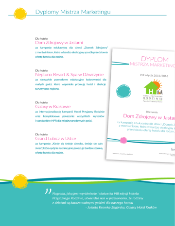 Dyplomy Mistrza Marketingu Dla hotelu Dom Zdrojowy w Jastarni za kampanię edukacyjną dla dzieci „Domek Zdrojowy” z morświnkiem, która w bardzo atrakcyjny sposób przedstawia DYPLOM ofertę hotelu dla rodzin. MISTRZA MARKETING Dla hotelu Neptuno Resort & Spa w Dźwirzynie VIII edycja 2015/2016 za niezwykle pomysłowe edukacyjne kolorowanki dla małych gości, które wspaniale promują hotel i atrakcje turystyczne regionu. Dla hotelu Galaxy w Krakowie za internacjonalizację kampanii Hotel Przyjazny Rodzinie oraz kompleksowe pokazanie wszystkich kryteriów i standardów HPR dla międzynarodowych gości. Dla hotelu Dla hotelu Dom Zdrojowy w Jastar za kampanię edukacyjn ą dla dzieci „Domek Z z morświnkiem, która w bardzo atrakcyjny s przedstawia ofertę hotel u dla rodzin. Grand Lubicz w Ustce za kampanię „Kiedy się śmieje dziecko, śmieje się cały świat”, która spójnie i atrakcyjnie pokazuje bardzo szeroką ofertę hotelu dla rodzin. Warszawa, 1 październ ika 2016 Nagroda, jaką jest wyróżnienie i statuetka VIII edycji Hotelu Przyjaznego Rodzinie, utwierdza nas w przekonaniu, że rodziny z dziećmi są bardzo ważnymi gośćmi dla naszego hotelu - Jolanta Kromka-Zagórska, Galaxy Hotel Kraków Przewodnicząca Komitetu Hotel P