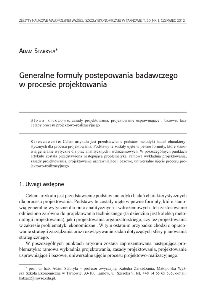 ZESZYTY NAUKOWE MAŁOPOLSKIEJ WYŻSZEJ SZKOŁY EKONOMICZNEJ W TARNOWIE, t. 20, nr 1, czerwiec 2012 Adam Stabryła* Generalne formuły postępowania badawczego w procesie projektowania S ł o w a k l u c z o w e: zasady projektowania, projektowanie usprawniające i bazowe, fazy i etapy procesu projektowo-realizacyjnego S t r e s z c z e n i e: Celem artykułu jest przedstawienie podstaw metodyki badań charakterystycznych dla procesu projektowania. Podstawy te zostały ujęte w pewne formuły, które stanowią generalne wytyczne dla prac analitycznych i wdrożeniowych. W poszczególnych punktach artykułu została przedstawiona następująca problematyka: ramowa wykładnia projektowania, zasady projektowania, projektowanie usprawniające i bazowe, uniwersalne ujęcie procesu projektowo-realizacyjnego. 1. Uwagi wstępne Celem artykułu jest przedstawienie podstaw metodyki badań charakterystycznych dla procesu projektowania. Podstawy te zostały ujęte w pewne formuły, które stanowią generalne wytyczne dla prac analitycznych i wdrożeniowych. Ich zastosowanie odniesiono zarówno do projektowania technicznego (ta dziedzina jest kolebką metodologii projektowania), jak i projektowania organizatorskiego, czy też projektowania w zakresie problematyki ekonomicznej. W tym ostatnim przypadku chodzi o opracowanie strategii zarządzania oraz rozwiązywanie zadań dotyczących sfery planowania strategicznego. W poszczególnych punktach artykułu została zaprezentowana następująca problematyka: ramowa wykładnia projektowania, zasady projektowania, projektowanie usprawniające i bazowe, uniwersalne ujęcie procesu projektowo-realizacyjnego. * prof. dr hab. Adam Stabryła – profesor zwyczajny, Katedra Zarządzania, Małopolska Wyższa Szkoła Ekonomiczna w Tarnowie, 33-100 Tarnów, ul. Szeroka 9, tel. +48 14 65 65 535, e-mail: [email protected]. 168 Adam Stabryła 2. Ramowa wykładnia projektowania W zarządzaniu projektami zasadnicze znaczenie ma kierownictwo merytoryczne w zakresie przedsięwzięć badawczych i wdrożeniowych. Jest to obszar, w którym rozstrzyga się o rozwiązaniach projektowych, ich racjonalności funkcjonalnej (technicznej bądź organizacyjnej), jak również efektywności ekonomicznej. Generowanie wariantów projektowych, analiza decyzyjna wyboru wariantu optymalnego, budżetowanie, planowanie realizacji przedsięwzięcia to przykładowy zestaw problemów projektowania. Proces projektowy – albo krócej „projektowanie” – jest merytorycznym i twórczym rodzajem działalności człowieka, który stanowi preparację koncepcyjną i pragmatyczną (odniesioną do metodologii) dla funkcji wykonawczych. W tym ogólnym sformułowaniu zawiera się kreatywna cecha projektowania, a zatem przydająca wytworowi znamiona większej lub mniejszej oryginalności. Sens preparacji jest oczywisty, bowiem projekt jest konstrukcją, która ma być poddana weryfikacji, a w drugiej kolejności wdrożeniu. Warto tu podnieść kwestię następującą: czy rozwiązanie odtwórcze, będące podstawą późniejszej implementacji, można par excellence uważać za projekt, a zarazem proces odtwarzania za proces projektowy? Otóż, w świetle wcześniejszej interpretacji, odpowiedź na postawione pytanie jest negatywna, ponieważ „odtwarzanie” jest odwzorowywaniem rzeczywistości, a więc czegoś już istniejącego2. (Wyjaśnijmy, że stosowane w praktyce pojęcie tzw. projektu typowego oznacza, iż pierwotna dokumentacja projektowa ma swoje repliki, będące poszczególnymi egzemplarzami jednego projektu). Dla potrzeb porównawczych poniżej przytaczamy kilka definicji procesu projektowego (projektowania) różnych autorów. Janusz Dietrych proponuje następujące definicje (1, s. 46): Celem projektowania jest rozwiązanie ekonomicznych i technicznych problemów doboru środków technicznych, społecznych i finansowych, koniecznych do osiągnięcia celów produkcyjnych i usługowych, wywołujących pożądane skutki techniczne i ekonomiczne. P r o j e k t o w a n i e [podkr. A.S.] polega na takim doborze środków technicznych i na wyznaczeniu między nimi takich stosunków, aby utworzony w określonych warunkach zewnętrznych układ środków umożliwiał osiąganie założonego celu, przy nakładach gospodarczych nie wyższych od dopuszczalnych. Bardziej konkretna jest definicja Edwarda V. Kricka, który proces projektowy odnosi do rozwiązywania problemu technicznego. Według niego proces ten składa się z następujących etapów (2, s. 129): 2 Odwzorowywanie to inaczej modelowanie odwzorowujące, a więc identyfikacja. Generalne formuły postępowania badawczego w procesie projektowania 169 1) formułowania problemu (technicznego), 2) analizy problemu, 3) poszukiwania rozwiązań wariantowych, 4) podjęcia decyzji o wyborze najlepszego rozwiązania projektowego, 5) przygotowania dokumentacji. Krick dodaje następnie, iż „Proces projektowania obejmuje czynności i zdarzenia występujące między pojawieniem się problemu a powstaniem dokumentacji opisującej rozwiązanie problemu, zadowalającej z punktu widzenia funkcjonalnego, ekonomicznego i innych wymagań” (2, s. 129 i n.). Wojciech Gasparski proponuje natomiast rozróżnienie trzech kontekstów występowania terminu projektowanie. Kontekst pierwszy to kontekst obiektu projektowanego. Projektowanie w tym kontekście ma znaczenie rezultatowe i odnosi się do rozwiązań wzorcowych, idealnych lub bliskich rozwiązaniu idealnemu. Drugi kontekst to kontekst procesu rozwiązywania problemów projektowych. Projektowanie w tym ujęciu to idealizacja procedury postępowania projektującego, jego morfologia, osobowość i niezmienniki oraz metody i techniki projektowania. Kontekst ten jest odpowiednikiem pragmatycznego sensu metodologii. Wreszcie trzeci kontekst, będący dopełnieniem poprzedniego, to kontekst postawy metodologicznej, którą W. Gasparski określa jako odmianę postępowania indukcyjnego niezupełnego, co wyraża s