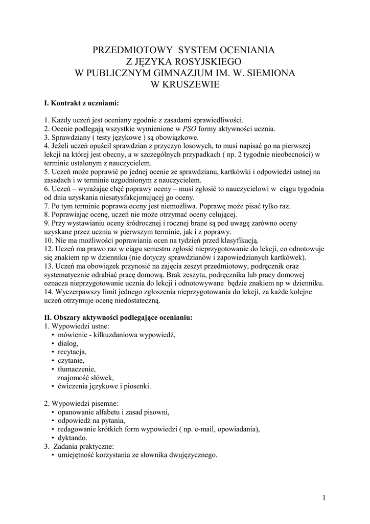 PRZEDMIOTOWY SYSTEM OCENIANIA Z JĘZYKA ROSYJSKIEGO W PUBLICZNYM GIMNAZJUM IM. W. SIEMIONA W KRUSZEWIE I. Kontrakt z uczniami: 1. Każdy uczeń jest oceniany zgodnie z zasadami sprawiedliwości. 2. Ocenie podlegają wszystkie wymienione w PSO formy aktywności ucznia. 3. Sprawdziany ( testy językowe ) są obowiązkowe. 4. Jeżeli uczeń opuścił sprawdzian z przyczyn losowych, to musi napisać go na pierwszej lekcji na której jest obecny, a w szczególnych przypadkach ( np. 2 tygodnie nieobecności) w terminie ustalonym z nauczycielem. 5. Uczeń może poprawić po jednej ocenie ze sprawdzianu, kartkówki i odpowiedzi ustnej na zasadach i w terminie uzgodnionym z nauczycielem. 6. Uczeń – wyrażając chęć poprawy oceny – musi zgłosić to nauczycielowi w ciągu tygodnia od dnia uzyskania niesatysfakcjonującej go oceny. 7. Po tym terminie poprawa oceny jest niemożliwa. Poprawę może pisać tylko raz. 8. Poprawiając ocenę, uczeń nie może otrzymać oceny celującej. 9. Przy wystawianiu oceny śródrocznej i rocznej brane są pod uwagę zarówno oceny uzyskane przez ucznia w pierwszym terminie, jak i z poprawy. 10. Nie ma możliwości poprawiania ocen na tydzień przed klasyfikacją. 12. Uczeń ma prawo raz w ciągu semestru zgłosić nieprzygotowanie do lekcji, co odnotowuje się znakiem np w dzienniku (nie dotyczy sprawdzianów i zapowiedzianych kartkówek). 13. Uczeń ma obowiązek przynosić na zajęcia zeszyt przedmiotowy, podręcznik oraz systematycznie odrabiać pracę domową. Brak zeszytu, podręcznika lub pracy domowej oznacza nieprzygotowanie ucznia do lekcji i odnotowywane będzie znakiem np w dzienniku. 14. Wyczerpawszy limit jednego zgłoszenia nieprzygotowania do lekcji, za każde kolejne uczeń otrzymuje ocenę niedostateczną. II. Obszary aktywności podlegające ocenianiu: 1. Wypowiedzi ustne: • mówienie - kilkuzdaniowa wypowiedź, • dialog, • recytacja, • czytanie, • tłumaczenie, znajomość słówek, • ćwiczenia językowe i piosenki. 2. Wypowiedzi pisemne: • opanowanie alfabetu i zasad pisowni, • odpowiedź na pytania, • redagowanie krótkich form wypowiedzi ( np. e-mail, opowiadania), • dyktando. 3. Zadania praktyczne: • umiejętność korzystania ze słownika dwujęzycznego. 1 III. Formy aktywności: Sprawdziany – Testy językowe Kartkówki Mówienie Czytanie Tłumaczenie Pisanie Praca w grupach. IV. Kryteria oceniania poszczególnych form aktywności: a). Uczeń otrzymuje z pracy pisemnej ( sprawdziany, testy) ocenę: niedostateczną – poniżej 30 % punktów, dopuszczającą – 30 – 49 % punktów, dostateczną – 50 – 74 % punktów, dobrą – 75 – 94 % punktów, bardzo dobrą – 95 – 100% punktów, celującą – 100% + zadanie dodatkowe, lub gdy wykazał się wiedzą wykraczającą poza zakres wymagań dla danego etapu kształcenia; b). Przy recytacji brane są pod uwagę: prawidłowa wymowa, akcentuacja i intonacja, opanowanie tekstu, interpretacja; c). Dyktanda (1 do 3 błędów I stopnia na ocenę bardzo dobrą w zależności od etapu kształcenia); d). Aktywność językowa: udział i bardzo dobre wyniki w konkursach rusycystycznych i innych przedsięwzięciach związanych z językiem rosyjskim lub wiedzą o Rosji. e). Od roku szkolnego 2014/2015 wszystkie oceny uczniów wpisywane będą do dziennika elektronicznego. V. Sposób ustalania oceny śródrocznej i rocznej: Przy ustalaniu oceny śródrocznej i rocznej nauczyciel bierze pod uwagę stopnie ucznia z poszczególnych obszarów aktywności według następującej kolejności: • sprawdziany – testy językowe • kartkówki • czytanie i tłumaczenie • wypowiedzi ustne • pisanie • prace domowe • aktywność na lekcji • praca w grupach. VI. Informowanie uczniów i rodziców o wymaganiach i postępach ucznia: a) nauczyciel – uczeń - nauczyciel przekazuje uczniowi w formie ustnej uzasadnienie do wystawianej oceny z wypowiedzi ustnych i pisemnych. - uczeń ma możliwość otrzymania dodatkowych wyjaśnień i uzasadnień do wystawionej oceny; 2 b) nauczyciel – rodzic - podczas wywiadówek i indywidualnych konsultacji rodzic może uzyskać informacje o postępach w nauce dziecka. – oceny oraz uwagi o uczniu wpisywane są na bieżąco w dzienniku elektronicznym, – przedmiotowy system oceniania jest dostępny na stronie internetowej gimnazjum. VII. Sposoby korygowania niepowodzeń szkolnych i podnoszenia osiągnięć uczniów: uczeń może systematycznie, na bieżąco poprawić ocenę – zgodnie z WSO (praca klasowa w ciągu 2 tygodni), w wyjątkowych przypadkach poprawianie może odbywać się za zgodą nauczyciela bezpośrednio przed wystawieniem oceny śródrocznej lub rocznej, w wyjątkowych przypadkach losowych uczeń może być zwolniony ze sprawdzianu, kartkówki lub odpowiedzi ustnej, uczniowie mogą uzupełniać braki z przedmiotu w ramach konsultacji z nauczycielem, obowiązkiem każdego ucznia jest prowadzenie zeszytu przedmiotowego. VIII. Dostosowanie Przedmiotowego Systemu Oceniania do możliwości uczniów ze specjalnymi wymaganiami edukacyjnymi. 1. Uczniowie posiadający opinię poradni psychologiczno-pedagogicznej o specyficznych trudnościach w uczeniu się oraz uczniowie posiadający orzeczenie o potrzebie nauczania specjalnego lub indywidualnego są oceniani z uwzględnieniem zaleceń poradni. 2. Nauczyciel dostosowuje wymagania edukacyjne do indywidualnych potrzeb psychofizycznych i edukacyjnych ucznia posiadającego opinię poradni psychologiczno - pedagogicznej o specyficznych trudnościach w uczeniu się. 3. W stosunku do wszystkich uczniów posiadających dysfunkcje zastosowane zostają zasady wzmacniania poczucia własnej wartości, bezpieczeństwa, motywowania do pracy i doceniania małych sukcesów. IX. Wymagania na poszczególne oceny: Ocenę celującą otrzymuje uczeń, który: • spełnia wymagania na ocenę bardzo dobrą, • uzyskuje oceny celujące z prac klasowych, sprawdzianów i prac domowych, • wykonu