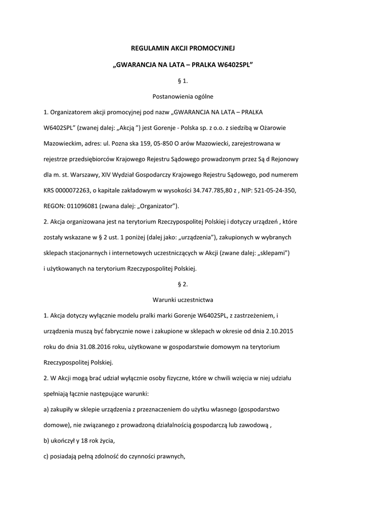 REGULAMIN AKCJI PROMOCYJNEJ „GWARANCJA NA LATA – PRALKA W6402SPL” § 1. Postanowienia ogólne 1. Organizatorem akcji promocyjnej pod nazw „GWARANCJA NA LATA – PRALKA W6402SPL” (zwanej dalej: „Akcją ”) jest Gorenje - Polska sp. z o.o. z siedzibą w Ożarowie Mazowieckim, adres: ul. Pozna ska 159, 05-850 O arów Mazowiecki, zarejestrowana w rejestrze przedsiębiorców Krajowego Rejestru Sądowego prowadzonym przez Są d Rejonowy dla m. st. Warszawy, XIV Wydział Gospodarczy Krajowego Rejestru Sądowego, pod numerem KRS 0000072263, o kapitale zakładowym w wysokości 34.747.785,80 z , NIP: 521-05-24-350, REGON: 011096081 (zwana dalej: „Organizator”). 2. Akcja organizowana jest na terytorium Rzeczypospolitej Polskiej i dotyczy urządzeń , które zostały wskazane w § 2 ust. 1 poniżej (dalej jako: „urządzenia”), zakupionych w wybranych sklepach stacjonarnych i internetowych uczestniczących w Akcji (zwane dalej: „sklepami”) i użytkowanych na terytorium Rzeczypospolitej Polskiej. § 2. Warunki uczestnictwa 1. Akcja dotyczy wyłącznie modelu pralki marki Gorenje W6402SPL, z zastrzeżeniem, i urządzenia muszą być fabrycznie nowe i zakupione w sklepach w okresie od dnia 2.10.2015 roku do dnia 31.08.2016 roku, użytkowane w gospodarstwie domowym na terytorium Rzeczypospolitej Polskiej. 2. W Akcji mogą brać udział wyłącznie osoby fizyczne, które w chwili wzięcia w niej udziału spełniają łącznie następujące warunki: a) zakupiły w sklepie urządzenia z przeznaczeniem do użytku własnego (gospodarstwo domowe), nie związanego z prowadzoną działalnością gospodarczą lub zawodową , b) ukończył y 18 rok życia, c) posiadają pełną zdolność do czynności prawnych, d) zapoznały się z treścią niniejszego Regulaminu i zaakceptowały wszystkie jego postanowienia, e) e) w ciągu 14 dni od daty zakupu urządzenia, dokonały jego rejestracji poprzez wysłanie listem poleconym poprawnie wypełnionego formularza zgłoszeniowego, o którym mowa w ust. 3 poniżej, na adres: Gorenje Polska Sp. z o.o., ul. Poznańska 159, 05-850 Ożarów Mazowiecki, z dopiskiem „GWARANCJA NA LATA – PRALKA W6402SPL”. f) do formularza należy dołączyć kopię : - dowodu zakupu urządzenia (paragon bądź faktura), - karty gwarancyjnej urządzenia otrzymanej w sklepie. 3. Prawidłowo wypełniony formularz zgłoszeniowy powinien zawierać dane osobowe osoby biorącej udział w Akcji m.in. w postaci imienia i nazwiska, adresu zamieszkania wraz z kodem pocztowym, numeru telefonu kontaktowego, numeru seryjnego urządzenia i miejsca jego zakupu, przy czym szczegółowe dane zawarte są w formularzu zgłoszeniowym, do pobrania i wydrukowania, znajdującym się na stronie internetowej www.promocjegorenje.pl, w zakładce promocji „GWARANCJA NA LATA – PRALKA W6402SPL”. 4. Rejestracja poprzez formularz zgłoszeniowy jest równoznaczna z zaakceptowaniem warunków określonych w niniejszym Regulaminie oraz z wyrażeniem zgody na przetwarzanie danych osobowych osoby biorącej udział w Akcji przez Organizatora do celów realizacji Akcji. 5. Tylko osoby, które spełni warunki określone niniejszym Regulaminie maj prawo do udziału w Akcji. Organizator ma prawo do niedopuszczenia do udziału będą wykluczenia z udziału w Akcji osób niespełniających warunków niniejszego Regulaminu. Niniejsze prawo przysługuje Organizatorowi zarówno w czasie trwania Akcji, jak i po jej zakończeniu. 6.Jeżeli Organizator poweźmie wątpliwości co do autentyczno ci lub prawdziwo ci danych zawartych na paragonie fiskalnym lub fakturze VAT załączonych przez osobę biorąca udział w Akcji, Organizator może zażądać od tej osoby przedstawienia oryginału paragonu fiskalnego lub faktury VAT. Żądanie takie zostanie skierowane na adres e-mail wskazany przez tę osobę w formularzu zgłoszeniowym lub drogą telefoniczną . W takim wypadku, data wysłania certyfikatu, przy spełnieniu pozostałych warunków wynikających z niniejszego Regulaminu, ulega stosownemu wydłużeniu o okres pomiędzy wystosowaniem dania, o którym mowa w zdaniu poprzednim, a dat dostarczenia oryginału paragonu fiskalnego lub oryginału faktury VAT Organizatorowi. 7. Udział w Akcji mogą wziąć jedynie te osoby, które wyraziły zgodę na przetwarzanie danych osobowych zawartych w formularzu zgłoszeniowym przez Organizatora, na zasadach opisanych w niniejszym Regulaminie, zgodnie z postanowieniami ustawy z dnia 29 sierpnia 1997 roku o ochronie danych osobowych (Dz. U. z 2002 r., nr 133, poz. 883 ze zm.) w celu przeprowadzenia Akcji objętej Regulaminem. Dane osób biorących udział w Akcji będą przetwarzane wyłącznie w celu i w zakresie niezbędnym do przeprowadzenia Akcji, w tym przesłania certyfikatu, a tak e w celu rozpatrzenia ewentualnych reklamacji. 8. Udział w Akcji oraz podanie danych osobowych wymaganych w Regulaminie jest całkowicie dobrowolne, ale konieczne do wzięcia udziału w Akcji, przy czym każdej osobie, która poda a swoje dane osobowe, przysługuje prawo wglądu do swoich danych, ich poprawiania oraz dania usunięcia. 9. Na podstawie odrębnej, dobrowolnej zgody wyra onej przez osoby biorące w Akcji na formularzu zgłoszeniowym Organizator może przetwarza dane osobowe wskazane w formularzu dla celów marketingu własnych produktów lub usług za pomocą środków komunikacji elektronicznej. § 3. Zasady Akcji 1. Akcja rozpoczyna si w dniu 02.10.2015 roku i ko czy si w dniu 31.08.2016 roku. Organizator zastrzega możliwość zmiany terminu zakończenia Akcji. 2. Każda uprawniona osoba, która zgodnie z warunkami niniejszego Regulaminu, zakupi w terminie od dnia 2.10.2015 roku do dnia 31.08.2016 roku w sklepie urządzenie i prze le na adres Organizatora poprawnie wypełniony formularz wraz z wymaganymi załącznikami, otrzyma bezpłatnie certyfikat potwierdzający przedłużenie gwarancji udzielanej przez Organizatora na urządzenie, na zasadach i warunkach opisanych w nin