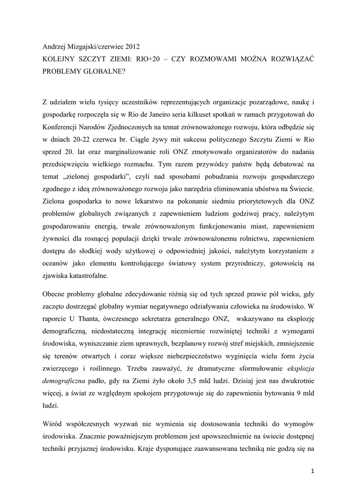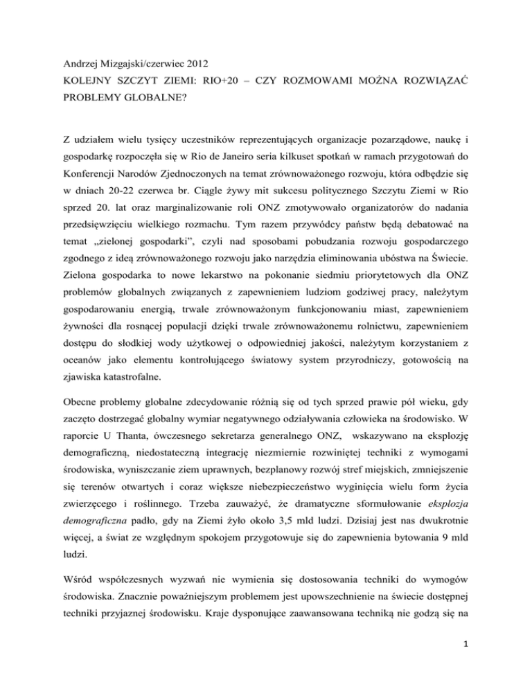 Andrzej Mizgajski/czerwiec 2012 KOLEJNY SZCZYT ZIEMI: RIO+20 – CZY ROZMOWAMI MOŻNA ROZWIĄZAĆ PROBLEMY GLOBALNE? Z udziałem wielu tysięcy uczestników reprezentujących organizacje pozarządowe, naukę i gospodarkę rozpoczęła się w Rio de Janeiro seria kilkuset spotkań w ramach przygotowań do Konferencji Narodów Zjednoczonych na temat zrównoważonego rozwoju, która odbędzie się w dniach 20-22 czerwca br. Ciągle żywy mit sukcesu politycznego Szczytu Ziemi w Rio sprzed 20. lat oraz marginalizowanie roli ONZ zmotywowało organizatorów do nadania przedsięwzięciu wielkiego rozmachu. Tym razem przywódcy państw będą debatować na temat „zielonej gospodarki”, czyli nad sposobami pobudzania rozwoju gospodarczego zgodnego z ideą zrównoważonego rozwoju jako narzędzia eliminowania ubóstwa na Świecie. Zielona gospodarka to nowe lekarstwo na pokonanie siedmiu priorytetowych dla ONZ problemów globalnych związanych z zapewnieniem ludziom godziwej pracy, należytym gospodarowaniu energią, trwale zrównoważonym funkcjonowaniu miast, zapewnieniem żywności dla rosnącej populacji dzięki trwale zrównoważonemu rolnictwu, zapewnieniem dostępu do słodkiej wody użytkowej o odpowiedniej jakości, należytym korzystaniem z oceanów jako elementu kontrolującego światowy system przyrodniczy, gotowością na zjawiska katastrofalne. Obecne problemy globalne zdecydowanie różnią się od tych sprzed prawie pół wieku, gdy zaczęto dostrzegać globalny wymiar negatywnego odziaływania człowieka na środowisko. W raporcie U Thanta, ówczesnego sekretarza generalnego ONZ, wskazywano na eksplozję demograficzną, niedostateczną integrację niezmiernie rozwiniętej techniki z wymogami środowiska, wyniszczanie ziem uprawnych, bezplanowy rozwój stref miejskich, zmniejszenie się terenów otwartych i coraz większe niebezpieczeństwo wyginięcia wielu form życia zwierzęcego i roślinnego. Trzeba zauważyć, że dramatyczne sformułowanie eksplozja demograficzna padło, gdy na Ziemi żyło około 3,5 mld ludzi. Dzisiaj jest nas dwukrotnie więcej, a świat ze względnym spokojem przygotowuje się do zapewnienia bytowania 9 mld ludzi. Wśród współczesnych wyzwań nie wymienia się dostosowania techniki do wymogów środowiska. Znacznie poważniejszym problemem jest upowszechnienie na świecie dostępnej techniki przyjaznej środowisku. Kraje dysponujące zaawansowana techniką nie godzą się na 1 udostępnianie jej na zasadach nierynkowych, czyli bez uwzględnienia prawa do własności intelektualnej. Ich zdaniem nie można dzielić się technologią za darmo, gdyż zahamowany zostałby postęp przez brak motywacji do tworzenia nowych innowacyjnych rozwiązań. Z drugiej strony kraje na niższym poziomie rozwoju technicznego wskazują na trudne do zaakceptowania koszty rozwiązań służących zmniejszeniu presji na środowisko. Problemem, który się nasila w ostatnich dziesięcioleciach jest zajmowanie terenów rolniczych pod zabudowę i inne formy zainwestowania. Wynika to z szybkiego wzrostu populacji i jeszcze szybszego rozwoju gospodarczego. Podczas gdy od końca lat 60. liczba ludzi wzrosła dwukrotnie, to globalny produkt brutto wzrósł 3,5 razy. Przeciętnie więc żyje się ludziom coraz lepiej, co ściśle wiąże się z rozszerzaniem zainwestowania terenu. Dzięki rozwojowi techniki rolniczej na świecie, także osiągnięć genetyki roślin uprawnych, nastąpił skokowy wzrost produkcji rolniczej, który proporcjonalnie zmniejszył skalę głodu. Wyzwania pozostają jednak ogromne, trzeba bowiem zapewnić lepsze wyżywienie blisko miliardowi głodujących oraz wyżywić dodatkowe 2 miliardy ludzi, którzy będą żyli około 2050 roku. Od końca lat 60. liczba mieszkańców miast wzrosła o blisko 2,5 miliarda, czyli trzykrotnie. W końcu ubiegłej dekady ogłoszono, że już ponad połowa ludzkości skupiona jest w miastach, rzadziej natomiast wspomina się o tym, że co trzeci mieszkaniec zabudowań miejskich żyje w slumsach. Przewiduje się, że cały dalszy przyrost światowej populacji trafi właśnie do obszarów zurbanizowanych. Jednocześnie coraz bardziej docenia się rolę miast jako najważniejszych obszarów dla rozwoju społeczno-gospodarczego, gdzie koncentruje się potencjał naukowy, handel, produkcja, życie kulturalne. Zauważony w raporcie U Thanta problem ekologiczny określony jako ginięcie wielu gatunków życia zwierzęcego i roślinnego nie znalazł się na liście priorytetowych zagadnień Konferencji RIO+20, co nie znaczy, że zagadnienie spadku różnorodności biologicznej przestało być przedmiotem debaty. Międzynarodowa Unia Ochrony Przyrody prowadząca sekretariat Konwencji Narodów Zjednoczonych w sprawie różnorodności biologicznej, podejmuje różne działania dla zwiększenia zainteresowania państw tym problemem. Można nawet powiedzieć, że różnorodność biologiczna ma okres bardzo dobrej koniunktury politycznej, za którą idą konkretne działania rządów. W konsekwencji na drugi plan schodzą mechanizmy kształtujące systemy przyrodnicze takie jak konkurencja między gatunkami, czy zróżnicowanie ról różnych form organizacji życia. Na tym tle powstaje pytanie o rolę 2 człowieka w sprzyjaniu jednym organizmom kosztem innych, czy też jego wpływu na różnicowanie warunków życia dla przedstawicieli świata roślin i zwierząt. Jak widać w ostatnich dziesięcioleciach nie wyeliminowano żadnego z pierwotnie dostrzeganych napięć globalnych w relacjach między człowiekiem i jego środowiskiem, natomiast mimo gwałtownego przyrostu ludności udało się ograniczyć negatywne skutki i polepszyć jakość życia ludzi. Wielkość postępu obrazuje wskaźnik średniej spodziewanej długość życia u noworodka, który w latach 1970-2009 podniósł się na świecie średnio o 13 lat i osiągnął 68 lat. Wśród zidentyfikowanych priorytetowych problemów proponowanych do dyskutowania podczas RIO+20