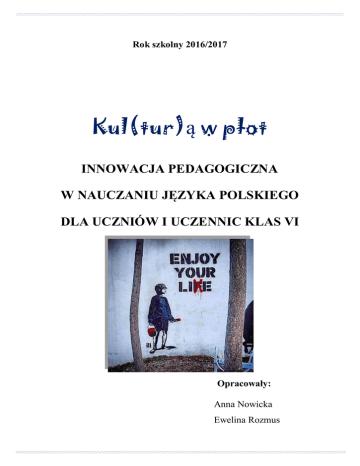 Rok szkolny 2016/2017 Kul(tur)ą w płot INNOWACJA PEDAGOGICZNA W NAUCZANIU JĘZYKA POLSKIEGO DLA UCZNIÓW I UCZENNIC KLAS VI Opracowały: Anna Nowicka Ewelina Rozmus Kul(tur)ą w płot1 – innowacja pedagogiczna w nauczaniu języka polskiego w klasie VI I WSTĘP: PODSTAWOWE INFORMACJE I UZASADNIENIE POTRZEBY INNOWACJI Innowacja będzie wprowadzana w Szkole Podstawowej im. Kardynała Stefana Wyszyńskiego w Imielinie klasie szóstej w wymiarze 1 h tygodniowo. Przewidywany czas realizacji: październik 2016 - czerwiec 2017. Nasza innowacja pedagogiczna zachowuje cele kształcenia i umiejętności uczniów określone w podstawie programowej, rozwija również umiejętności kluczowe niezbędne do podjęcia nauki na kolejnym etapie kształcenia i funkcjonowania w życiu społecznym. Innowacja będzie realizowana z uczniami i uczennicami klas VI „b” i VI „d” przez: p. Annę Nowicką (nauczycielka języka polskiego i plastyki,), p. Ewelinę Rozmus (nauczycielka języka polskiego, bibliotekarka). Kul(tur)ą w płot – innowacja pedagogiczna w nauczaniu języka polskiego w klasie VI to propozycja rozszerzenia szkolnej oferty edukacyjnej; to również próba wyjścia naprzeciw zainteresowaniom i talentom artystycznym uczniów i uczennic z klas, które poprzednim roku szkolnym uzyskały nadzwyczajne wyniki w nauce. Wprowadzając innowację, kierujemy się znajomością naszych podopiecznych, którzy w minionych latach swojej edukacji wielokrotnie wykazywali bardzo duże zaciekawienie światem kultury i ochoczo angażowali się w szkolne oraz klasowe wydarzenia kulturalne z sukcesami, wystawiając przedstawienia, kabarety czy jasełka 2. Pragniemy również skonfrontować dzieci z próbą, jaką jest udział w projekcie edukacyjnym oraz… podążyć za myślą sir Kena Robinsona: że przy wyzwaniach, przed którymi stoimy, edukacja nie potrzebuje reformy – potrzebuje transformacji. Kluczem do tej transformacji nie jest standaryzacja edukacji, ale jej personalizacja, budowanie osiągnięć na odkrywaniu indywidualnych talentów każdego 1 Tytuł innowacji zapożyczono z bloga o tematyce kulturalno-literacko-filmowej „Kulturą w płot” (http://kulturawplot.pl). 2 Vide: filmy z występów: https://www.youtube.com/watch?v=XLfUEiXBvBw, https://www.youtube.com/watch?v=d392WxPYIoE, https://www.youtube.com/watch?v=Bj7Jz6187Yc. 2 dziecka, umieszczenie uczniów w środowisku, w którym chcą się uczyć i w którym mogą naturalnie odkryć swoje prawdziwe pasje 3. W tym kontekście innowacja jest również odpowiedzią na naszą, nauczycielską, potrzebę oporu wobec szkoły, która zabija kreatywność i odbiera dzieciom wiarę w ich możliwości. Zgodnie z naszymi założeniami najważniejszym aspektem podejmowanych działań innowacyjnych ma być rozwijanie w naszych uczniach/uczennicach w takich wartości jak: wyobraźnia, aktywność, kreatywność, otwartość, wrażliwość twórcza. Objęci innowacją pedagogiczną zdobędą wiedzę z dziedziny nauk humanistycznych; rozszerzają swoje wiadomości z literatury i pogłębiają wiedzę o języku. Ponadto poznają historię książki, teatru, filmu etc., pozyskają podstawowe informacje związane z tymi dziedzinami sztuki oraz wyposażeni zostaną w bazę pojęciowo-terminologiczną. Jednak podstawowym założeniem innowacji jest kształtowanie osobowości naszych uczniów/uczennic, przygotowanie ich do świadomego odbioru sztuki, aktywnego uczestnictwa w życiu kulturalnym oraz funkcjonowania w różnych rolach w przyszłym życiu rodzinnym i społecznym. II. CELE INNOWACJI Cel ogólny: 1. Kształtowanie i doskonalenie umiejętności sprawnego poruszania się w świecie kultury, mass mediów i technologii informacyjnej; świadomego i odpowiedzialnego odbioru żywego słowa i obrazu; rozwijanie umiejętności społeczno-kulturalnych. Cele szczegółowe: 1. Poszerzanie wiedzy o kulturze (literatura, film, teatr, muzyka, malarstwo). 2. Rozwijanie umiejętności analizy dzieł literackich. 3. Rozbudzanie wrażliwości estetycznej. 4. Wyrabianie nawyku uważnego śledzenia wydarzeń kulturalnych, samodzielnego zdobywania informacji, dobierania własnej lektury doświadczeniami. 3 Cyt. za: http://kenrobinson.pl/ken-robinson-kreatywne-szkoly-fragment. 3 i dzielenia się swoimi 5. Motywowanie do czytania i krytycznego odbioru tekstów literackich, a także innych tekstów kultury. 6. Kształtowanie postaw szacunku do dziedzictwa kultury. 7. Wdrażanie do samodzielnego i twórczego rozwijania własnych zdolności i zainteresowań. 8. Kształtowanie umiejętności uzasadniania własnego stanowiska, argumentowania, kulturalnego słuchania wypowiedzi innych. 9. Kształtowanie umiejętności pracy w grupie; rozwijanie odpowiedzialności za podjęte działania jednostkowe. 10. Współtworzenie dzieła scenicznego i filmowego. 11. Doskonalenie umiejętności poprawnej wymowy, pięknej recytacji. 12. Kształtowanie umiejętności aktorskich. 13. Kształtowanie umiejętności przekładu intersemiotycznego. 14. Zapoznanie z formami dziennikarskimi, warsztatem pracy dziennikarza. III. TREŚCI NAUCZANIA 1. Związki między różnymi dziedzinami sztuki oraz pomiędzy kulturą narodową i kulturą regionu. 2. Dostrzeganie funkcji różnych tekstów kultury. 3. Społeczność lokalna i jej kultura w aspekcie historycznym, geograficznym, etnograficznym i środowiskowym. 4. Pojęcia: kultura, kultura regionalna, kultura narodowa, kultura masowa, tradycja, etnografia, folklor, arcydzieło itd. 5. Wpływ środków masowego przekazu (prasa, radio ,telewizja, Internet). 6. Powinowactwa i zależności różnych kultur. 7. Instytucje kultury: muzeum, biblioteka, kino itp. 8. Składniki dzieła teatralnego i filmowego, ich twórcy i znaczenie: scenografia, kostiumy, charakteryzacja, rekwizyty, muzyka, choreografia, oświetlenie, reżyseria. 9. Pojęcia dotyczące budowy tekstu dramatycznego, tworzyw teatralnych, różnych form i technik teatralnych (scena, akt, antra