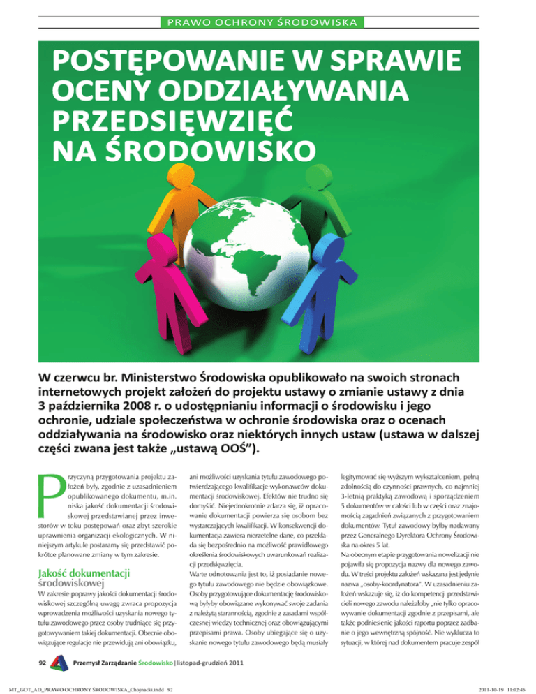 prawo ochrony środowiska Postępowanie w sprawie oceny oddziaływania przedsięwzięć na środowisko W czerwcu br. Ministerstwo Środowiska opublikowało na swoich stronach internetowych projekt założeń do projektu ustawy o zmianie ustawy z dnia 3 października 2008 r. o udostępnianiu informacji o środowisku i jego ochronie, udziale społeczeństwa w ochronie środowiska oraz o ocenach oddziaływania na środowisko oraz niektórych innych ustaw (ustawa w dalszej części zwana jest także „ustawą OOŚ”). P rzyczyną przygotowania projektu założeń były, zgodnie z uzasadnieniem opublikowanego dokumentu, m.in. niska jakość dokumentacji środowiskowej przedstawianej przez inwestorów w toku postępowań oraz zbyt szerokie uprawnienia organizacji ekologicznych. W niniejszym artykule postaramy się przedstawić pokrótce planowane zmiany w tym zakresie. Jakość dokumentacji środowiskowej W zakresie poprawy jakości dokumentacji środowiskowej szczególną uwagę zwraca propozycja wprowadzenia możliwości uzyskania nowego tytułu zawodowego przez osoby trudniące się przygotowywaniem takiej dokumentacji. Obecnie obowiązujące regulacje nie przewidują ani obowiązku, 92 ani możliwości uzyskania tytułu zawodowego potwierdzającego kwalifikacje wykonawców dokumentacji środowiskowej. Efektów nie trudno się domyślić. Niejednokrotnie zdarza się, iż opracowanie dokumentacji powierza się osobom bez wystarczających kwalifikacji. W konsekwencji dokumentacja zawiera nierzetelne dane, co przekłada się bezpośrednio na możliwość prawidłowego określenia środowiskowych uwarunkowań realizacji przedsięwzięcia. Warte odnotowania jest to, iż posiadanie nowego tytułu zawodowego nie będzie obowiązkowe. Osoby przygotowujące dokumentację środowiskową byłyby obowiązane wykonywać swoje zadania z należytą starannością, zgodnie z zasadami współczesnej wiedzy technicznej oraz obowiązującymi przepisami prawa. Osoby ubiegające się o uzyskanie nowego tytułu zawodowego będą musiały legitymować się wyższym wykształceniem, pełną zdolnością do czynności prawnych, co najmniej 3-letnią praktyką zawodową i sporządzeniem 5 dokumentów w całości lub w części oraz znajomością zagadnień związanych z przygotowaniem dokumentów. Tytuł zawodowy byłby nadawany przez Generalnego Dyrektora Ochrony Środowiska na okres 5 lat. Na obecnym etapie przygotowania nowelizacji nie pojawiła się propozycja nazwy dla nowego zawodu. W treści projektu założeń wskazana jest jedynie nazwa „osoby-koordynatora”. W uzasadnieniu założeń wskazuje się, iż do kompetencji przedstawicieli nowego zawodu należałoby „nie tylko opracowywanie dokumentacji zgodnie z przepisami, ale także podniesienie jakości raportu poprzez zadbanie o jego wewnętrzną spójność. Nie wyklucza to sytuacji, w której nad dokumentem pracuje zespół Przemysł Zarządzanie Środowisko listopad-grudzień 2011 MT_GOT_AD_PRAWO OCHRONY ŚRODOWISKA_Chojnacki.indd 92 2011-10-19 11:02:45 prawo ochrony środowiska specjalistów, jednak przygotowywanie go pod okiem koordynatora doprowadzi do opracowania spójnego dokumentu”. Na podstawie powyższego opisu nie sposób jest jednoznacznie wskazać, jakie zadania mieliby spełniać nowi specjaliści. Jednakże z całą pewnością można stwierdzić, że do podstawowych ich obowiązków należałyby koordynacja i scalanie dokumentacji środowiskowej. Propozycję zmian ocenić należy pozytywnie. Praktyka sporządzania dokumentacji środowiskowej w niektórych przypadkach w rażący sposób odbiegała od poziomu, który winien stanowić standard. Proponowane zmiany zakładają w pierwszej kolejności większą odpowiedzialność osób sporządzających dokumentację środowiskową; z tym, że nie jest to odpowiedzialność prawna, lecz raczej utrata reputacji. Ze względu na specyficzny charakter usług doradczych, jakimi są usługi polegające na sporządzaniu dokumentacji w ramach postępowań ocenowych, utrata reputacji przekładająca się na utratę kolejnych zleceń może, z punktu widzenia doradcy, stanowić bardziej dolegliwy środek niż jakiekolwiek instrumenty odpowiedzialności prawnej sensu stricto. Wprowadzenie dobrowolnej, co należy mocno podkreślić, certyfikacji usług stanowić ma potwierdzenie posiadania przez konkretnego doradcę określonej reputacji. Niezależnie od powyższego warunkiem znaczącej poprawy jakości postępowań środowiskowych jest szkolenie osób bezpośrednio odpowiedzialnych w ramach poszczególnych urzędów za kwestie postępowań środowiskowych, dotyczy to w szczególności urzędów niewielkich gmin. Osoby takie muszą stać się partnerem do dyskusji merytorycznej co do treści przedkładanej dokumentacji środowiskowej, gdyż tylko w ten sposób wymuszą jej odpowiednią jakość. w zakresie ochrony środowiska” (strona 18 i 19 projektu założeń). Uzasadniając dopuszczalność wprowadzenia proponowanych ograniczeń w świetle dyrektywy 85/337/EWG wskazuje się na wyrok Europejskiego Trybunału Sprawiedliwości z dn. 15 października 2009 r. w sprawie Djurgården‑Lilla Värtans Miljöskyddsförening przeciwko Stockholms kommun genom dess marknämnd (sprawa C-263/08), istnienie w niektórych państwach członkowskich ograniczeń w udziale organizacji ekologicznych w postępowaniach ocenowych niekwestionowanych dotychczas przez Komisję Europejską (chodzi m.in. o Francję, Luksemburg i Hiszpanię) oraz art. 11 ust. 1 rozporządzenia (WE) nr 1367/2006 Parlamentu Europejskiego i Rady z dn. 6 września 2006 r. w sprawie zastosowania postanowień Konwencji z Aarhus o dostępie do informacji, udziale społeczeństwa w podejmowaniu decyzji oraz dostępie do sprawiedliwości w sprawach dotyczących środowiska do instytucji i organów Wspólnoty. Nie podzielam stanowiska prezentowanego w uzasadnieniu projektu założeń, iż z wyroku w sprawie C-263/08 wynika dopuszczalność wprowadzenia