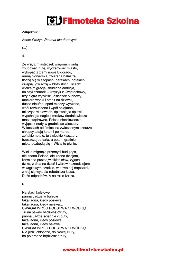 Załączniki: Adam Ważyk, Poemat dla dorosłych (...) 4. Ze wsi, z miasteczek wagonami jadą zbudować hutę, wyczarować miasto, wykopać z ziemi nowe Eldorado, armią pionierską, zbieraną hałastrą tłoczą się w szopach, barakach, hotelach, człapią i gwiżdżą w błotnistych ulicach: wielka migracja, skudlona ambicja, na szyi sznurek – krzyżyk z Częstochowy, trzy piętra wyzwisk, jasieczek puchowy, maciora wódki i ambit na dziewki, dusza nieufna, spod miedzy wyrwana, wpół rozbudzona i wpół obłąkana, milcząca w słowach, śpiewająca śpiewki, wypchnięta nagle z mroków średniowiecza masa wędrowna, Polska nieczłowiecza wyjąca z nudy w grudniowe wieczory… W koszach od śmieci na zwieszonym sznurze chłopcy latają kotami po murze, żeńskie hotele, te świeckie klasztory, trzeszczą od tarła, a potem grafinie miotu pozbędą się – Wisła tu płynie. Wielka migracja przemysł budująca, nie znana Polsce, ale znana dziejom, karmiona pustką wielkich słów, żyjąca dziko, z dnia na dzień i wbrew kaznodziejom – w węglowym czadzie, w powolnej męczarni, z niej się wytapia robotnicza klasa. Dużo odpadków. A na razie kasza. 6. Na stacji kolejowej panna Jadzia w bufecie taka ładna, kiedy poziewa, taka ładna, kiedy nalewa… UWAGA! WRÓG PODSUWA CI WÓDKĘ! Tu na pewno będziesz otruty, panna Jadzia ściągnie ci buty, taka ładna, kiedy poziewa, taka ładna, kiedy nalewa… UWAGA! WRÓG PODSUWA CI WÓDKĘ! Nie jedź, chłopcze, do Nowej Huty, bo po drodze będziesz otruty, www.filmotekaszkolna.pl niech ustrzeże cię plakat wężowy i w żołądku dorsz narodowy: UWAGA! WRÓG PODSUWA CI WÓDKĘ! 8. To prawda, kiedy miedziaki nudziarstwa zagłuszają wielki cel wychowawczy, kiedy sępy abstrakcji wyjadają nam mózgi, kiedy zamyka się uczniów w podręcznikach bez okien, kiedy redukuje się język do trzydziestu zaklęć, kiedy gaśnie lampa wyobraźni, kiedy dobrzy ludzie z księżyca odmawiają nam prawa do gustu, to prawda, wtedy nam grozi tępota. 11. Spekulanci zaciągnęli do cichego piekła w ustronnej willi za miastem – uciekła. Zabłąkała się w nocy pijana, na betonie przeleżała do rana. Wyrzucono ją ze szkoły artystycznej za brak moralności socjalistycznej. Truła się raz – odratowano. Truła się drugi raz – pochowano. Wszystko tu stare. Stare są hycle od moralności socjalistycznej. 15. Są ludzie spracowani, są ludzie z Nowej Huty, którzy nigdy nie byli w teatrze, są polskie jabłka niedostępne dla dzieci, są dzieci wzgardzone przez występnych lekarzy, są chłopcy zmuszani do kłamstwa, są dziewczyny zmuszane do kłamstwa, są stare żony wyrzucane z mieszkań przez mężów, są przemęczeni, konający na zawał serca, są ludzie oczerniani, opluci, są odzierani na ulicach przez zwykłych opryszków, dla których się szuka definicji prawnej, są ludzie czekający na papierek, są czekający na sprawiedliwość, są ludzie, którzy długo czekają. www.filmotekaszkolna.pl Upominamy się na ziemi o ludzi spracowanych, o klucze do drzwi pasujące, o izby z oknami, o ściany bez grzybów, o nienawiść do papierków, o drogi święty czas ludzki, o bezpieczny powrót do domu, o proste odróżnianie słowa od czynu. Upominamy się na ziemi, o którą nie graliśmy w kości, o którą milion padł w bitwach, o jasne prawdy, o zboże wolności, o rozum płomienny, o rozum płomienny, upominamy się codziennie, upominamy się Partią. www.filmotekaszkolna.pl Obrazy Jerzego Dudy Gracza: „Hamlet polny” „Kamion-Melancholia” „Motyw polski” www.filmotekaszkolna.pl