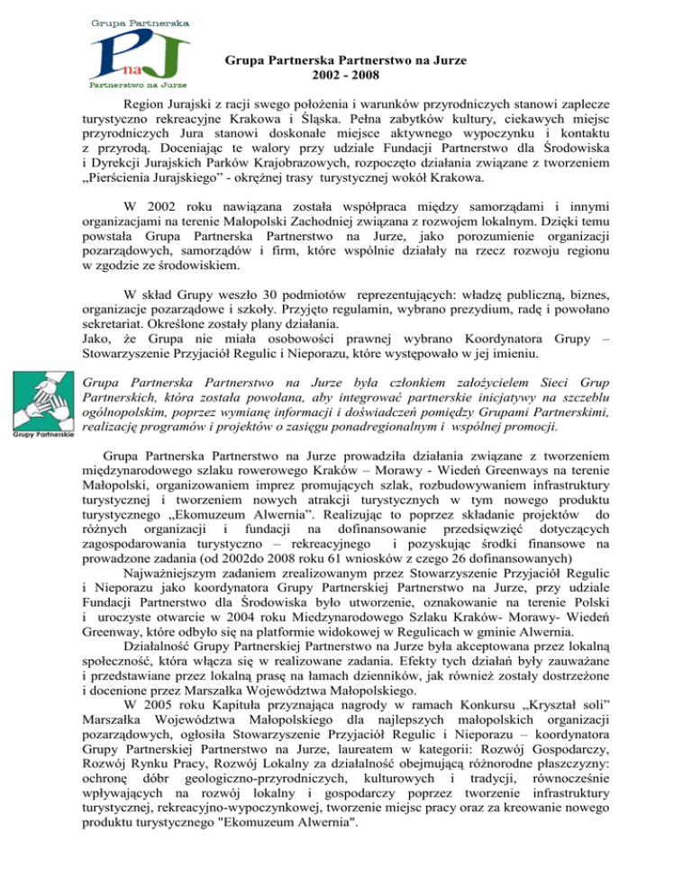 Grupa Partnerska Partnerstwo na Jurze 2002 - 2008 Region Jurajski z racji swego połoŜenia i warunków przyrodniczych stanowi zaplecze turystyczno rekreacyjne Krakowa i Śląska. Pełna zabytków kultury, ciekawych miejsc przyrodniczych Jura stanowi doskonałe miejsce aktywnego wypoczynku i kontaktu z przyrodą. Doceniając te walory przy udziale Fundacji Partnerstwo dla Środowiska i Dyrekcji Jurajskich Parków Krajobrazowych, rozpoczęto działania związane z tworzeniem „Pierścienia Jurajskiego” - okręŜnej trasy turystycznej wokół Krakowa. W 2002 roku nawiązana została współpraca między samorządami i innymi organizacjami na terenie Małopolski Zachodniej związana z rozwojem lokalnym. Dzięki temu powstała Grupa Partnerska Partnerstwo na Jurze, jako porozumienie organizacji pozarządowych, samorządów i firm, które wspólnie działały na rzecz rozwoju regionu w zgodzie ze środowiskiem. W skład Grupy weszło 30 podmiotów reprezentujących: władzę publiczną, biznes, organizacje pozarządowe i szkoły. Przyjęto regulamin, wybrano prezydium, radę i powołano sekretariat. Określone zostały plany działania. Jako, Ŝe Grupa nie miała osobowości prawnej wybrano Koordynatora Grupy – Stowarzyszenie Przyjaciół Regulic i Nieporazu, które występowało w jej imieniu. Grupa Partnerska Partnerstwo na Jurze była członkiem załoŜycielem Sieci Grup Partnerskich, która została powołana, aby integrować partnerskie inicjatywy na szczeblu ogólnopolskim, poprzez wymianę informacji i doświadczeń pomiędzy Grupami Partnerskimi, realizację programów i projektów o zasięgu ponadregionalnym i wspólnej promocji. Grupa Partnerska Partnerstwo na Jurze prowadziła działania związane z tworzeniem międzynarodowego szlaku rowerowego Kraków – Morawy - Wiedeń Greenways na terenie Małopolski, organizowaniem imprez promujących szlak, rozbudowywaniem infrastruktury turystycznej i tworzeniem nowych atrakcji turystycznych w tym nowego produktu turystycznego „Ekomuzeum Alwernia”. Realizując to poprzez składanie projektów do róŜnych organizacji i fundacji na dofinansowanie przedsięwzięć dotyczących zagospodarowania turystyczno – rekreacyjnego i pozyskując środki finansowe na prowadzone zadania (od 2002do 2008 roku 61 wniosków z czego 26 dofinansowanych) NajwaŜniejszym zadaniem zrealizowanym przez Stowarzyszenie Przyjaciół Regulic i Nieporazu jako koordynatora Grupy Partnerskiej Partnerstwo na Jurze, przy udziale Fundacji Partnerstwo dla Środowiska było utworzenie, oznakowanie na terenie Polski i uroczyste otwarcie w 2004 roku Miedzynarodowego Szlaku Kraków- Morawy- Wiedeń Greenway, które odbyło się na platformie widokowej w Regulicach w gminie Alwernia. Działalność Grupy Partnerskiej Partnerstwo na Jurze była akceptowana przez lokalną społeczność, która włącza się w realizowane zadania. Efekty tych działań były zauwaŜane i przedstawiane przez lokalną prasę na łamach dzienników, jak równieŜ zostały dostrzeŜone i docenione przez Marszałka Województwa Małopolskiego. W 2005 roku Kapituła przyznająca nagrody w ramach Konkursu „Kryształ soli” Marszałka Województwa Małopolskiego dla najlepszych małopolskich organizacji pozarządowych, ogłosiła Stowarzyszenie Przyjaciół Regulic i Nieporazu – koordynatora Grupy Partnerskiej Partnerstwo na Jurze, laureatem w kategorii: Rozwój Gospodarczy, Rozwój Rynku Pracy, Rozwój Lokalny za działalność obejmującą róŜnorodne płaszczyzny: ochronę dóbr geologiczno-przyrodniczych, kulturowych i tradycji, równocześnie wpływających na rozwój lokalny i gospodarczy poprzez tworzenie infrastruktury turystycznej, rekreacyjno-wypoczynkowej, tworzenie miejsc pracy oraz za kreowanie nowego produktu turystycznego "Ekomuzeum Alwernia". Kapituła oprócz tego przyznała Nagrodę Grand Prix Stowarzyszeniu Przyjaciół Regulic i Nieporazu za unikalne połączenie działań promujących rozwój lokalny, wzrost miejsc pracy z działaniami z zakresu ochrony tradycji. Projekty charakteryzowały się z jednej strony harmonijnym wkomponowaniem w środowisko naturalne, a z drugiej strony łączyły elementy promocji gospodarczej oraz współpracy ponadregionalnej i międzynarodowej. Programy realizowane w latach 2002-2008 EKOLOGIA I TURYSTYKA działania związane z rozwojem infrastruktury turystycznej Realizowane programy: □ Szlak Wiedeń-Kraków Greenway □ Ekomuzeum □ Agroturystyka □ Szkoły dla ekorozwoju BEZROBOCIE I WYKLUCZENIE SPOŁECZNE przeciwdziałanie bezrobociu i patologii społecznej Realizowane programy przy współpracy z Powiatowym Urzędem Pracy w Chrzanowie: □ Szybki start □ Program oŜywienia lokalnego □ Szybkie reagowanie Szlak Kraków-Morawy-Wiedeń Greenways Jednym z elementów działań jest tworzenie modelowych platform widokowych, będących miejscami odpoczynku na szlaku oraz tworzenie Ekomuzeum jako nowej atrakcji turystycznej. Platformy widokowe powstają na wzgórzach: Grzmiączka w Regulicach, Kamionka w Kwaczale i wzniesieniach w Grojcu i PodłęŜu. Roztaczają się z nich niepowtarzalne widoki na bliskie i odległe zakątki Jury Krakowsko – Częstochowskiej, Dolinę Wisły, Beskidy, a nawet Tatry. Przygotowywane są w tych punktach widokowych miejsca do prowadzenia obserwacji panoramicznych krajobrazów oraz miejsca odpoczynku z parkingiem, chatą wypoczynkową w stylu architektury drewnianej ze stołami, ławkami i paleniskiem na ognisko. Ekomuzeum Do tworzenia nowych atrakcji turystycznych wykorzystano bogactwo i róŜnorodność przyrodniczo – geologiczną Jury oraz dorobek kulturowy regionu. Tworzone Ekomuzeum jest nową formą prezentacji dziedzictwa przyrodniczo-kulturowego. Od kilku lat dzięki Stowarzyszeniu powstaje Ekomuzeum Alwerni, obejmujące Zespół osobliwości geologiczno-przyrodniczych Jury oraz Warsztat rzemiosła garncarskiego. JuŜ teraz moŜna zaczerpnąć czystej jurajskiej wody z zagospodarowanego źróde