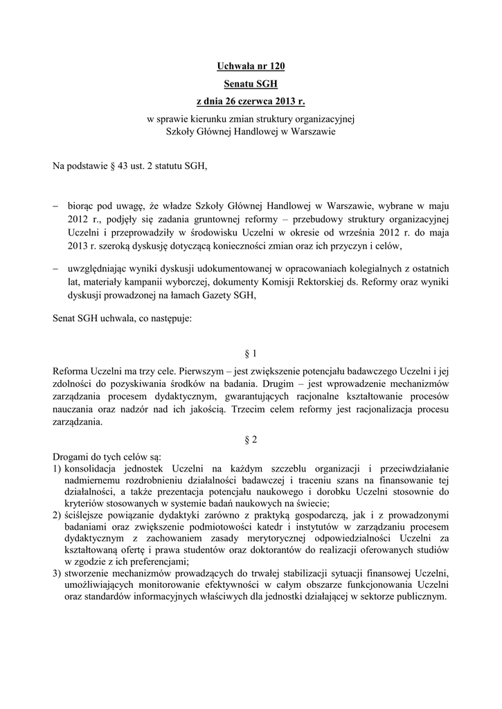 Uchwała nr 120 Senatu SGH z dnia 26 czerwca 2013 r. w sprawie kierunku zmian struktury organizacyjnej Szkoły Głównej Handlowej w Warszawie Na podstawie § 43 ust. 2 statutu SGH, biorąc pod uwagę, że władze Szkoły Głównej Handlowej w Warszawie, wybrane w maju 2012 r., podjęły się zadania gruntownej reformy – przebudowy struktury organizacyjnej Uczelni i przeprowadziły w środowisku Uczelni w okresie od września 2012 r. do maja 2013 r. szeroką dyskusję dotyczącą konieczności zmian oraz ich przyczyn i celów, uwzględniając wyniki dyskusji udokumentowanej w opracowaniach kolegialnych z ostatnich lat, materiały kampanii wyborczej, dokumenty Komisji Rektorskiej ds. Reformy oraz wyniki dyskusji prowadzonej na łamach Gazety SGH, Senat SGH uchwala, co następuje: §1 Reforma Uczelni ma trzy cele. Pierwszym – jest zwiększenie potencjału badawczego Uczelni i jej zdolności do pozyskiwania środków na badania. Drugim – jest wprowadzenie mechanizmów zarządzania procesem dydaktycznym, gwarantujących racjonalne kształtowanie procesów nauczania oraz nadzór nad ich jakością. Trzecim celem reformy jest racjonalizacja procesu zarządzania. §2 Drogami do tych celów są: 1) konsolidacja jednostek Uczelni na każdym szczeblu organizacji i przeciwdziałanie nadmiernemu rozdrobnieniu działalności badawczej i traceniu szans na finansowanie tej działalności, a także prezentacja potencjału naukowego i dorobku Uczelni stosownie do kryteriów stosowanych w systemie badań naukowych na świecie; 2) ściślejsze powiązanie dydaktyki zarówno z praktyką gospodarczą, jak i z prowadzonymi badaniami oraz zwiększenie podmiotowości katedr i instytutów w zarządzaniu procesem dydaktycznym z zachowaniem zasady merytorycznej odpowiedzialności Uczelni za kształtowaną ofertę i prawa studentów oraz doktorantów do realizacji oferowanych studiów w zgodzie z ich preferencjami; 3) stworzenie mechanizmów prowadzących do trwałej stabilizacji sytuacji finansowej Uczelni, umożliwiających monitorowanie efektywności w całym obszarze funkcjonowania Uczelni oraz standardów informacyjnych właściwych dla jednostki działającej w sektorze publicznym. §3 Rektor realizuje program zmian poprzez wydawane zarządzenia oraz zgodne z niniejszą uchwałą ukierunkowanie prac nad odpowiednimi zmianami w statucie Uczelni i w innych aktach prawnych. Regulacje te określają w szczególności: 1) zasady i tryb łączenia kolegiów w szkoły; 2) jednostki (instytuty i katedry), które znajdą się w nowych szkołach; 3) sposób organizacji dydaktyki w nowej strukturze Uczelni. §4 W sferze procesu zmiany struktury i zarządzania należy: 1) wydzielić w strukturze Uczelni trzy szkoły jako jednostki podstawowe – Szkołę Ekonomii, Szkołę Biznesu i Szkołę Polityki Publicznej – poprzez zgodne ze strukturą kolegialną połączenie Kolegium Analiz Ekonomicznych i Kolegium Gospodarki Światowej (Szkoła Ekonomii), Kolegium Nauk o Przedsiębiorstwie i Kolegium Zarządzania i Finansów (Szkoła Biznesu) oraz przekształcenie Kolegium Ekonomiczno-Społecznego w Szkołę Polityki Publicznej; 2) dokonać następnie przemieszczeń jednostek organizacyjnych pomiędzy szkołami, tak by liczba uprawnień dla Uczelni nie zmniejszyła się; 3) zwiększyć autonomię jednostek podstawowych poprzez decentralizację procesów decyzyjnych tam, gdzie nie jest wymagana koordynacja zwierzchnia; 4) przestrzegać należytej staranności w przygotowaniu aktów prawnych związanych z procesem zmiany struktury. §5 W sferze procesu prowadzenia badań naukowych należy: 1) wykazać troskę o istniejące specjalności Uczelni oraz dbałość o rozwój priorytetowych kierunków badań; 2) wprowadzić system motywacyjny promujący jakość badań naukowych i procesu kształcenia; 3) prowadzić proces konsolidacji i migracji jednostek w sposób podporządkowany procesowi badawczemu. §6 W sferze procesu kształcenia należy: 1) przyporządkować kierunki studiów kolegiom (a następnie szkołom), które posiadają stosowne uprawnienia i potrafią udokumentować potencjał do prowadzenia zajęć bez narażania Uczelni na dodatkowe koszty; 2) zachować zobowiązania Uczelni do umożliwienia studiów wszystkim studentom i uczestnikom studiów doktoranckich, którzy wcześniej podjęli kształcenie na danym kierunku lub w danej edycji studiów doktoranckich w danym kolegium; 3) utrzymać wspólny zestaw przedmiotów stanowiących podstawę do dalszych studiów i decydujących o tożsamości wychowanków SGH; 4) poddać wspólny zestaw przedmiotów oraz ogólnouczelniane przedmioty do wyboru nadzorowi Senackiej Komisji Programowej, a nadzorowi właściwych rad naukowych szkół – przedmioty kierunkowe, specjalnościowe i kierunkowe przedmioty do wyboru; 5) utrzymać jednolitą rekrutację na Uczelnię na studiach licencjackich; 6) wprowadzić egzamin wstępny na studia niestacjonarne magisterskie gwarantujący selekcję kandydatów przygotowanych do studiów w stopniu nie zagrażającym jakości tych studiów; 7) utrzymać swobodny wybór kierunku studiów w trakcie drugiego semestru studiów licencjackich oraz utrzymać swobodny wybór zajęć i wykładowców przez studentów, przy zachowaniu zasady racjonalnego gospodarowania zasobami Uczelni; 8) co najmniej utrzymać wymiar godzinowy nauki języków obcych; 9) utrzymać organizację dydaktyki w ogólnouczelnianych dziekanatach studiów wszystkich stopni, z zapewnieniem szkołom kontroli nad tym procesem poprzez przyporządkowanie decyzji koordynacyjnych w obszarze kierunku studiów prodziekanom szkół, które prowadzą te kierunki. §7 Terminarz i ścieżkę przejścia od struktury kolegialnej do wspomnianych szkół określa załącznik do uchwały. Rektor może dokonywać uzasadnionych zmian w przyjętym terminarzu, przedstawiając uzasadnienia na najbliższym posiedzeniu Senatu. §8 Uchwała wchodzi w życie z dniem podjęcia.