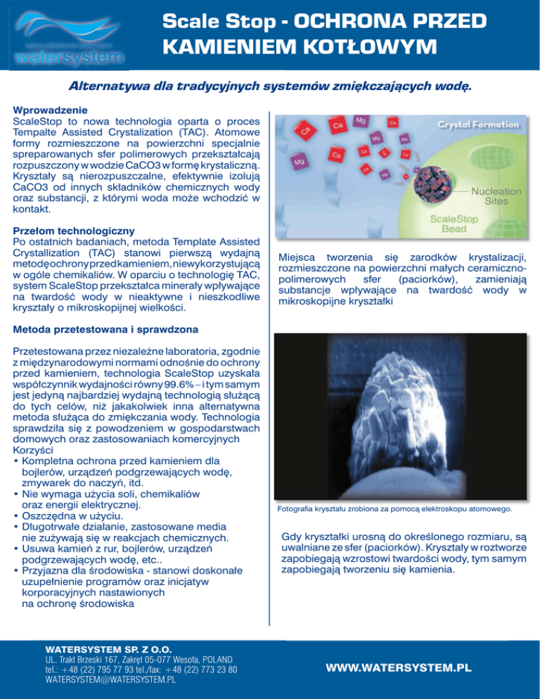Scale Stop - OCHRONA PRZED KAMIENIEM KOTŁOWYM Alternatywa dla tradycyjnych systemów zmiękczających wodę. Wprowadzenie ScaleStop to nowa technologia oparta o proces Tempalte Assisted Crystalization (TAC). Atomowe formy rozmieszczone na powierzchni specjalnie spreparowanych sfer polimerowych przekształcają rozpuszczony w wodzie CaCO3 w formę krystaliczną. Kryształy są nierozpuszczalne, efektywnie izolują CaCO3 od innych składników chemicznych wody oraz substancji, z którymi woda może wchodzić w kontakt. Przełom technologiczny Po ostatnich badaniach, metoda Template Assisted Crystallization (TAC) stanowi pierwszą wydajną metodę ochrony przed kamieniem, niewykorzystującą w ogóle chemikaliów. W oparciu o technologię TAC, system ScaleStop przekształca minerały wpływające na twardość wody w nieaktywne i nieszkodliwe kryształy o mikroskopijnej wielkości. Miejsca tworzenia się zarodków krystalizacji, rozmieszczone na powierzchni małych ceramicznopolimerowych sfer (paciorków), zamieniają substancje wpływające na twardość wody w mikroskopijne kryształki Metoda przetestowana i sprawdzona Przetestowana przez niezależne laboratoria, zgodnie z międzynarodowymi normami odnośnie do ochrony przed kamieniem, technologia ScaleStop uzyskała współczynnik wydajności równy 99.6% – i tym samym jest jedyną najbardziej wydajną technologią służącą do tych celów, niż jakakolwiek inna alternatywna metoda służąca do zmiękczania wody. Technologia sprawdziła się z powodzeniem w gospodarstwach domowych oraz zastosowaniach komercyjnych Korzyści • Kompletna ochrona przed kamieniem dla bojlerów, urządzeń podgrzewających wodę, zmywarek do naczyń, itd. • Nie wymaga użycia soli, chemikaliów oraz energii elektrycznej. • Oszczędna w użyciu. • Długotrwałe działanie, zastosowane media nie zużywają się w reakcjach chemicznych. • Usuwa kamień z rur, bojlerów, urządzeń podgrzewających wodę, etc.. • Przyjazna dla środowiska - stanowi doskonałe uzupełnienie programów oraz inicjatyw korporacyjnych nastawionych na ochronę środowiska WATERSYSTEM SP. Z O.O. UL. Trakt Brzeski 167, Zakręt 05-077 Wesoła, POLAND tel.: +48 (22) 795 77 93 tel./fax: +48 (22) 773 23 80 [email protected] Fotografia kryształu zrobiona za pomocą elektroskopu atomowego. Gdy kryształki urosną do określonego rozmiaru, są uwalniane ze sfer (paciorków). Kryształy w roztworze zapobiegają wzrostowi twardości wody, tym samym zapobiegają tworzeniu się kamienia. WWW.WATERSYSTEM.PL Scale Stop - OCHRONA PRZED KAMIENIEM KOTŁOWYM ScaleStop Zastosowania Sektor handlu i usług: • • • • • Hotele, Szpitale, Budynki mieszkalne, Myjnie samochodowe, Restauracje, Bary, Pralnie. Filtracja przed urządzeniami RO Kotłownie, Wieże chłodnicze Instalacje wodne • Zmywarki • Piece konwekcyjne • Ekspresy do kawy ScaleStop : dane techniczne System Przepływ max. NSS-744C 38 I/min NSS-844C 45 I/min NSS-948C 60 I/min NSS-1054C 76 I/min NSS-1252C 114 I/min NSS-1465C 189 I/min NSS-1665C 274 I/min (2) 1465 378 I/min (2) 1665 568 I/min (4) 1465 757 I/min (3) 1665 852 I/min (5) 1465 946 I/min (4) 1665 1136 I/min (5) 1665 1419 I/min (6) 1665 1703 I/min Parametry wody zasilającej • • • • • • • • • pH Twardość, max. Temperatura Chlor Żelazo Mangan Copper Olej & H2S Polyfosfaty 6.5 to 8.5 72°D/128°F/75 (1300m9/I CaCo3) 5-60° C <3ppm 0.3 mg/l 0.05 mg/l 1.3 mg/l Wymaga usunięcia Wymagają usunięcia WATERSYSTEM SP. Z O.O. UL. Trakt Brzeski 167, Zakręt 05-077 Wesoła, POLAND tel.: +48 (22) 795 77 93 tel./fax: +48 (22) 773 23 80 [email protected] Certyfikat ScaleStop został przetestowany przez WQA. WWW.WATERSYSTEM.PL