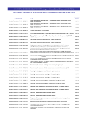 WYDAWNICTWA IZBY GOSPODARCZEJ GAZOWNICTWA dostępne w Bibliotece Głównej AGH (stan na dzień 07.07.2016) PUBLICATIONS OF THE CHAMBER OF THE NATURAL GAS INDUSTRY available at AGH-UST Main Library (as for 07.07.2016) WYDAWNICTWO TYTUŁ SYGNATURA BGA GH Standard Techniczny ST-IGG-0205:2011 Ocena jakości gazów ziemnych. Część 1: Chromatografy gazowe procesowe do analizy składu gazu ziemnego N.93744 Standard Techniczny ST-IGG-0205:2015 Ocena jakości gazów ziemnych. Część 1: Chromatografy gazowe procesowe do analizy składu gazu ziemnego N.94548 Standard Techniczny ST-IGG-0206:2015 Ocena jakości gazów ziemnych. Część 1: Chromatografy gazowe laboratoryjne do analizy składu gazu ziemnego N.94549 Standard Techniczny ST-IGG-0207:2015 Protokół komunikacyjny GAZ-MODEM 3 N.94550 Standard Techniczny ST-IGG-0301:2012 Próby ciśnieniowe gazociągów z PE o maksymalnym ciśnieniu roboczym do 0,5 MPa włącznie N.93745 Standard Techniczny ST-IGG-0302:2013 Próby ciśnieniowe gazociągów z PE o maksymalnym ciśnieniu roboczym powyżej 0,5 MPa do 1,0 MPa włącznie N.93746 Standard Techniczny ST-IGG-0401:2010 Sieci gazowe. Strefy zagrożenia wybuchem. Ocena i wyznaczanie N.93747 Standard Techniczny ST-IGG-0401:2015 Sieci gazowe. Strefy zagrożenia wybuchem. Ocena i wyznaczanie N.94551 Standard Techniczny ST-IGG-0501:2009 Stacje gazowe w przesyle i dystrybucji dla ciśnień wejściowych do 10 MPa włącznie. Wymagania w zakresie projektowania, budowy oraz przekazania do użytkowania N.93748 Standard Techniczny ST-IGG-0502:2010 Instalacje redukcji ciśnienia i/lub pomiaru gazu na przyłączach. Wymagania w zakresie projektowania, budowy oraz przekazania do użytkowania N.93749 Standard Techniczny ST-IGG-0503:2011 Stacje gazowe w przesyle i dystrybucji dla ciśnień wejściowych do 10 MPa włącznie oraz instalacje redukcji ciśnienia i/lub pomiaru gazu na przyłączach. Wymagania w zakresie obsługi N.93750 Standard Techniczny ST-IGG-0601:2012 Ochrona przed korozją zewnętrzną stalowych gazociągów lądowych. Wymagania funkcjonalne i zalecenia N.93751 Standard Techniczny ST-IGG-0602:2013 Ochrona przed korozją zewnętrzną stalowych gazociągów lądowych. Ochrona katodowa. Projektowanie, budowa i użytkowanie N.93752 Standard Techniczny ST-IGG-0702:2012 Nawanianie paliw gazowych. Wymagania dotyczące postępowania z środkami nawaniającymi oraz ich przechowywania i transportu N.93753 Standard Techniczny ST-IGG-0703:2012 Nawanianie paliw gazowych. Instalacje do nawaniania paliw gazowych N.93754 Standard Techniczny ST-IGG-0705:2012 Nawanianie paliw gazowych. Metody oznaczania zawartości tetrahydrotiofenu (THT) N.93755 Standard Techniczny ST-IGG-0901:2013 Gazociągi i instalacje gazownicze. Obliczenia wytrzymałościowe N.93756 Standard Techniczny ST-IGG-1001:2011 Gazociągi. Oznakowanie trasy gazociągów. Wymagania ogólne N.93757 Standard Techniczny ST-IGG-1001:2015 Gazociągi. Oznakowanie trasy gazociągów. Wymagania ogólne N.94552 Standard Techniczny ST-IGG-1002:2011 Gazociągi. Oznakowanie ostrzegające i lokalizacyjne. Wymagania i badania N.93758 Standard Techniczny ST-IGG-1002:2015 Gazociągi. Oznakowanie ostrzegające i lokalizacyjne. Wymagania i badania N.94553 Standard Techniczny ST-IGG-1003:2011 Gazociagi. Słupki oznaczeniowe i oznaczeniowo-pomiarowe. Wymagania i badania N.93759 Standard Techniczny ST-IGG-1003:2015 Gazociagi. Słupki oznaczeniowe i oznaczeniowo-pomiarowe. Wymagania i badania N.94554 Standard Techniczny ST-IGG-1004:2011 Gazociągi. Tablice orientacyjne. Wymagania i badania N.93760 Standard Techniczny ST-IGG-1004:2015 Gazociągi. Tablice orientacyjne. Wymagania i badania N.94555 Standard Techniczny ST-IGG-1101:2011 Połączenia PE/stal dla gazu ziemnego wraz ze stalowymi elementami do włączeń oraz elementami do przyłączeń N.93761 Standard Techniczny ST-IGG-1201:2010 Metoda próżniowa. Odpowietrzanie i napełnianie gazem ziemnym sieci gazowej N.93762 Standard Techniczny ST-IGG-1202:2010 Metoda próżniowa. Odpowietrzanie i napełnianie gazem ziemnym instalacji gazowych. Kontrolna próba szczelności N.93771 Standard Techniczny ST-IGG-1401:2010 Kody kreskowe dla urządzeń w punktach gazowych. Kody kreskowe dla gazomierzy miechowych N.93772 Standard Techniczny ST-IGG-1401:2015 Kody kreskowe dla urządzeń w punktach gazowych. Kody kreskowe dla gazomierzy miechowych N.94556 Standard Techniczny ST-IGG-1402:2010 Kody kreskowe dla urządzeń w punktach gazowych. Kody kreskowe dla reduktorów N.93773 Standard Techniczny ST-IGG-1402:2015 Kody kreskowe dla urządzeń w punktach gazowych. Kody kreskowe dla reduktorów N.94557 Standard Techniczny ST-IGG-1403:2010 Kody kreskowe dla urządzeń w punktach gazowych. Kody kreskowe dla plomb N.93774 Standard Techniczny ST-IGG-1403:2015 Kody kreskowe dla urządzeń w punktach gazowych. Kody kreskowe dla plomb N.94558 Standard Techniczny ST-IGG-1501:2011 Filtry do stosowania na sieciach gazowych N.93775 Standard Techniczny ST-IGG-1501:2015 Filtry do stosowania na sieciach gazowych N.94559 Standard Techniczny ST-IGG-1601:2012 Projektowanie, budowa i użytkowanie stacji CNG. Wymagania i zalecenia N.93776 Standard Techniczny ST-IGG-1602:2012 Urządzenia do tankowania pojazdów zasilanych sprężonym gazem ziemnym CNG do ciśnień tankowania poniżej 20 MPa N.93777 Standard Techniczny ST-IGG-0101:2014 Wytyczne wzorcowania gazomierzy przy ciśnieniu pr > 4 bar N.94330 Standard Techniczny ST-IGG-0201:2014 Protokół komunikacyjny SMART-GAS N.94331 Standard Techniczny ST-IGG-0202:2014 Pomiary i rozliczenia paliwa gazowego N.94332 Standard Techniczny ST-IGG-0504:2014 Zespoły gazowe na przyłączach. Wymagania w zakresie obsługi N.94333 Standard Techniczny ST-IGG-0704:2014 Nawanianie paliw gazowych. Kontrola nawaniania paliw gazowych metodami odorymetrycznymi N.94334 Standard Techniczny ST-IGG-1201:2014 Metoda próżniowa. Odpowietrzanie i napełnianie gazem ziemnym sieci gazowej N.94335 Standard Techniczny ST-IGG-1202:201