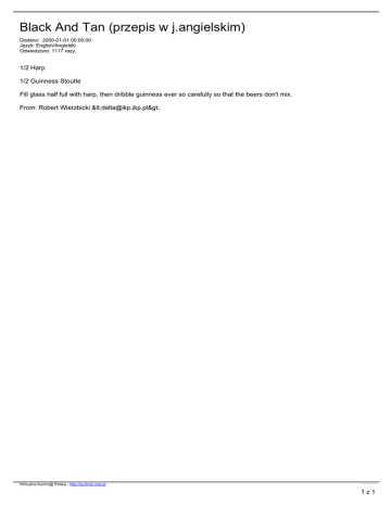 Black And Tan (przepis w j.angielskim) Dodano: 2000-01-01 00:00:00 Język: English/Angielski Odwiedzono: 1117 razy. 1/2 Harp 1/2 Guinness StoutIe Fill glass half full with harp, then dribble guinness ever so carefully so that the beers don't mix. From: Robert Wierzbicki <[email protected]> Wirtualna Kuchni@ Polska - http://kuchnia.now.pl przepis nr 3732, plik wygenerowano 2017.03.02 23:28 1z1