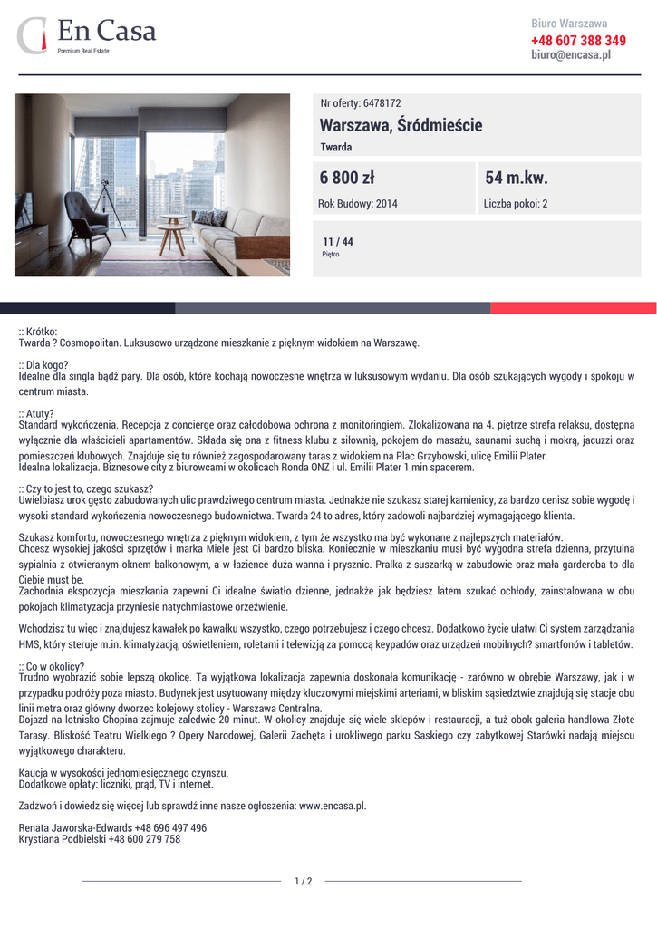 Biuro Warszawa +48 607 388 349 [email protected] Nr oferty: 6478172 Warszawa, Śródmieście Twarda 6 800 zł 54 m.kw. Rok Budowy: 2014 Liczba pokoi: 2 11 / 44 Piętro :: Krótko: Twarda ? Cosmopolitan. Luksusowo urządzone mieszkanie z pięknym widokiem na Warszawę. :: Dla kogo? Idealne dla singla bądź pary. Dla osób, które kochają nowoczesne wnętrza w luksusowym wydaniu. Dla osób szukających wygody i spokoju w centrum miasta. :: Atuty? Standard wykończenia. Recepcja z concierge oraz całodobowa ochrona z monitoringiem. Zlokalizowana na 4. piętrze strefa relaksu, dostępna wyłącznie dla właścicieli apartamentów. Składa się ona z fitness klubu z siłownią, pokojem do masażu, saunami suchą i mokrą, jacuzzi oraz pomieszczeń klubowych. Znajduje się tu również zagospodarowany taras z widokiem na Plac Grzybowski, ulicę Emilii Plater. Idealna lokalizacja. Biznesowe city z biurowcami w okolicach Ronda ONZ i ul. Emilii Plater 1 min spacerem. :: Czy to jest to, czego szukasz? Uwielbiasz urok gęsto zabudowanych ulic prawdziwego centrum miasta. Jednakże nie szukasz starej kamienicy, za bardzo cenisz sobie wygodę i wysoki standard wykończenia nowoczesnego budownictwa. Twarda 24 to adres, który zadowoli najbardziej wymagającego klienta. Szukasz komfortu, nowoczesnego wnętrza z pięknym widokiem, z tym że wszystko ma być wykonane z najlepszych materiałów. Chcesz wysokiej jakości sprzętów i marka Miele jest Ci bardzo bliska. Koniecznie w mieszkaniu musi być wygodna strefa dzienna, przytulna sypialnia z otwieranym oknem balkonowym, a w łazience duża wanna i prysznic. Pralka z suszarką w zabudowie oraz mała garderoba to dla Ciebie must be. Zachodnia ekspozycja mieszkania zapewni Ci idealne światło dzienne, jednakże jak będziesz latem szukać ochłody, zainstalowana w obu pokojach klimatyzacja przyniesie natychmiastowe orzeźwienie. Wchodzisz tu więc i znajdujesz kawałek po kawałku wszystko, czego potrzebujesz i czego chcesz. Dodatkowo życie ułatwi Ci system zarządzania HMS, który steruje m.in. klimatyzacją, oświetleniem, roletami i telewizją za pomocą keypadów oraz urządzeń mobilnych? smartfonów i tabletów. :: Co w okolicy? Trudno wyobrazić sobie lepszą okolicę. Ta wyjątkowa lokalizacja zapewnia doskonała komunikację - zarówno w obrębie Warszawy, jak i w przypadku podróży poza miasto. Budynek jest usytuowany między kluczowymi miejskimi arteriami, w bliskim sąsiedztwie znajdują się stacje obu linii metra oraz główny dworzec kolejowy stolicy - Warszawa Centralna. Dojazd na lotnisko Chopina zajmuje zaledwie 20 minut. W okolicy znajduje się wiele sklepów i restauracji, a tuż obok galeria handlowa Złote Tarasy. Bliskość Teatru Wielkiego ? Opery Narodowej, Galerii Zachęta i urokliwego parku Saskiego czy zabytkowej Starówki nadają miejscu wyjątkowego charakteru. Kaucja w wysokości jednomiesięcznego czynszu. Dodatkowe opłaty: liczniki, prąd, TV i internet. Zadzwoń i dowiedz się więcej lub sprawdź inne nasze ogłoszenia: www.encasa.pl. Renata Jaworska-Edwards +48 696 497 496 Krystiana Podbielski +48 600 279 758 1/2 Biuro Warszawa +48 607 388 349 [email protected] *****ENG***** Cosmopolitan. Luxuriously furnished apartment with beautiful view. Perfect for single or couple. For people who love modern design in a luxury edition. For people looking for comfort and quality in the city center. Twarda 24 is the address that will satisfy the most demanding customer. Very high Standard. Reception with concierge and clock security monitoring. Located on the 4th floor relaxation area, available only for apartment owners. It consists of a fitness club with gym, massage room, dry and wet saunas, jacuzzi and club rooms. There is also a landscaped terrace overlooking the Grzybowska Square, and the Emilii Plater Street. The whole interior will provide you with comfort, beautiful view, best quality materials and equipment, comfortable living area, a cozy bedroom with the open window, bathroom with bathtube and shower. You will find here also washing machine and dryer. Western exposure of the apartment will provide you with the perfect light, but in the summer, installed air conditioning in both rooms will bring You instant refreshment. In addition, life will help you manage advanced home management system HMS, which manages the air-conditioning, lights, window-blinds and TV sets with the help of key-pads and mobile devices such as smartphones or tablets. It is hard to imagine a better area. This unique location provides excellent communication - both within Warsaw, as well as when traveling outside the city. The building is located in the very centre of Warsaw at the corner of Emilii Plater and Twarda street, next to Grzybowski square. Public transport here is excellent ? nearby one can find both Warsaw metro lines and the central railway station ? Warszawa Centralna. In the area there are plenty of boutiques, bars and restaurants, Zlote Tarasy shopping centre is located nearby. The proximity of the Grand Theatre ? National Opera, charming Saski Park and historic Old Town provides the site with a unique character and atmosphere. Call and find out more. Renata Jaworska-Edwards +48 696 497 496 Krystiana Podbielski +48 600 279 758 Kontakt z agentem Renata Jaworska Powyższa oferta nie stanowi oferty handlowej w rozumieniu art. 66 § 1 kodeksu cywilnego oraz innych właściwych przepisów prawnych. En Casa jest wyłącznym właścicielem zamieszczonych zdjęć i opisów. Kopiowanie ich w całości lub fragmentach jest zabronione zgodnie z ustawą z dnia 4 lutego 1994 r. o prawie autorskim i prawach pokrewnych. +48 696 497 496 [email protected] 2/2 Powered by TCPDF (www.tcpdf.org)