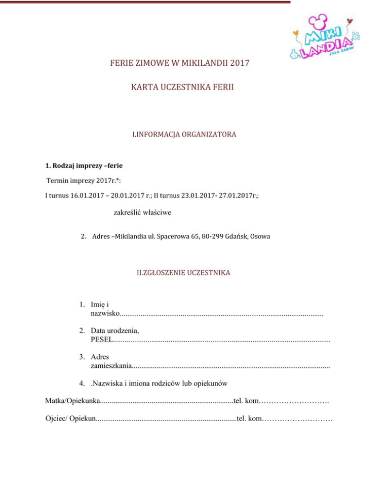 FERIE ZIMOWE W MIKILANDII 2017 KARTA UCZESTNIKA FERII I.INFORMACJA ORGANIZATORA 1. Rodzaj imprezy –ferie Termin imprezy 2017r.*: I turnus 16.01.2017 – 20.01.2017 r.; II turnus 23.01.2017- 27.01.2017r.; zakreślić właściwe 2. Adres –Mikilandia ul. Spacerowa 65, 80-299 Gdańsk, Osowa II.ZGŁOSZENIE UCZESTNIKA 1. Imię i nazwisko........................................................................................................... 2. Data urodzenia, PESEL.................................................................................................................. 3. Adres zamieszkania........................................................................................................ 4. .Nazwiska i imiona rodziców lub opiekunów Matka/Opiekunka......................................................................tel. kom………………………. Ojciec/ Opiekun..........................................................................tel. kom………………………. Zobowiązuję się do uiszczenia kosztów za ferie dziecka w wysokości …………………………. zł słownie złotych: ………………………………………………….. (miejscowość, data) (podpis matki, ojca lub opiekuna) *** Uwagi dotyczące dziecka typu (na jakie rzeczy trzeba zwracać uwagę) np. nosi okulary, alergie pokarmowe, choroby, przyjmowane leki itp. ........................................................................................................................................................................................................ ........................................................................................................................................................................................................ ........................................................................................................................................................................................................ ........................................................................................................................................................................................................ ........................................................................................................................................................................................................ ........................................................................................................................................................................................................ ........................................................................................................................................................................................................ ........................................................................................................................................................................................................ ........................................................................................................................................................................................................ ........................................................................................................................................................................................................ ........................................................................................................................................................................................................ ...................................................................................................................................................................................................... III.INFORMACJA RODZICÓW (OPIEKUNÓW) O STANIE ZDROWIA DZIECKA (np. na co dziecko jest uczulone, czy przyjmuje stałe leki i w jakich dawkach, czy nosi okulary lub aparat ortodontyczny, itp.) ……………………………………………………………………………………………………………………………………………… ……………………………………………………………………………………………………………………………………………… ……………………………………………………………………………………………………………………………………………… ……………………………………………...………………………………………………………………………………………………. Stwierdzam, że podałam(em) wszystkie znane mi informacje o dziecku, które mogą pomóc w zapewnieniu właściwej opieki dziecku w czasie trwania ferii. ZATAJENIE LUB PODANIE FAŁSZYWYCH INFORMACJI O ZDROWIU DZIECKA ZWALNIA ORGANIZATORA OD ODPOWIEDZIALNOŚCI ZA EWENTUALNE SKUTKI. (miejscowość, data) (podpis matki, ojca lub opiekuna)