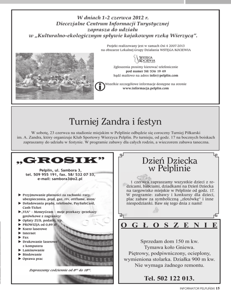 W dniach 1-2 czerwca 2012 r. Diecezjalne Centrum Informacji Turystycznej zaprasza do udziału w „Kulturalno-ekologicznym spływie kajakowym rzeką Wierzycą”. Projekt realizowany jest w ramach Osi 4 2007-2013 na obszarze Lokalnej Grupy Działania WSTÐGA KOCIEWIA Zgłoszenia prosimy kierować telefonicznie pod numer 58/ 536 19 49 bądź mailowo na adres [email protected] Wszelkie szczegółowe informacje dostępne na stronie www.informacja.pelplin.com Turniej Zandra i festyn W sobotę, 23 czerwca na stadionie miejskim w Pelplinie odbędzie się coroczny Turniej Piłkarski im. A. Zandra, który organizuje Klub Sportowy Wierzyca Pelplin. Po turnieju, od godz. 17 na bocznych boiskach zapraszamy do udziału w festynie. W programie zabawy dla całych rodzin, a wieczorem zabawa taneczna. „GROSIK” Pelplin, ul. Sambora 3, tel. 509 955 191, fax. 58/ 532 07 33, e-mail: [email protected] Przyjmowanie płatności za rachunki /raty, ubezpieczenia, prąd, gaz, rtv, oriflame, avon/ Doładowania prądu, telefonów, PaySafeCard, Cash-Ticket „VIA” – MoneyGram – moje przekazy /przekazy gotówkowe z zagranicy/ Opłaty ZUS, podatki, itp. PROWIZJA od 0,89 zł Ksero laserowe Internet Fax Drukowanie laserowe z komputera Laminowanie Bindowanie Oprawa prac Zapraszamy codziennie od 800 do 1800. Dzień Dziecka w Pelplinie 1 czerwca zapraszamy wszystkie dzieci z rodzicami, babciami, dziadkami na Dzień Dziecka na targowisko miejskie w Pelplinie od godz. 17. W programie: zabawy i konkursy dla dzieci, plac zabaw za symboliczną „złotówkę” i inne niespodzianki. Baw się tego dnia z nami! O G Ł O S Z E N I E Sprzedam dom 150 m kw. Tymawa koło Gniewa. Piętrowy, podpiwniczony, ocieplony, wymieniona stolarka. Działka 900 m kw. Nie wymaga żadnego remontu. Tel. 502 122 013. INFORMATOR PELPLIŃSKI 15