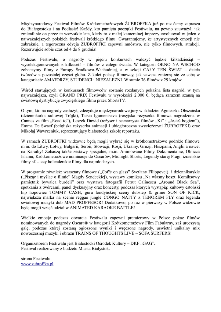 Międzynarodowy Festiwal Filmów Krótkometrażowych ŻUBROFFKA już po raz ósmy zaprasza do Białegostoku i na Podlasie! Każdy, kto pamięta początki Festiwalu, na pewno zauważył, jak zmienił się on przez te wszystkie lata, kiedy to z małej kameralnej imprezy ewoluował w jeden z najważniejszych polskich festiwali krótkiego filmu. Gwarantujemy, że artystycznych emocji nie zabraknie, a tegoroczna edycja ŻUBROFFKI zapewni mnóstwo, nie tylko filmowych, atrakcji. Rezerwujcie sobie czas od 4 do 8 grudnia! Podczas Festiwalu, o nagrody w pięciu konkursach walczyć będzie kilkadziesiąt – wyselekcjonowanych z kilkuset! – filmów z całego świata. W kategorii OKNO NA WSCHÓD zobaczymy filmy z Europy Środkowo-Wschodniej, a w sekcji CAŁY TEN ŚWIAT – dzieła twórców z pozostałej części globu. Z kolei polscy filmowcy, jak zawsze zmierzą się ze sobą w kategoriach: AMATORZY, STUDENCI i NIEZALEŻNI. W sumie 76 filmów z 29 krajów. Wśród startujących w konkursach filmowców zostanie rozdanych pokaźna lista nagród, w tym najważniejsza, czyli GRAND PRIX Festiwalu w wysokości 2.000 €, będąca zarazem szansą na światową dystrybucję zwycięskiego filmu przez ShortsTV. O tym, kto na nagrody zasłużył, zdecyduje międzynarodowe jury w składzie: Agnieszka Obszańska (dziennikarka radiowej Trójki), Taisia Igumentseva (rosyjska reżyserka filmowa nagrodzona w Cannes za film „Road to”), Leszek Dawid (reżyser i scenarzysta filmów „Ki” i „Jesteś bogiem”), Emma De Swaef (belgijska reżyserka animacji i ubiegłoroczna zwyciężczyni ŻUBROFFKI) oraz Mikołaj Wawrzeniuk, reprezentujący białostocką szkołę reportażu. W ramach ŻUBROFFKI widzowie będą mogli wybrać się w krótkometrażowe podróże filmowe m.in. do Litwy, Łotwy, Bułgarii, Serbii, Słowacji, Rosji, Ukrainy, Gruzji, Hiszpanii, Anglii a nawet na Karaiby! Zobaczą także zestawy specjalne, m.in. Animowane Filmy Dokumentalne, Oblicza Islamu, Krótkometrażowe nominacje do Oscarów, Midnight Shorts, Legendy starej Pragi, izraelskie filmy sf… czy holenderskie filmy dla najmłodszych. W programie również: warsztaty filmowe („Coffe on glass” Svetłany Filippovej) i dziennikarskie („Pisząc i myśląc o filmie” Magdy Sendeckiej), wystawy komiksu „Na własny koszt. Komiksowy pamiętnik bywalca burdeli” oraz wystawa fotografii Petrut Calinescu „Around Black Sea”, spotkania z twórcami, panel dyskusyjny oraz koncerty, podczas których wystąpią: kultowy estoński hip hopowiec TOMMY CASH, guru londyńskiej sceny dubstep & grime SON OF KICK, największa marka na scenie reggae jungle CONGO NATTY z TENOREM FLY oraz legenda światowej muzyki dub MAD PROFFESOR! Dodatkowo, po raz w pierwszy w Polsce widzowie będą mogli wziąć udział w ANIMATED KARAOKE BATTLE! Wielkie emocje podczas otwarcia Festiwalu zapewni premierowy w Polsce pokaz filmów nominowanych do nagrody Oscara® w kategorii Krótkometrażowy Film Fabularny, zaś uroczystą galę, podczas której zostaną ogłoszone wyniki i wręczone nagrody, uświetni unikalny mix nowoczesnej muzyki i obrazu TRAINS OF THOUGHTS LIVE – SOFA SURFERS! Organizatorem Festiwalu jest Białostocki Ośrodek Kultury – DKF „GAG”. Festiwal realizowany z budżetu Miasta Białystok. strona Festiwalu: www.zubroffka.pl