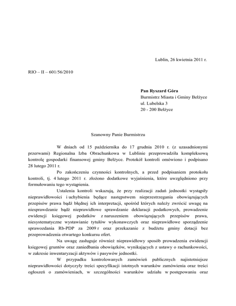 Lublin, 26 kwietnia 2011 r. RIO – II – 601/56/2010 Pan Ryszard Góra Burmistrz Miasta i Gminy Bełżyce ul. Lubelska 3 20 - 200 Bełżyce Szanowny Panie Burmistrzu W dniach od 15 października do 17 grudnia 2010 r. (z uzasadnionymi przerwami) Regionalna Izba Obrachunkowa w Lublinie przeprowadziła kompleksową kontrolę gospodarki finansowej gminy Bełżyce. Protokół kontroli omówiono i podpisano 28 lutego 2011 r. Po zakończeniu czynności kontrolnych, a przed podpisaniem protokołu kontroli, tj. 4 lutego 2011 r. złożono dodatkowe wyjaśnienia, które uwzględniono przy formułowaniu tego wystąpienia. Ustalenia kontroli wskazują, że przy realizacji zadań jednostki wystąpiły nieprawidłowości i uchybienia będące następstwem nieprzestrzegania obowiązujących przepisów prawa bądź błędnej ich interpretacji, spośród których należy zwrócić uwagę na niesprawdzanie bądź nieprawidłowe sprawdzanie deklaracji podatkowych, prowadzenie ewidencji księgowej podatków z naruszeniem obowiązujących przepisów prawa, niesystematyczne wystawianie tytułów wykonawczych oraz nieprawidłowe sporządzenie sprawozdania Rb-PDP za 2009 r oraz przekazanie z budżetu gminy dotacji bez przeprowadzenia otwartego konkursu ofert. Na uwagę zasługuje również nieprawidłowy sposób prowadzenia ewidencji księgowej gruntów oraz zaniedbania obowiązków, wynikających z ustawy o rachunkowości, w zakresie inwentaryzacji aktywów i pasywów jednostki. W przypadku kontrolowanych zamówień publicznych najistotniejsze nieprawidłowości dotyczyły treści specyfikacji istotnych warunków zamówienia oraz treści ogłoszeń o zamówieniach, w szczególności warunków udziału w postępowaniu oraz 2 dokumentów żądanych od wykonawców na potwierdzenie ich spełniania. Zaniepokojenie budzi ujawnienie nieprawidłowości, będących przedmiotem wniosków pokontrolnych o nr 2.3. (w części), 4.19., 5.10., 6.2., 6.4. zawartych w wystąpieniu Nr RIO – II – 60/84/2006 z 5 lutego 2007 r., mimo udzielenia odpowiedzi o ich wykonaniu. W odniesieniu do nieprawidłowości wyeliminowanych w trakcie kontroli – po udzieleniu przez kontrolujących stosownego instruktażu lub o incydentalnym charakterze – nie formułowano wniosków pokontrolnych. Poniżej podaję stwierdzone nieprawidłowości i uchybienia oraz wnioski co do sposobu ich wyeliminowania, stosownie do przepisów art. 9 ust. 2 ustawy z dnia 7 października 1992 r. o regionalnych izbach obrachunkowych (Dz. U. z 2001 r. Nr 55, poz. 577 z późn. zm.). W załączniku do wystąpienia pokontrolnego wskazuję osoby odpowiedzialne za stwierdzone nieprawidłowości. 1. W zakresie księgowości i sprawozdawczości 1.1. Nieprawidłowe opracowanie dokumentacji opisującej przyjęte w Urzędzie Miejskim zasady (politykę) rachunkowości, w wyniku: - nieokreślenia roku obrotowego i wchodzących w jego skład okresów sprawozdawczych, - nieustalenia metod wyceny aktywów i pasywów, - niesporządzenia wykazu ksiąg rachunkowych, w tym wykazu zbiorów danych tworzących księgi rachunkowe na informatycznych nośnikach danych, - niesporządzenia opisu systemu informatycznego służącego przetwarzaniu danych, w tym nieopisania działania opcji, służącej do obliczania skutków obniżenia górnych stawek w podatku rolnym, leśnym, od nieruchomości oraz od środków transportowych, stanowiących podstawę sporządzenia sprawozdania Rb-PDP „Roczne sprawozdanie z wykonania dochodów podatkowych gminy”, - nieokreślenia wersji oprogramowania i daty rozpoczęcia jego eksploatacji, - nieokreślenia zasad umarzania (okresu lub stawki i metody amortyzacji) środków trwałych oraz wartości niematerialnych i prawnych. Uzupełnić obowiązującą w Urzędzie Miejskim dokumentację opisującą przyjęte zasady (politykę) rachunkowości, przez: - określenie roku obrotowego i wchodzących w jego skład okresów sprawozdawczych, - ustalenie metod wyceny aktywów i pasywów, - sporządzenie kompletnego wykazu ksiąg rachunkowych, a przy ich prowadzeniu przy użyciu komputera – wykazu zbiorów danych tworzących księgi rachunkowe na informatycznych nośnikach danych z określeniem ich struktury, wzajemnych powiązań oraz ich funkcji w organizacji całości ksiąg rachunkowych i w procesach 3 przetwarzania danych, - sporządzenie opisu systemu informatycznego, zawierającego wykaz programów, procedur lub funkcji, w zależności od struktury oprogramowania, wraz z opisem algorytmów i parametrów oraz programowych zasad ochrony danych, w tym w szczególności metod zabezpieczenia dostępu do danych i systemu ich przetwarzania oraz określenie aktualnej wersji oprogramowania i daty rozpoczęcia jego eksploatacji, stosownie do przepisów art. 10 ust. 1 ustawy z dnia 29 września 1994 r. o rachunkowości (Dz. U. z 2009 r. Nr 152, poz. 1223 z późn. zm.). W przyjętych zasadach (polityce) rachunkowości określić zasady dokonywania odpisów amortyzacyjnych lub umorzeniowych środków trwałych oraz wartości niematerialnych i prawnych, pamiętając, że jednostka – przy ustalaniu tych zasad – może przyjąć stawki określone w przepisach o podatku dochodowym od osób prawnych albo stawki określone przez burmistrza Bełżyc; jednostki zwolnione z podatku dochodowego od osób prawnych mogą umarzać i amortyzować środki trwałe oraz wartości niematerialne i prawne jednorazowo za okres całego roku, a rozpoczęcie dokonywania odpisów amortyzacyjnych lub umorzeniowych może nastąpić nie wcześniej niż po przyjęciu ich do używania, stosownie do przepisów art. 32 ust. 1 i 3 oraz art. 33 ust. 1 ustawy o rachunkowości i przepisów § 6 ust. 2 i § 9 ust. 1 rozporządzenia Ministra Finansów z dnia 5 lipca 2010 r. w sprawie szczególnych zasad rachunkowości oraz planów kont dla budżetu państwa, budżetów jednostek samorządu terytorialnego, jednostek budżetowych, samorządowych zakładów budżetowych, państwowych funduszy celowych or