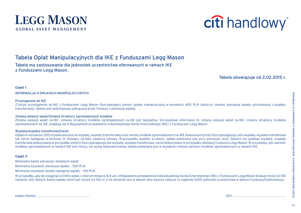 Tabela Opłat Manipulacyjnych dla IKE z Funduszami Legg Mason Tabela ma zastosowanie dla jednostek uczestnictwa oferowanych w ramach IKE z Funduszami Legg Mason. Tabela obowiązuje od 2.02.2015 r. INFORMACJA O OPŁATACH MANIPULACYJNYCH: Przystąpienie do IKE Z tytułu przystąpienia do IKE z Funduszami Legg Mason Oszczędzający ponosi opłatę manipulacyjną w wysokości 400 PLN (dotyczy również pierwszej wpłaty pochodzącej z wypłaty transferowej). Opłata jest jednorazowa, potrącana przez Fundusz z pierwszej wpłaty. Zmiana alokacji wpłat/Zmiana struktury zgromadzonych środków Zmiana alokacji wpłat na IKE i zmiana struktury środków zgromadzonych na IKE jest bezpłatna. Szczegółowe informacje nt. zmiany alokacji wpłat na IKE i zmiany struktury środków zgromadzonych na IKE znajdują się w Regulaminie prowadzenia Indywidualnego Konta Emerytalnego (IKE) z Funduszami Legg Mason. Wypłata/wypłata transferowa/zwrot Opłata w wysokości 200 zł pobierana jest od wypłaty, wypłaty transferowej oraz zwrotu środków zgromadzonych na IKE dokonanych przez Oszczędzającego, jeśli wypłata, wypłata transferowa lub zwrot następuje w terminie 12 miesięcy od daty zawarcia Umowy. W przypadku wypłaty w ratach, opłata pobierana jest przy pierwszej racie. Opłacie nie podlega wypłata, wypłata transferowa dokonywana w przypadku śmierci Oszczędzającego lub wypłata, wypłata transferowa, zwrot dokonywane w przypadku likwidacji Funduszu Legg Mason. W przypadku, gdy wartość środków zgromadzonych w ramach IKE jest niższa, niż wyżej wskazana kwota, opłata pobierana jest w wysokości równej wartości środków zgromadzonych w ramach IKE. Część II Minimalne kwoty pierwszej i kolejnych wpłat: Minimalna wysokość pierwszej wpłaty – 500 PLN Minimalna wysokość każdej następnej wpłaty – 100 PLN W przypadku, gdy do osiągnięcia limitu wpłat, o którym mowa w § 4 ust. 4 Regulaminu prowadzenia Indywidualnego Konta Emerytalnego (IKE) z Funduszami Legg Mason brakuje mniej niż 100 (słownie: sto) złotych, kwota wpłaty może być niższa niż 100 zł, o ile umożliwi ona w danym dniu wyceny nabycie co najmniej 0,001 jednostki uczestnictwa w danym Funduszu/Subfunduszu. podpis Klienta ....................................................................................................... (SV) ....................................................................................................... 02.2015. Bank Handlowy w Warszawie S.A., Sektor Bankowości Detalicznej, ul. Goleszowska 6, 01-249 Warszawa Część I 1/2 POBIERANE PRZEZ TOWARZYSTWO WYNAGRODZENIE ZA ZARZĄDZANIE Legg Mason Subfundusz Akcji Legg Mason Subfundusz Strateg Legg Mason Subfundusz Obligacji Legg Mason Subfundusz Pieniężny Legg Mason Senior FIO Jednostki uczestnictwa kategorii A 3,50% 3,50% 1,50% 0,80% 2,50% Jednostki uczestnictwa kategorii V 2,50% 2,50% 1,00% 0,80% 1,50% Jednostki uczestnictwa kategorii S 1,30% 1,20% 0,50% 0,40% 1,00% INFORMACJA O WYNAGRODZENIU BANKU: Bank otrzymuje od wszystkich Funduszy oferowanych przez Bank wynagrodzenie w wysokości 100% opłaty manipulacyjnej od każdego wykonanego Zlecenia nabycia, konwersji/zamiany Tytułów Uczestnictwa (jeżeli opłaty są pobierane) oraz 43%–62% od wysokości pobieranego przez dane Towarzystwo wynagrodzenia za zarządzanie, przy czym dla większości Funduszy stawka wynosi 60-62%. Powyższy udział w opłatach pokrywa bieżące koszty i stanowi wynagrodzenie Banku z tytułu świadczenia przez Bank na rzecz Towarzystwa czynności przyjmowania i przekazywania zleceń nabywania i odkupywania tytułów uczestnictwa w funduszach inwestycyjnych oraz innych oświadczeń woli. Dodatkowe szczegóły na temat wynagrodzenia uzyskiwanego przez Bank z tytułu świadczenia na rzecz Towarzystwa czynności przyjmowania i przekazywania zleceń nabywania i odkupywania oraz przekazywania innych oświadczeń woli dotyczących jednostek uczestnictwa są dostępne u Opiekuna Klienta w Oddziale. Opłaty określone w Tabeli Opłat są stosowane przy zbywaniu Jednostek Uczestnictwa zapisywanych na rejestrach otwartych za pośrednictwem Banku Handlowego w Warszawie S.A. Produkty inwestycyjne są dostępne wyłącznie dla posiadaczy Konta Osobistego Citibank. Inwestycje w fundusze inwestycyjne nie są zobowiązaniem ani nie są gwarantowane przez Bank Handlowy w Warszawie S.A. ani żaden z podmiotów powiązanych lub zależnych. Jednostki uczestnictwa funduszy nie są depozytem bankowym. Inwestycje w jednostki uczestnictwa funduszy nie są gwarantowane przez Skarb Państwa, Bankowy Fundusz Gwarancyjny lub jakiekolwiek inne instytucje rządowe. Produkty inwestycyjne są obarczone ryzykiem inwestycyjnym włącznie z możliwością utraty kapitału. Dotychczasowe wyniki funduszy inwestycyjnych, indeksów giełdowych oraz kursów walut, od których zależy rentowność inwestycji, nie stanowią gwarancji ich przyszłych wyników. Przed podjęciem decyzji o zainwestowaniu w fundusz należy zapoznać się z Prospektem Informacyjnym Funduszu, zawierającym w szczególności informacje o czynnikach wpływających na rentowność inwestycji, w tym czynnikach ryzyka. Zasady realizacji zleceń określone są w Statutach Funduszy. Prospekty Informacyjne Funduszy dostępne są w oddziałach Banku oraz na stronie www.online.citibank.pl Imię i nazwisko Klienta ....................................................................................................... PESEL ............................................................................................................................ GRB ....................................................................................................... Data ......................................................................................................................................................... podpis Klienta ....................................................................................................... (SV)